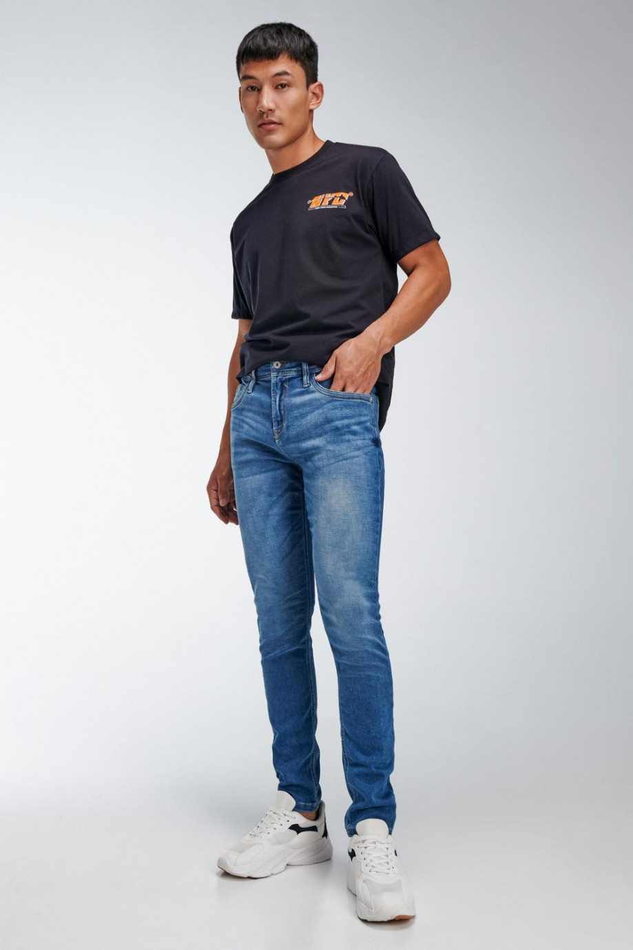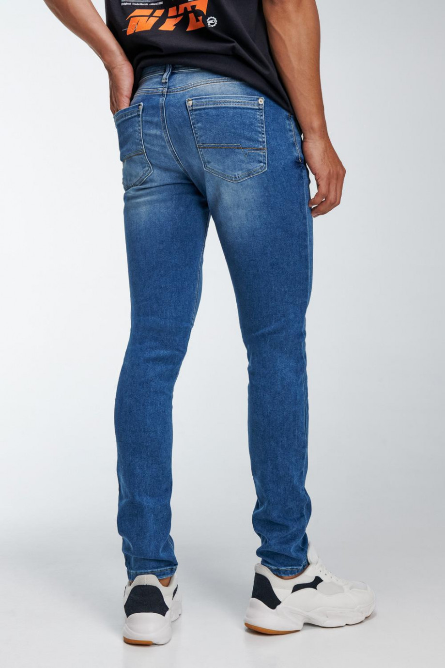 Jean para hombre, 5 bolsillos, tiro bajo ajuste ceñido con lavado claro.