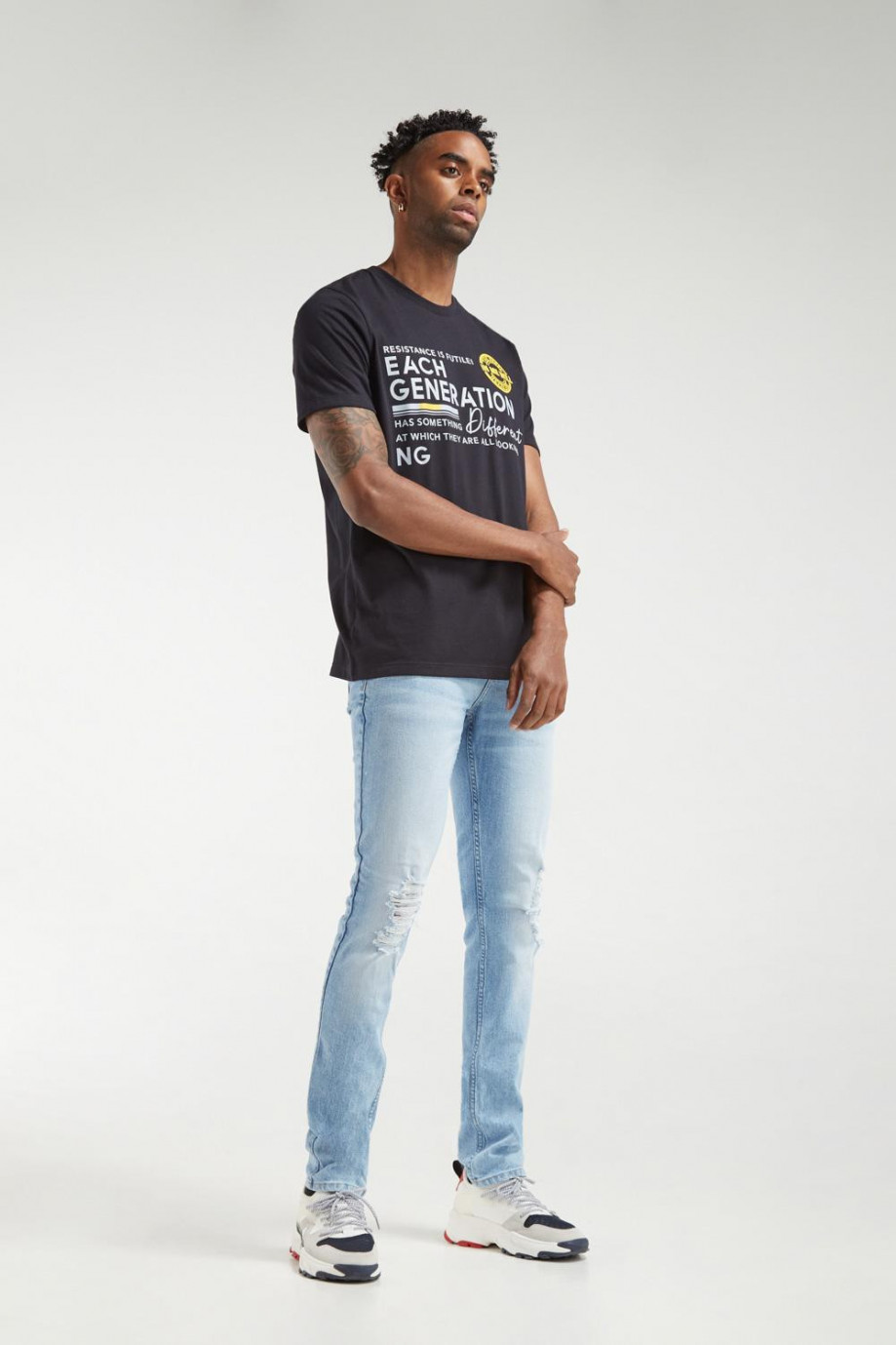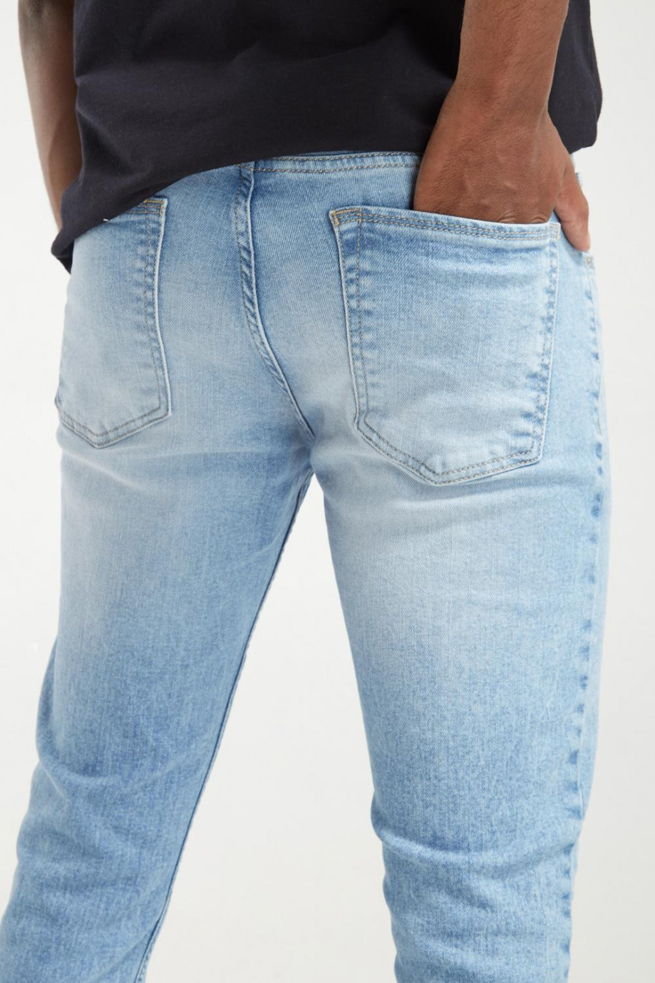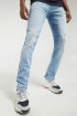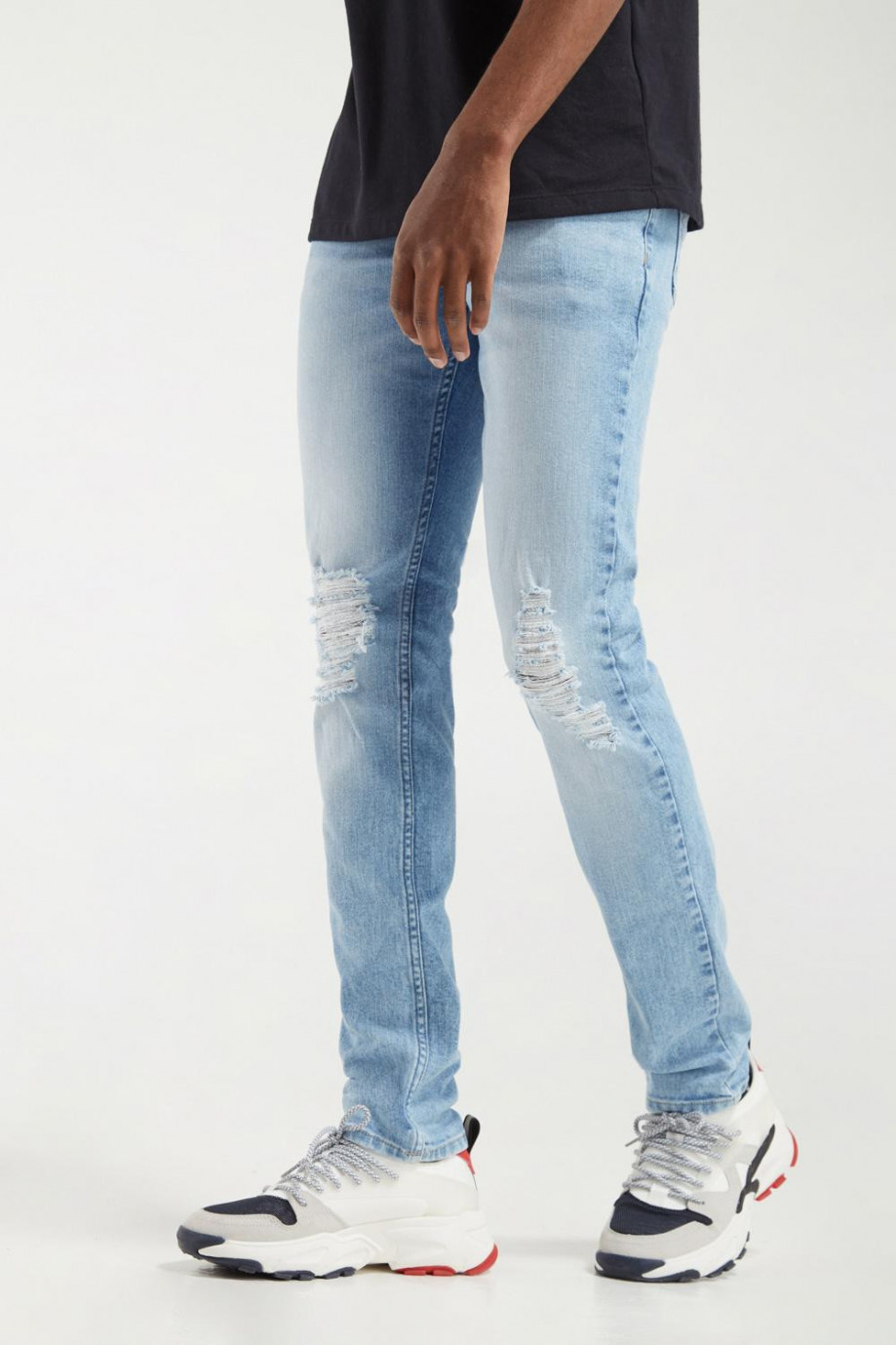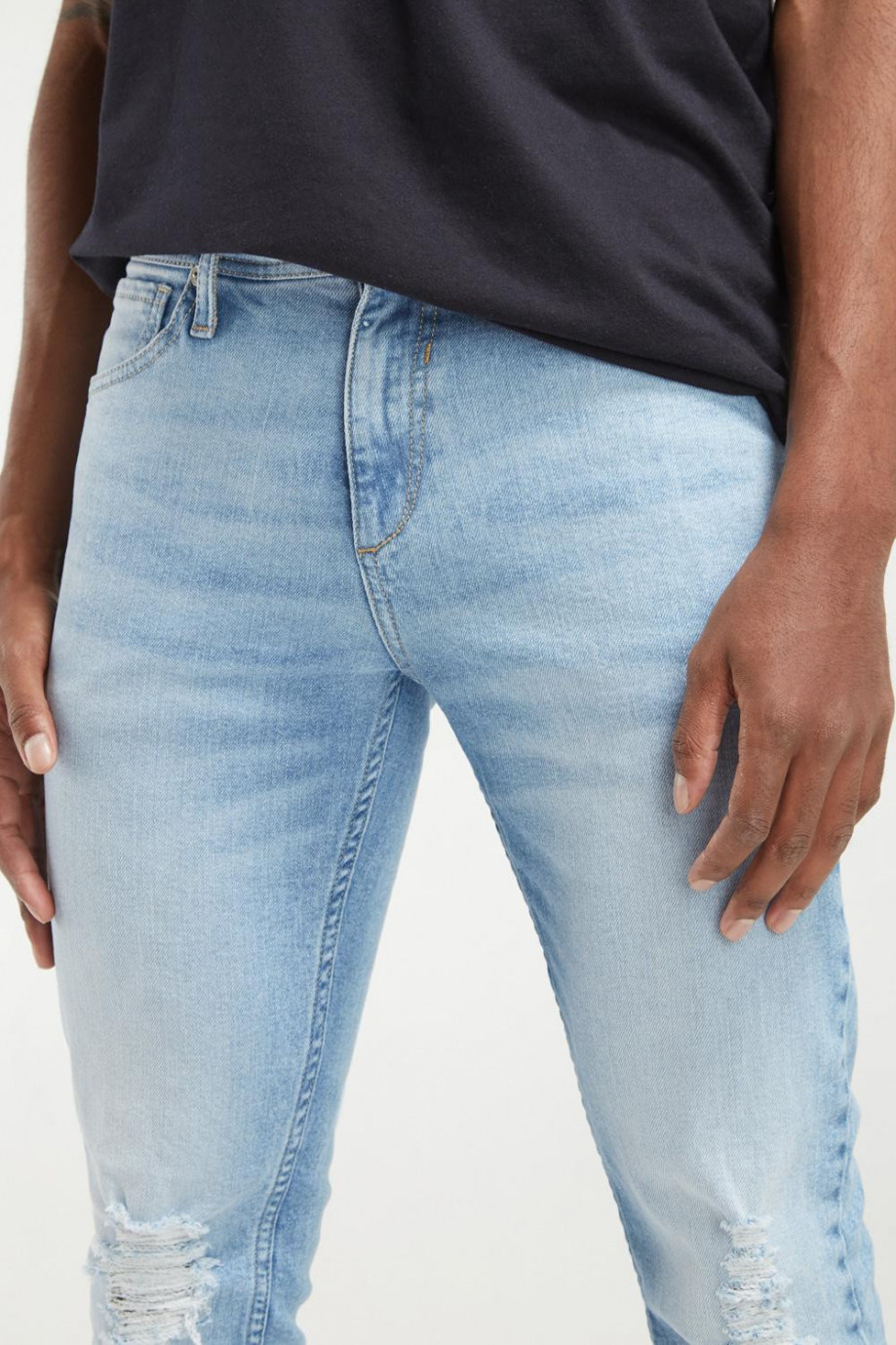 Jean para hombre, 5 bolsillos, tiro bajo, ajuste ceñido con lavado muy claro y rotos.