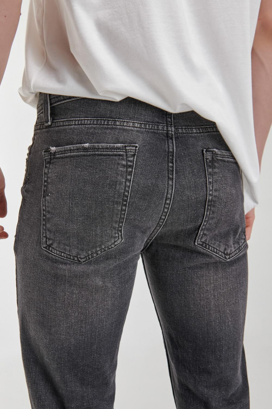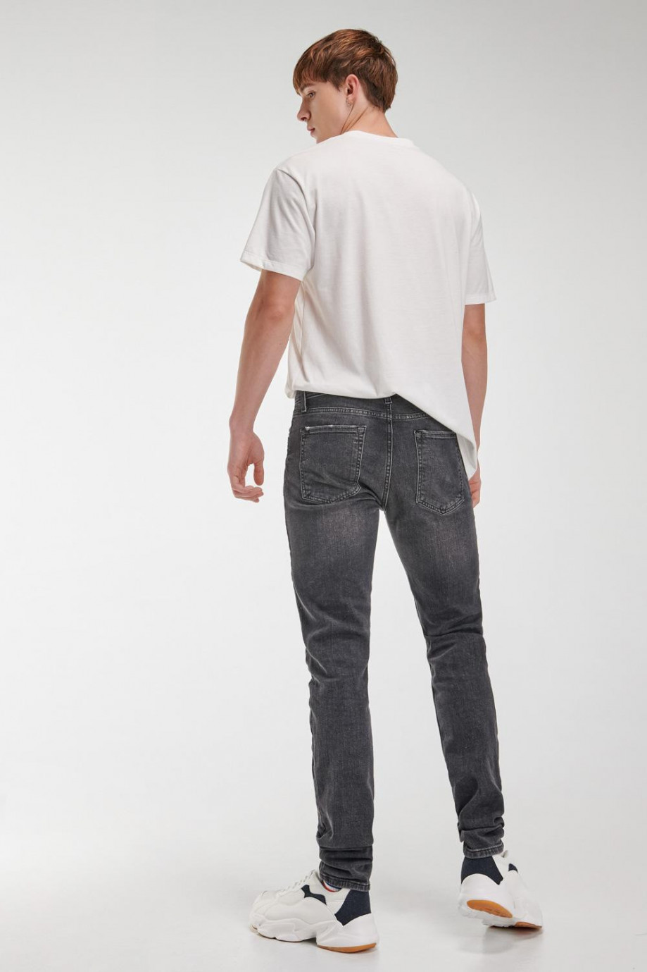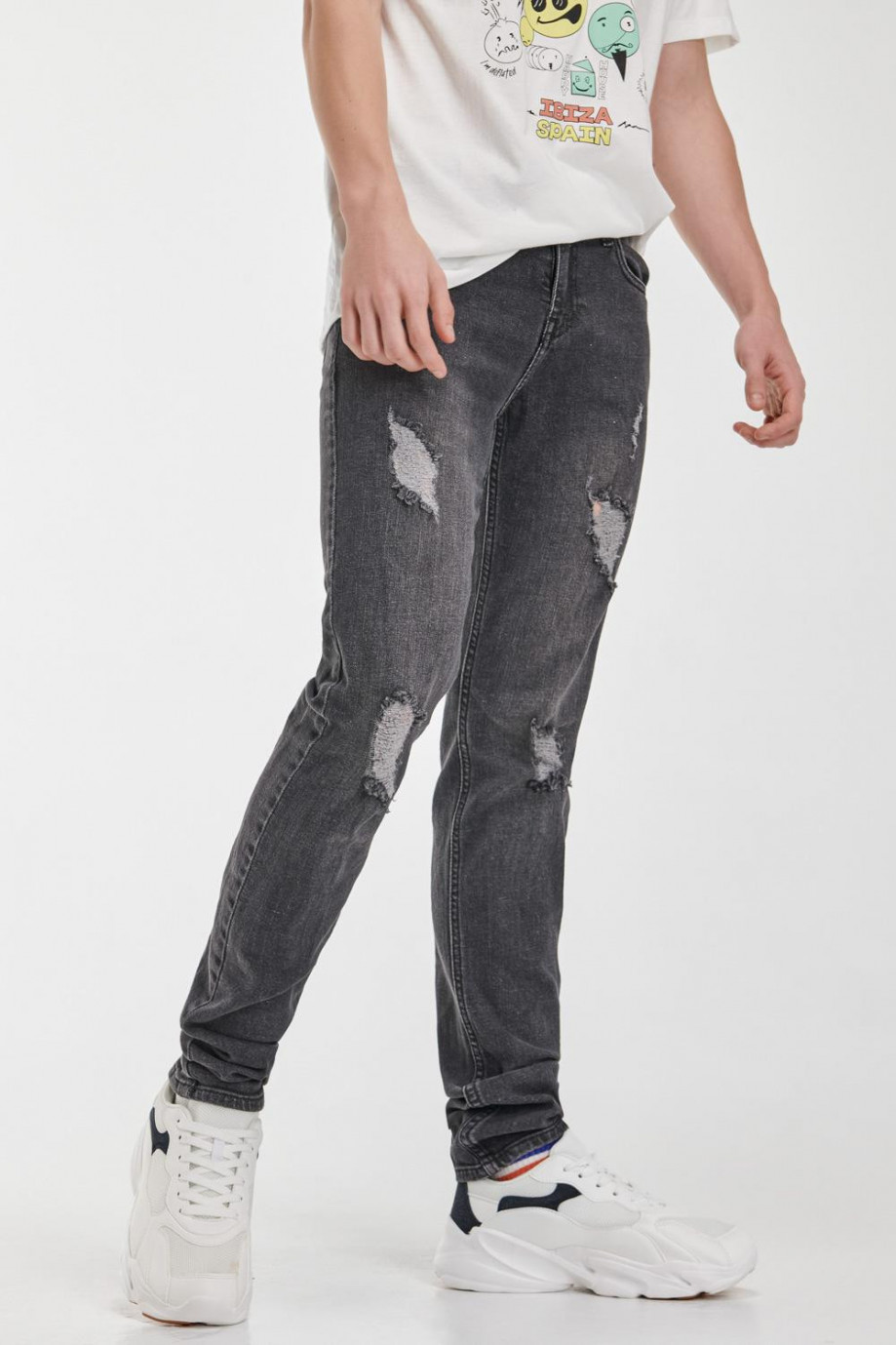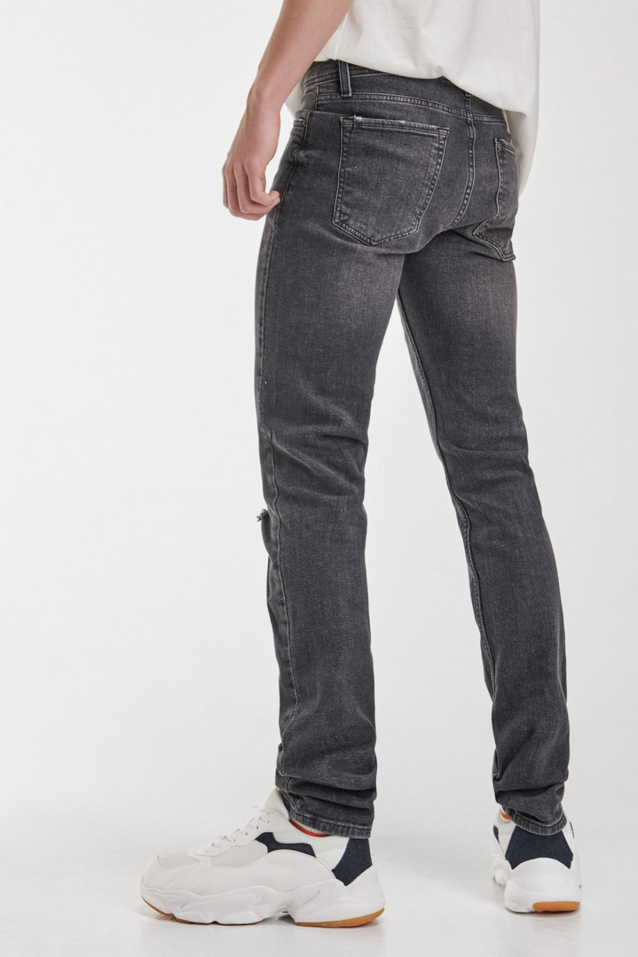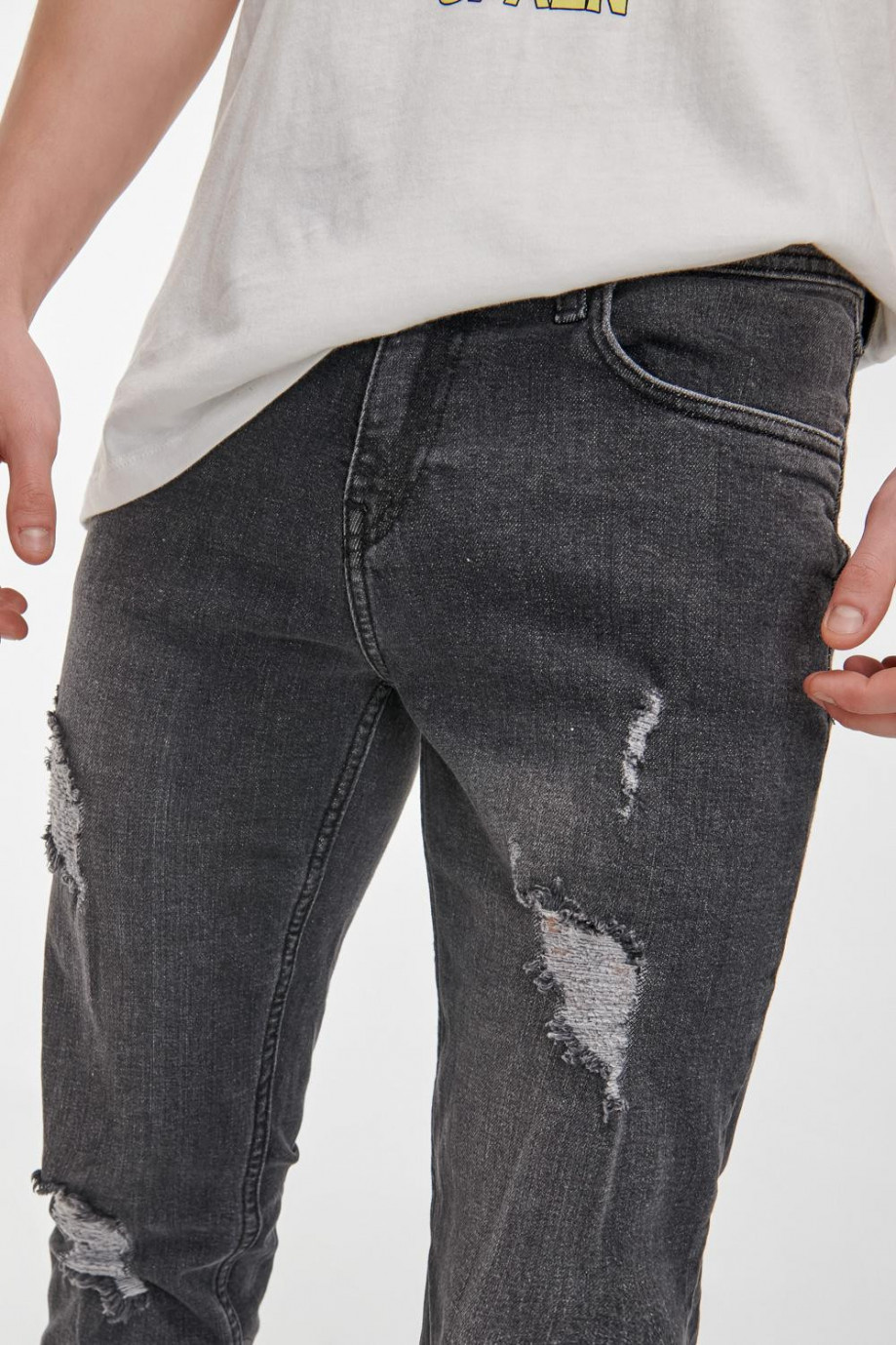 Jean para hombre, 5 bolsillos, tiro bajo, ajuste ceñido con lavado gris y rotos