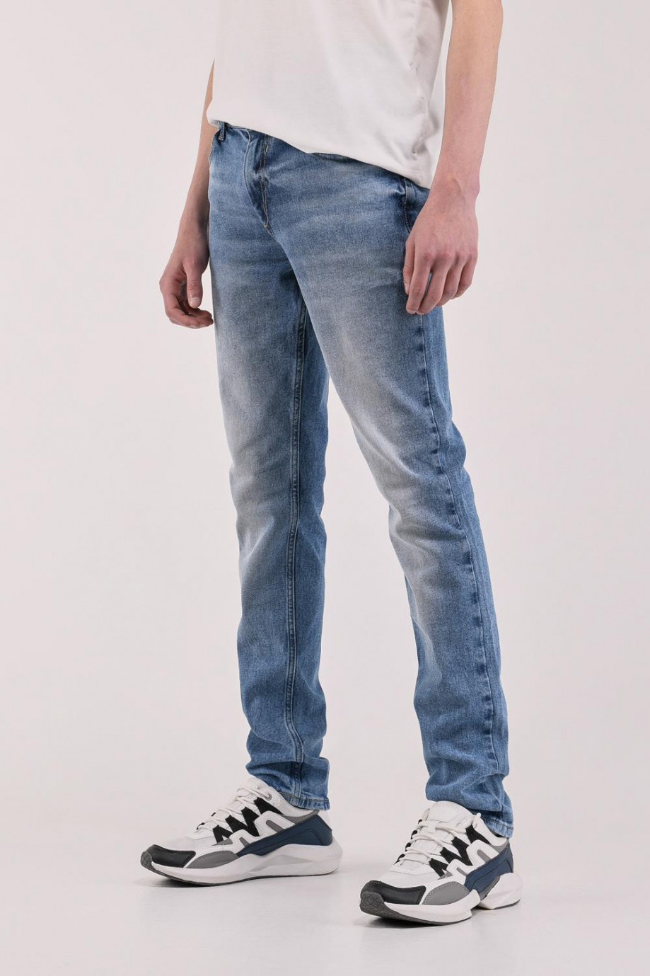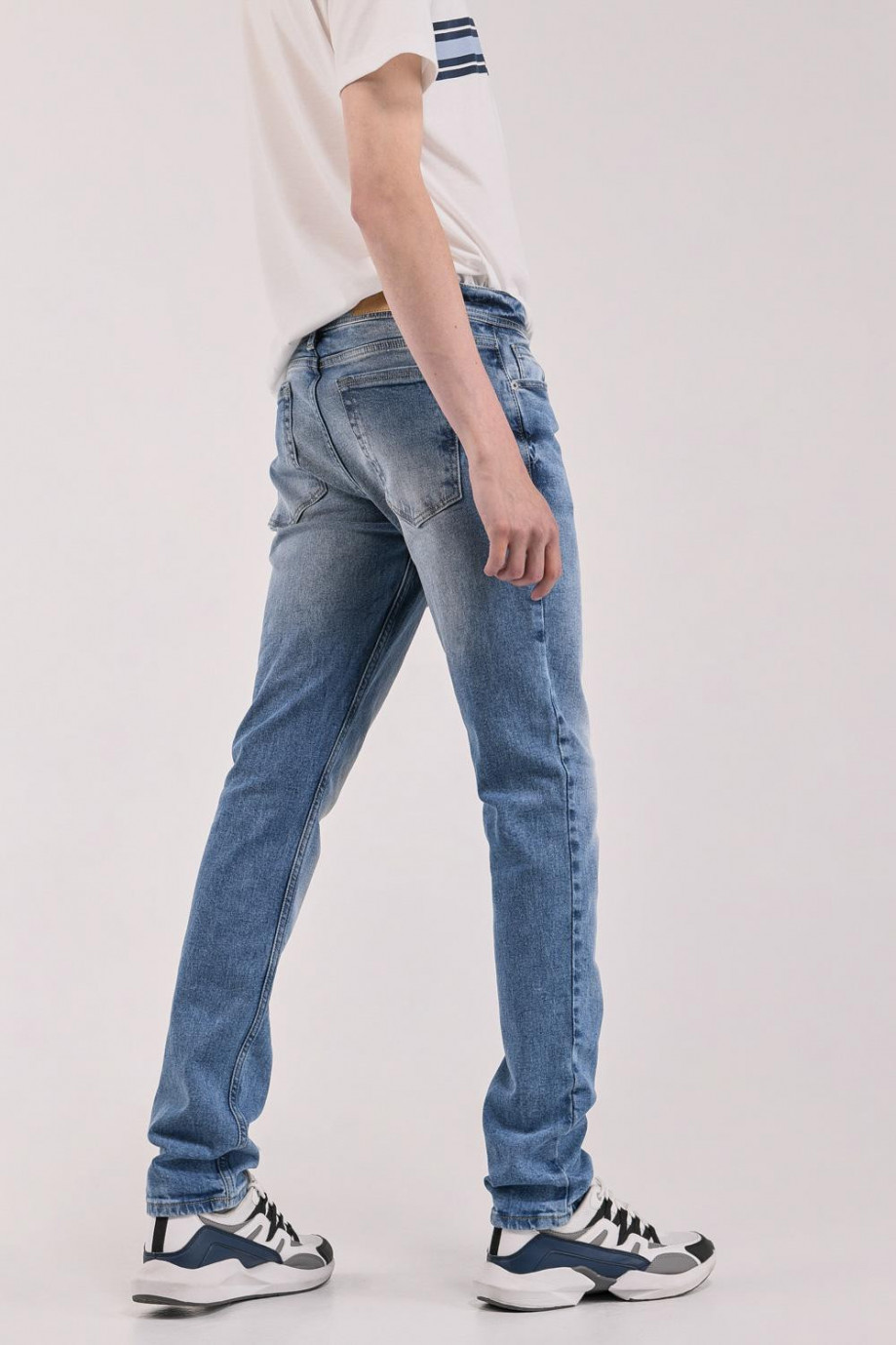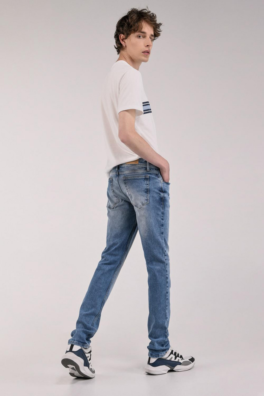 Jean para hombre, 5 bolsillos, tiro bajo, ajuste ceñido con lavado muy claro