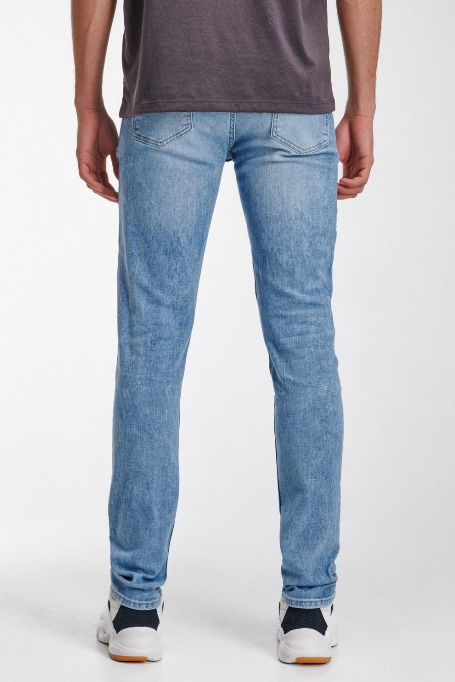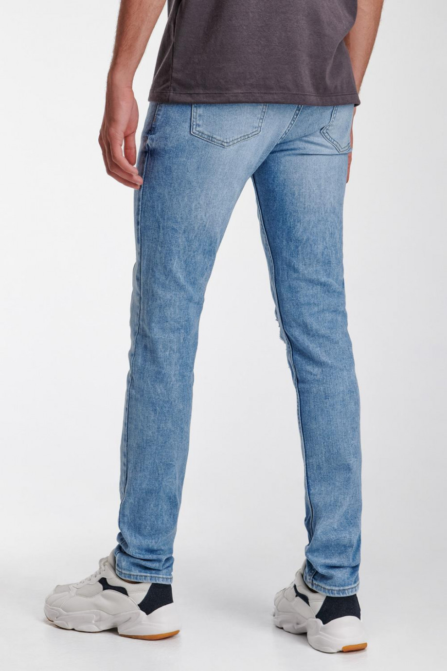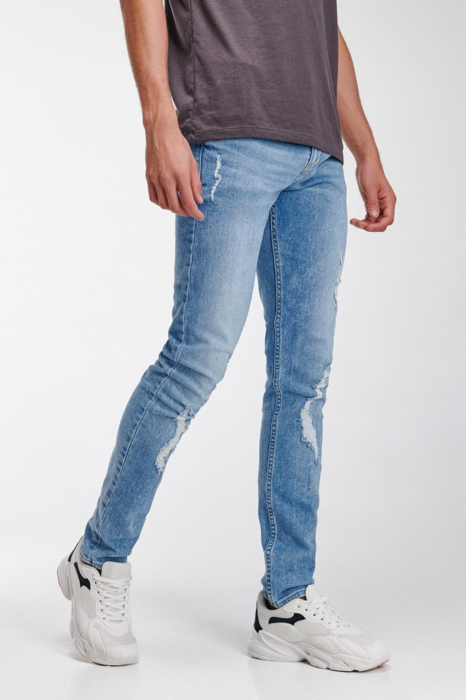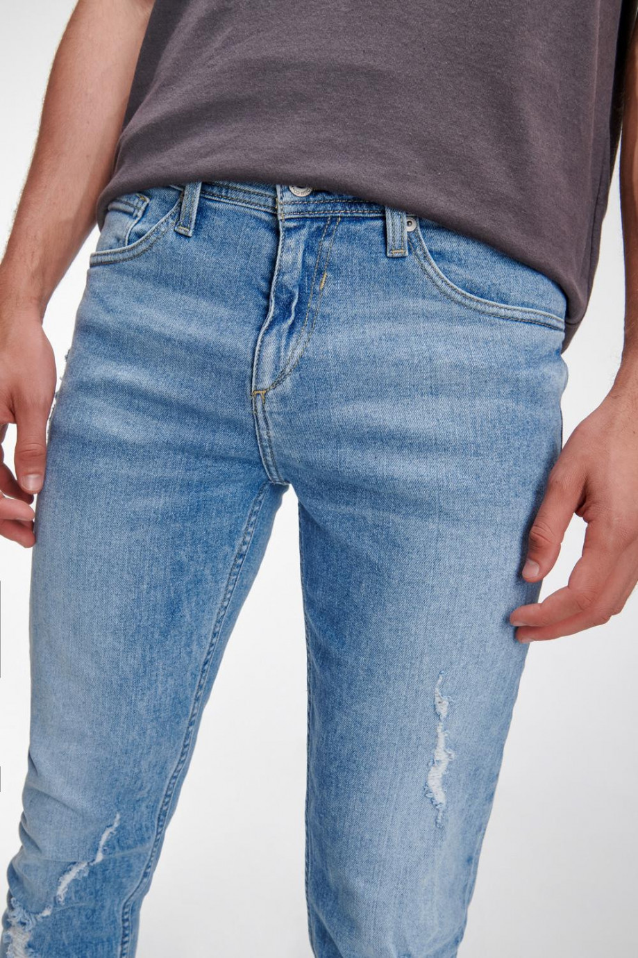 Jean para hombre, 5 bolsillos, tiro bajo, ajuste ceñido con lavado muy claro y rotos.