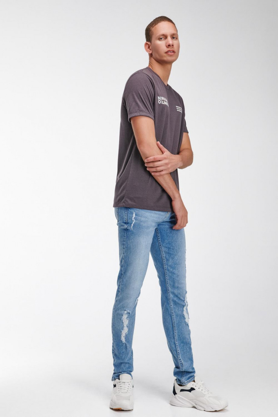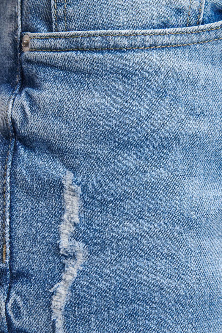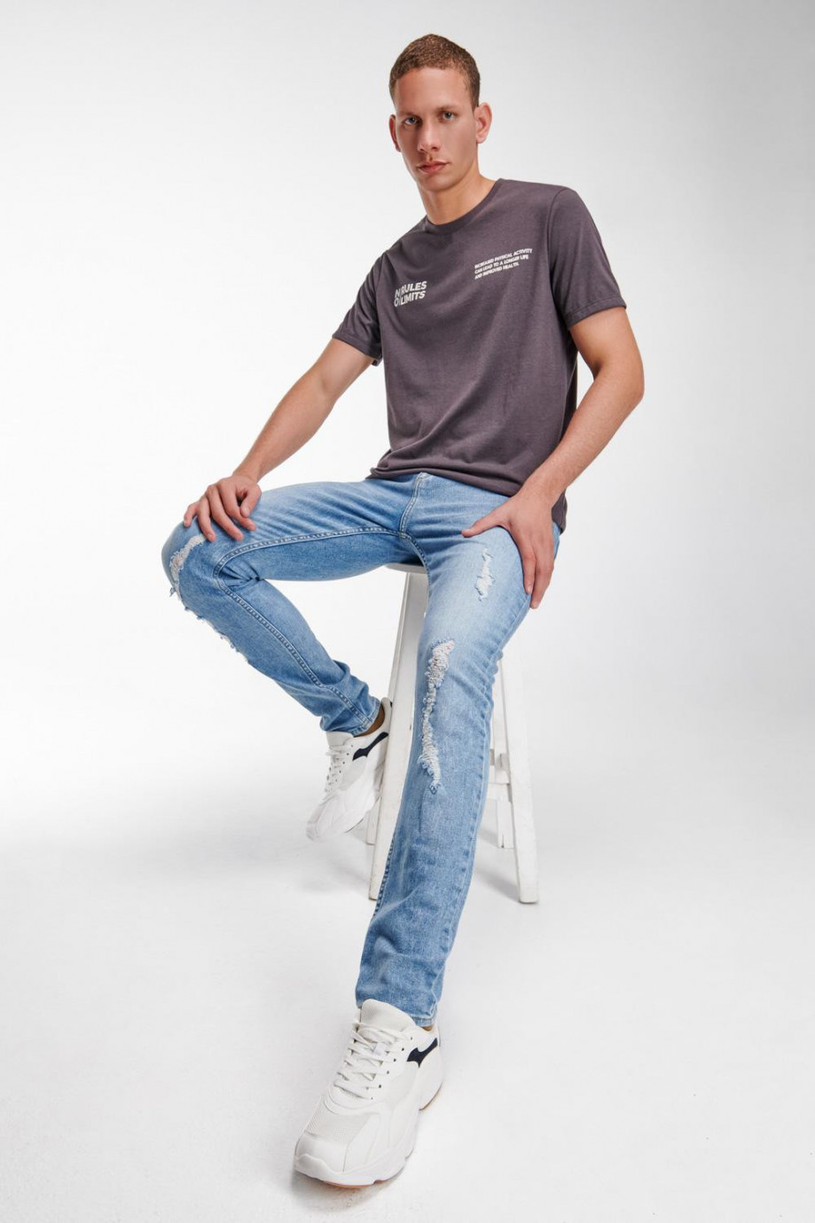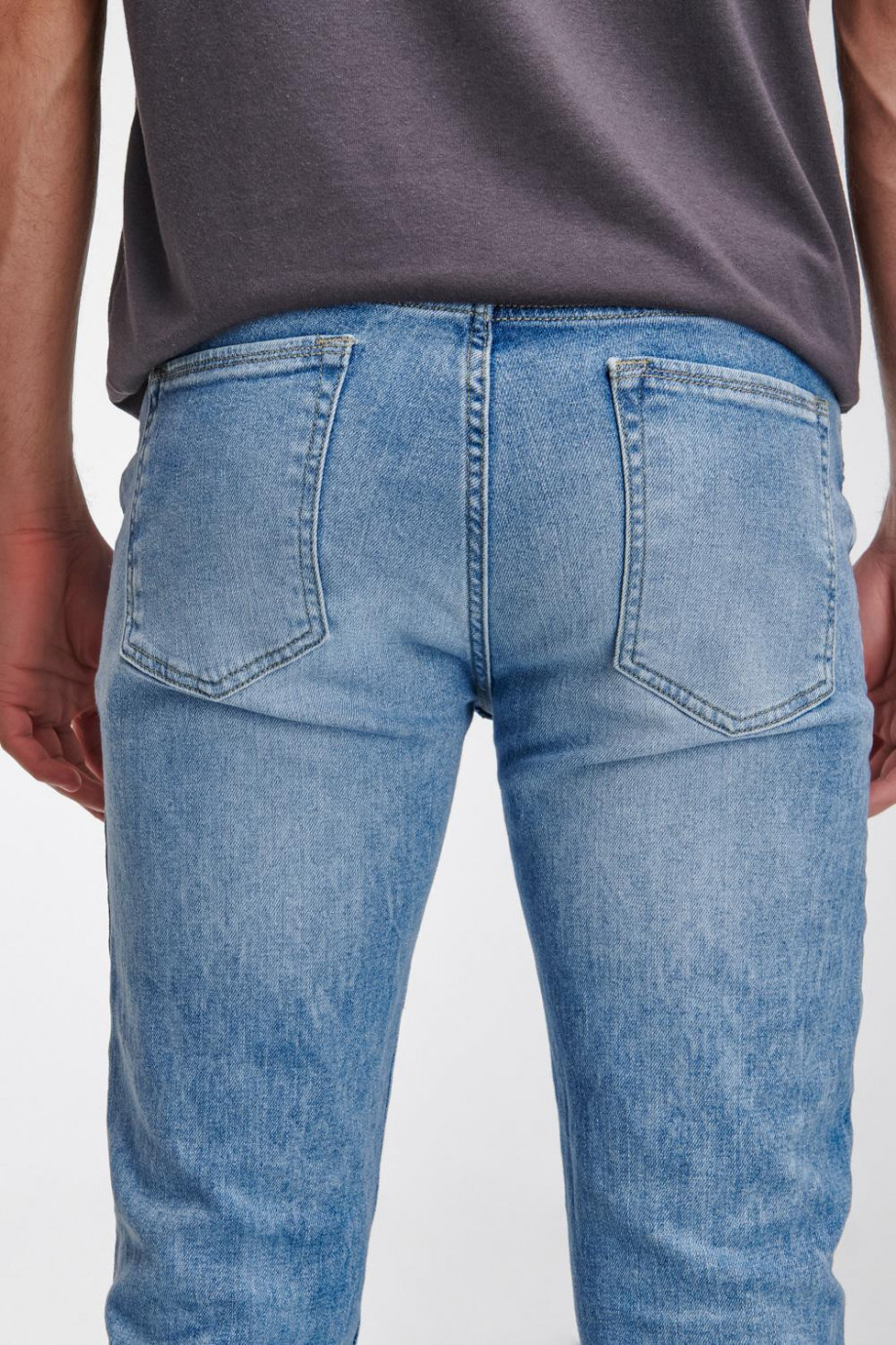 Jean para hombre, 5 bolsillos, tiro bajo, ajuste ceñido con lavado muy claro y rotos.