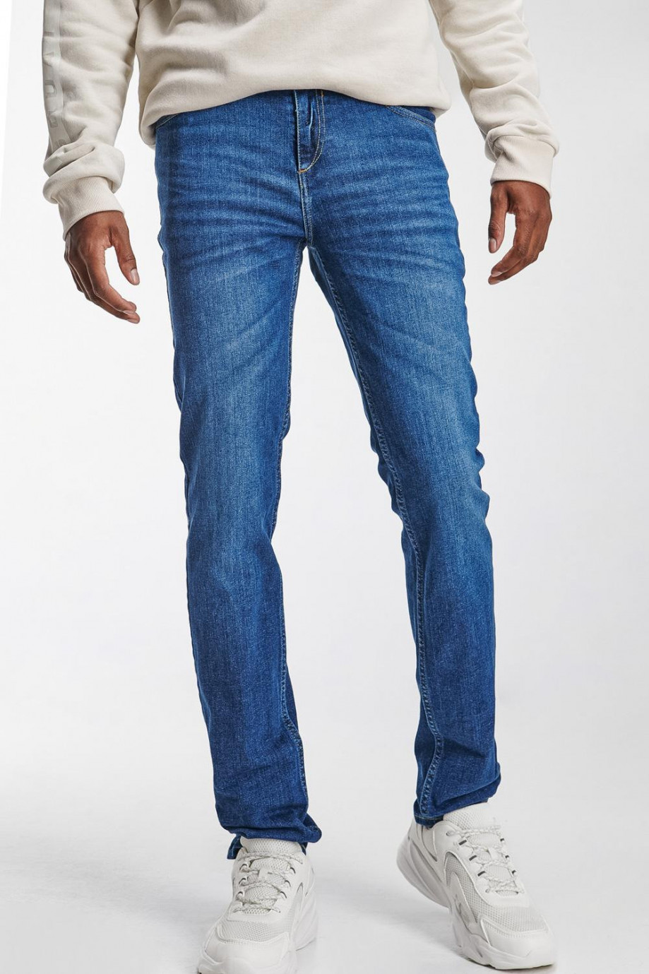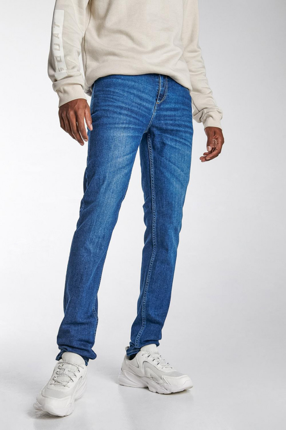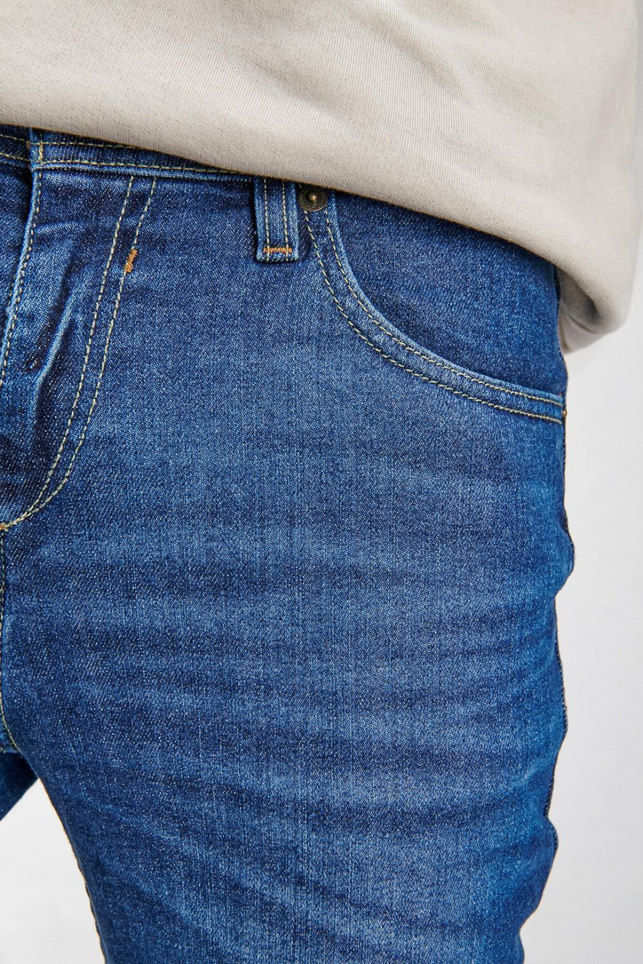 Jean para hombre, 5 bolsillos, tiro bajo, ajuste ceñido con lavado medio.