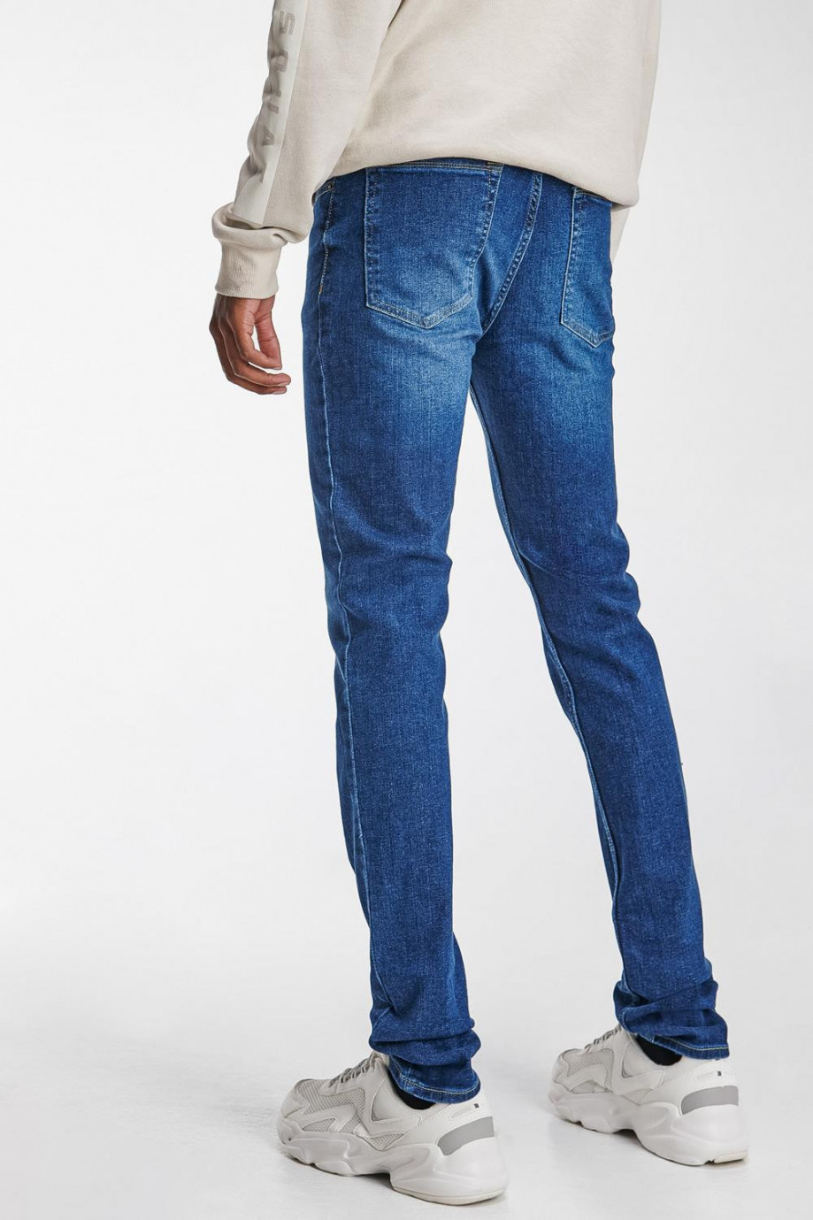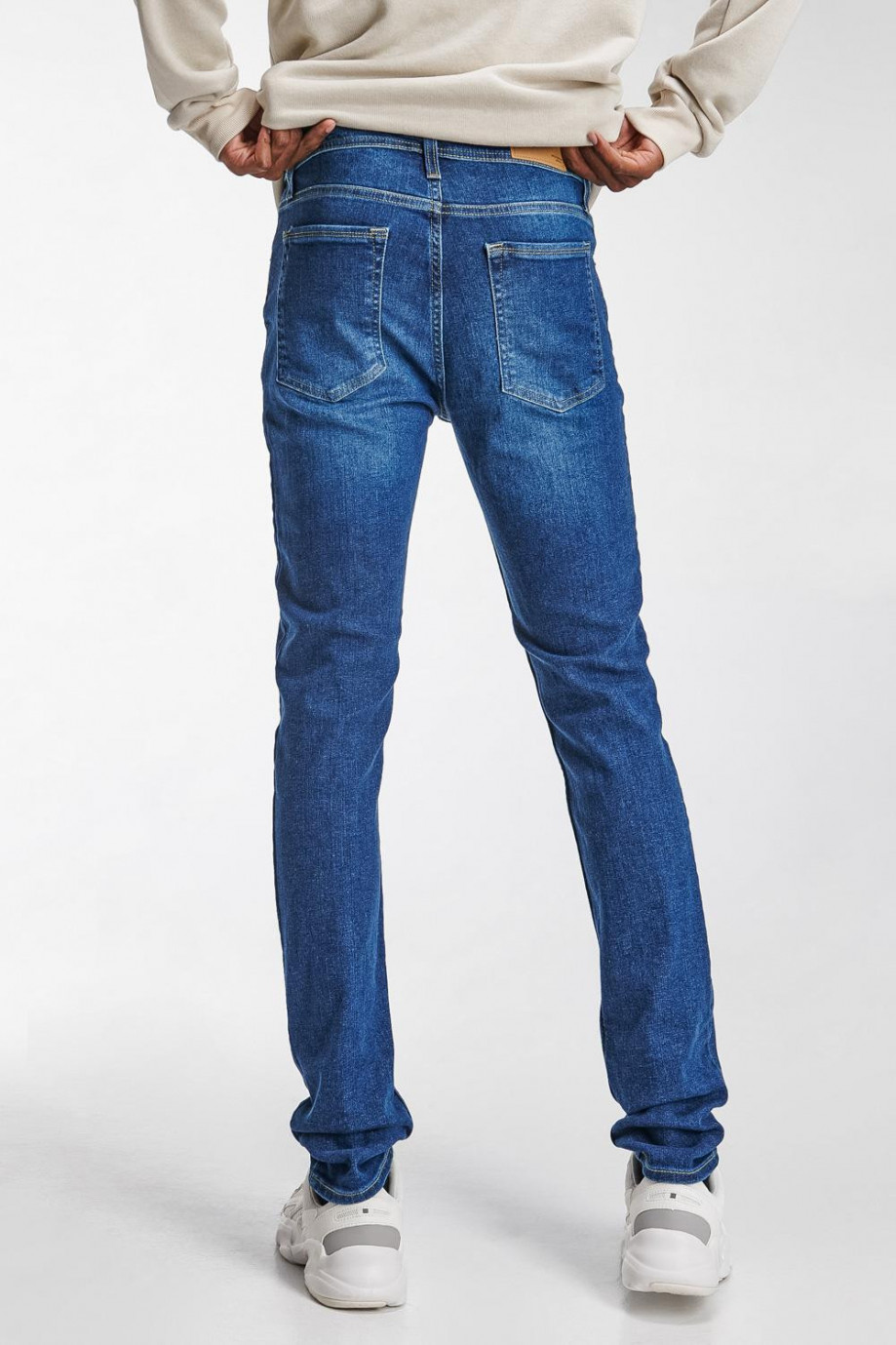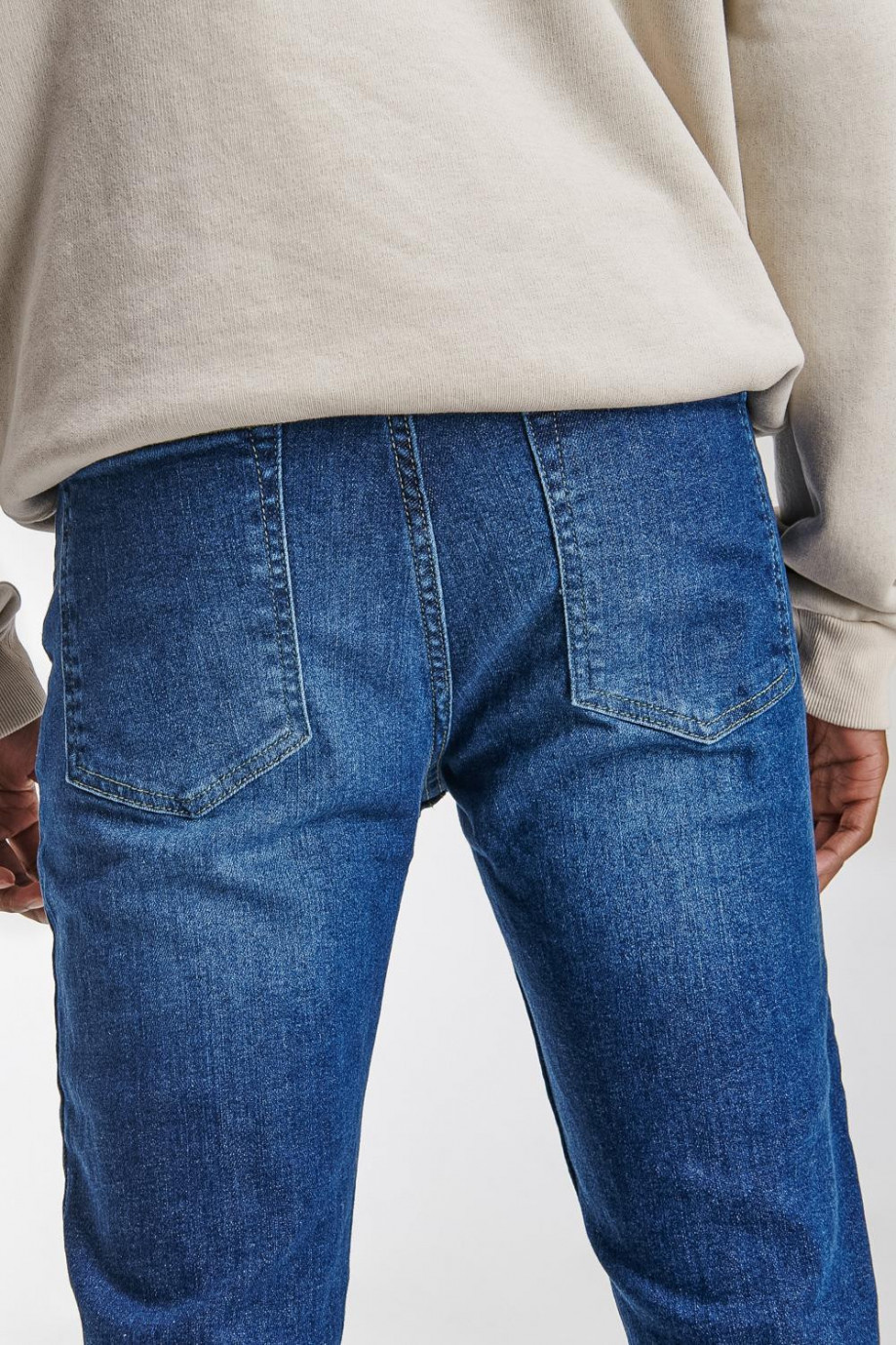 Jean para hombre, 5 bolsillos, tiro bajo, ajuste ceñido con lavado medio.