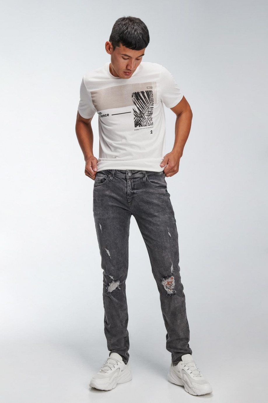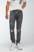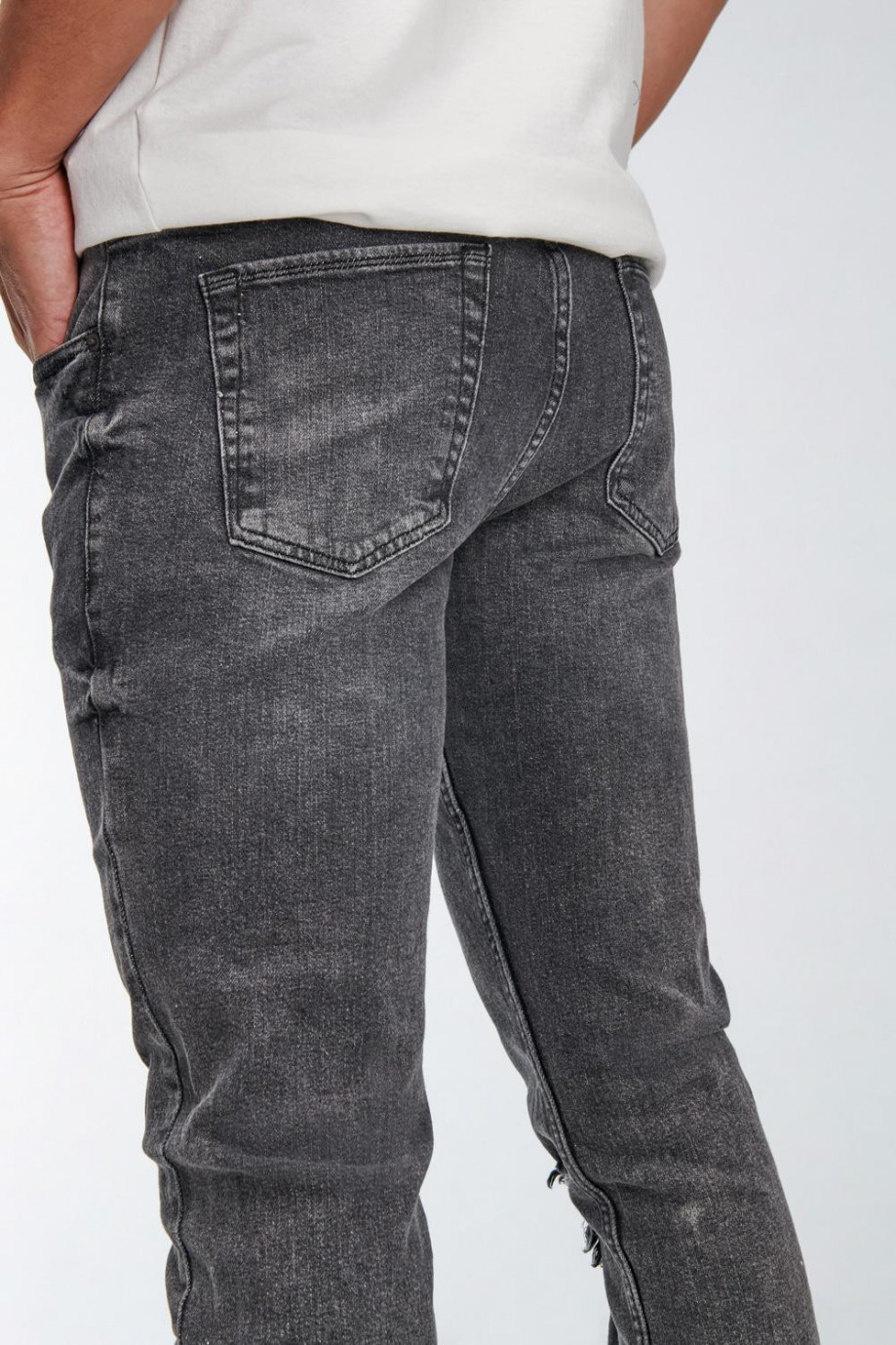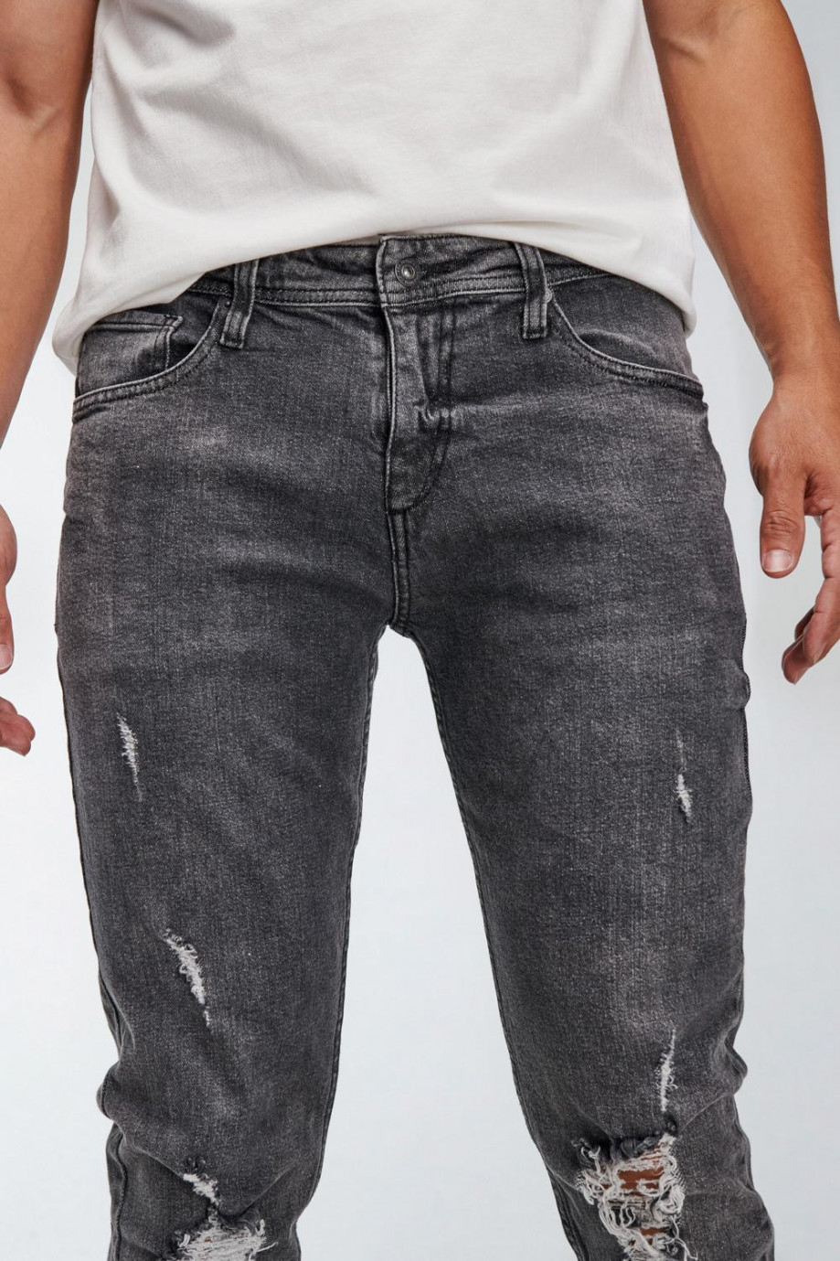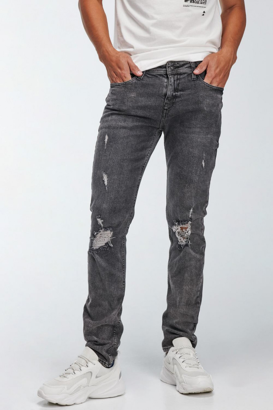 Jean para hombre, 5 bolsillos, tiro bajo, ajuste ceñido con lavado gris y rotos.