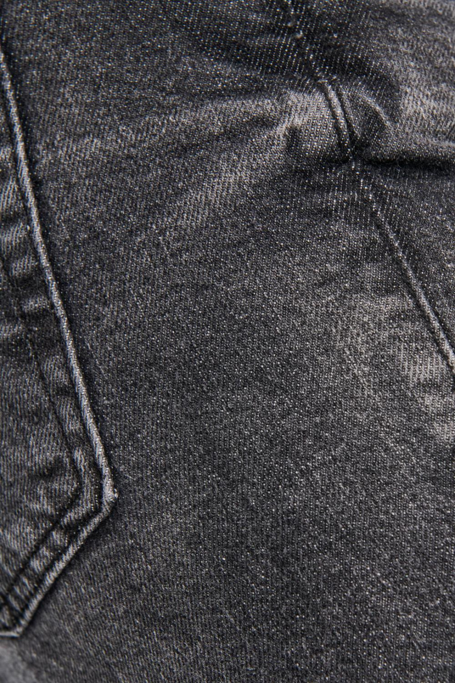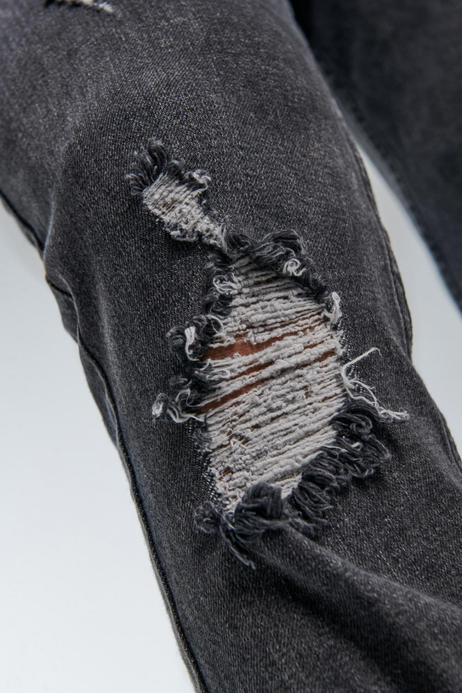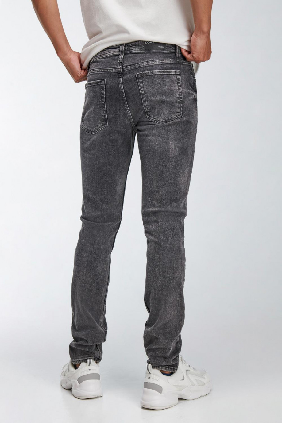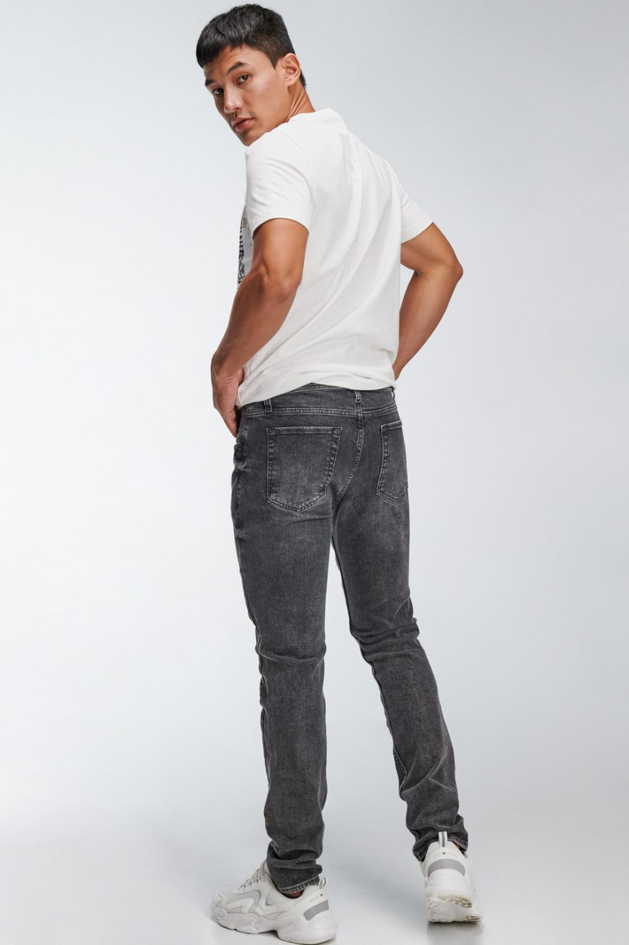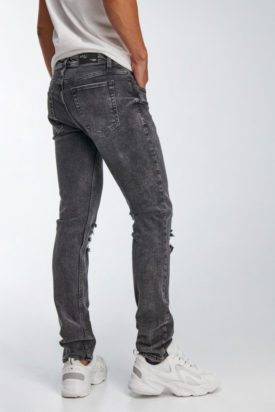 Jean para hombre, 5 bolsillos, tiro bajo, ajuste ceñido con lavado gris y rotos.
