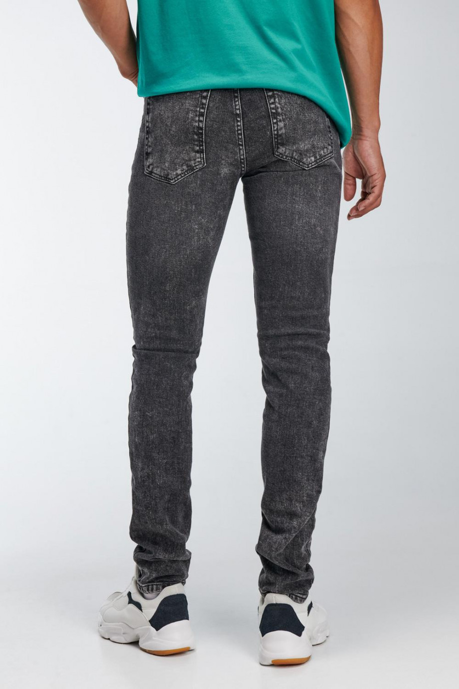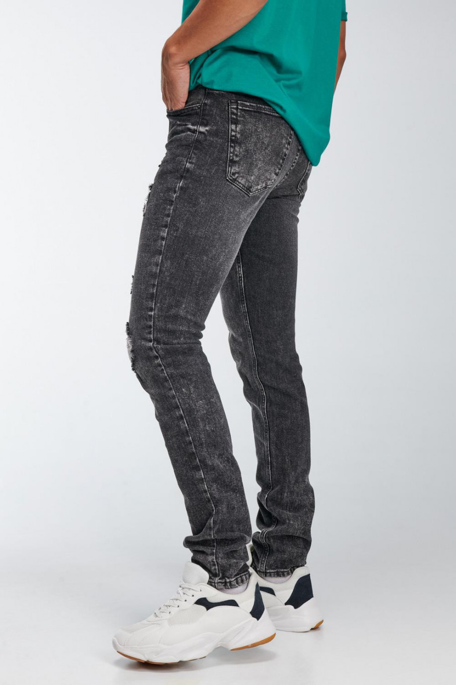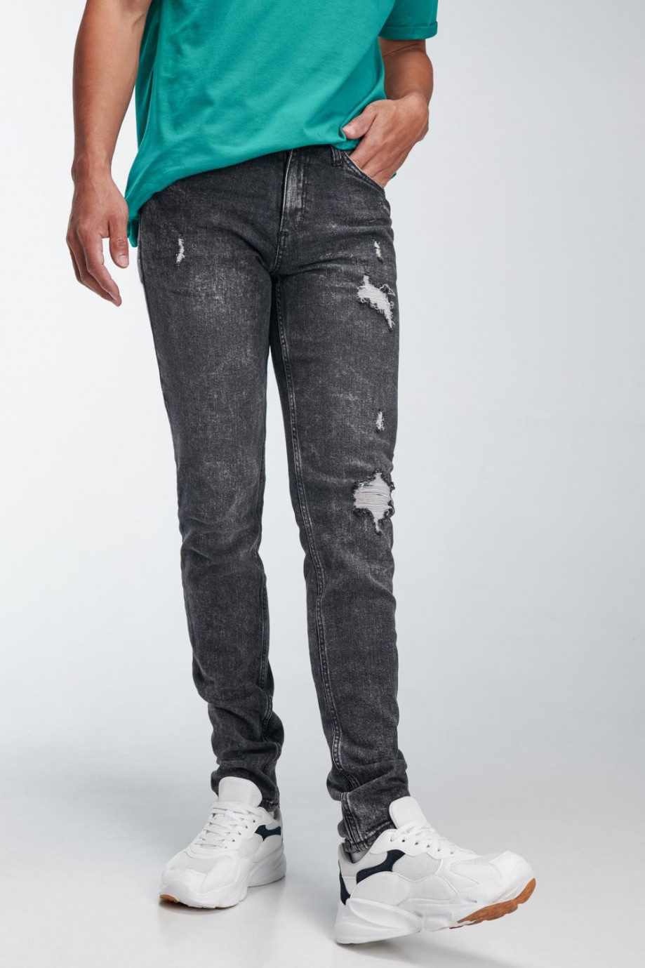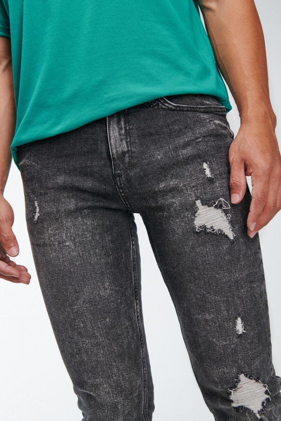Jean para hombre, 5 bolsillos, tiro bajo, ajuste ceñido con lavado gris y rotos.