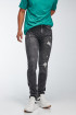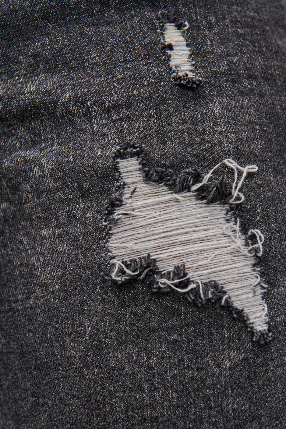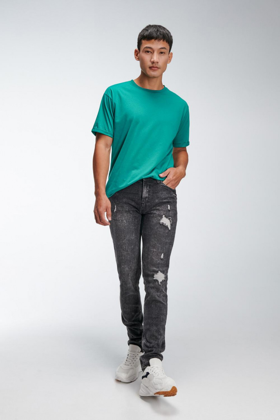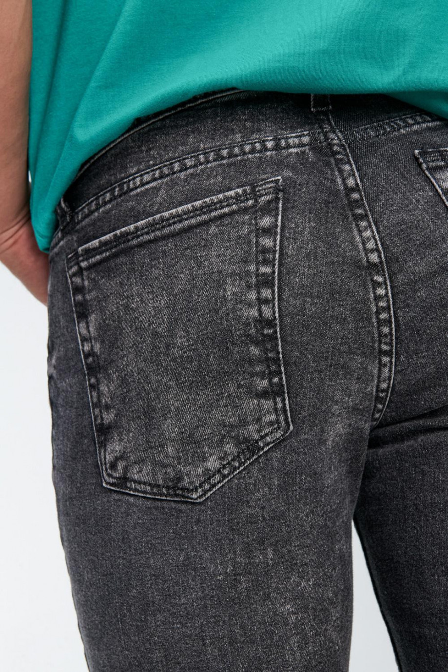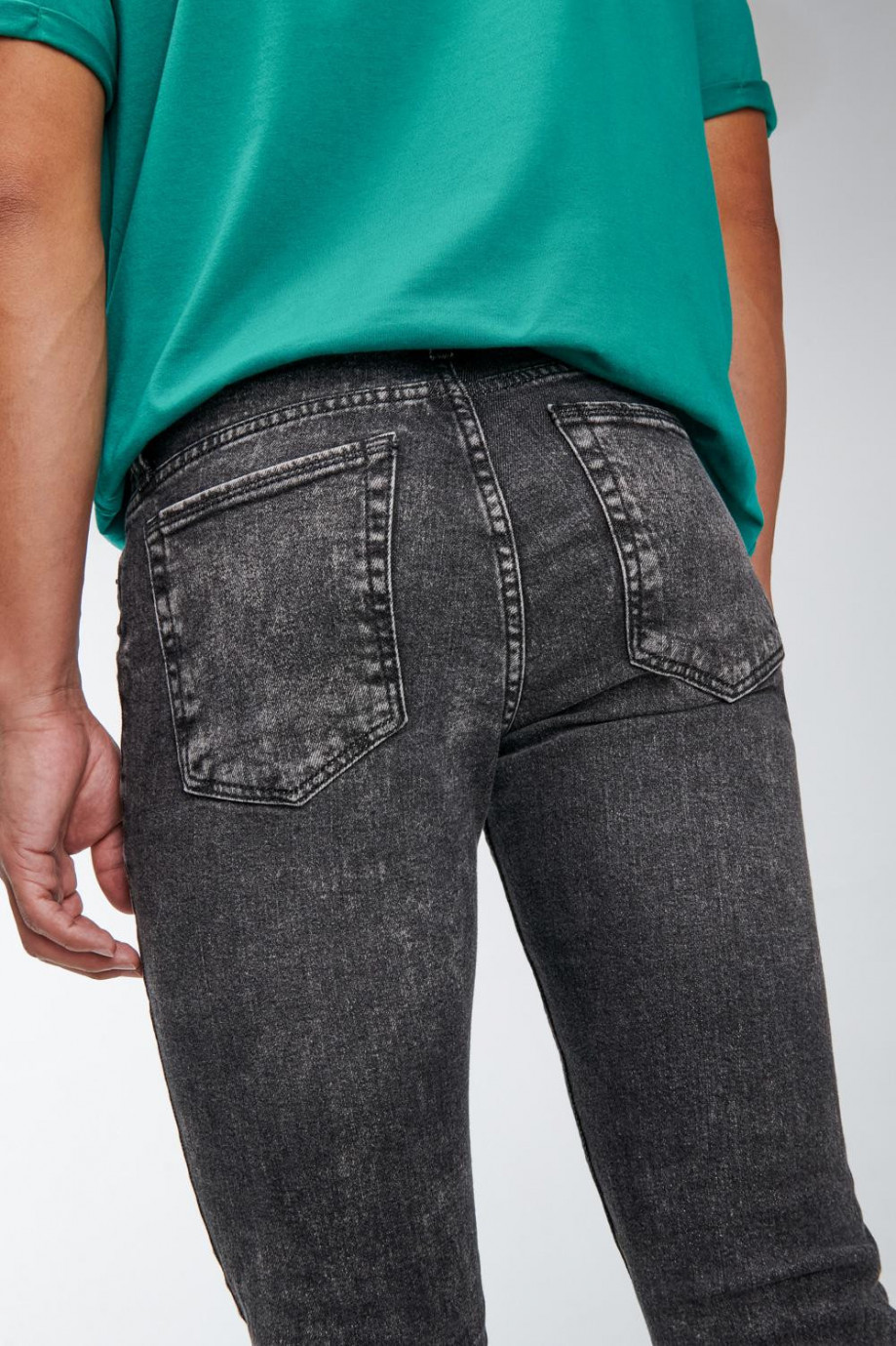 Jean para hombre, 5 bolsillos, tiro bajo, ajuste ceñido con lavado gris y rotos.