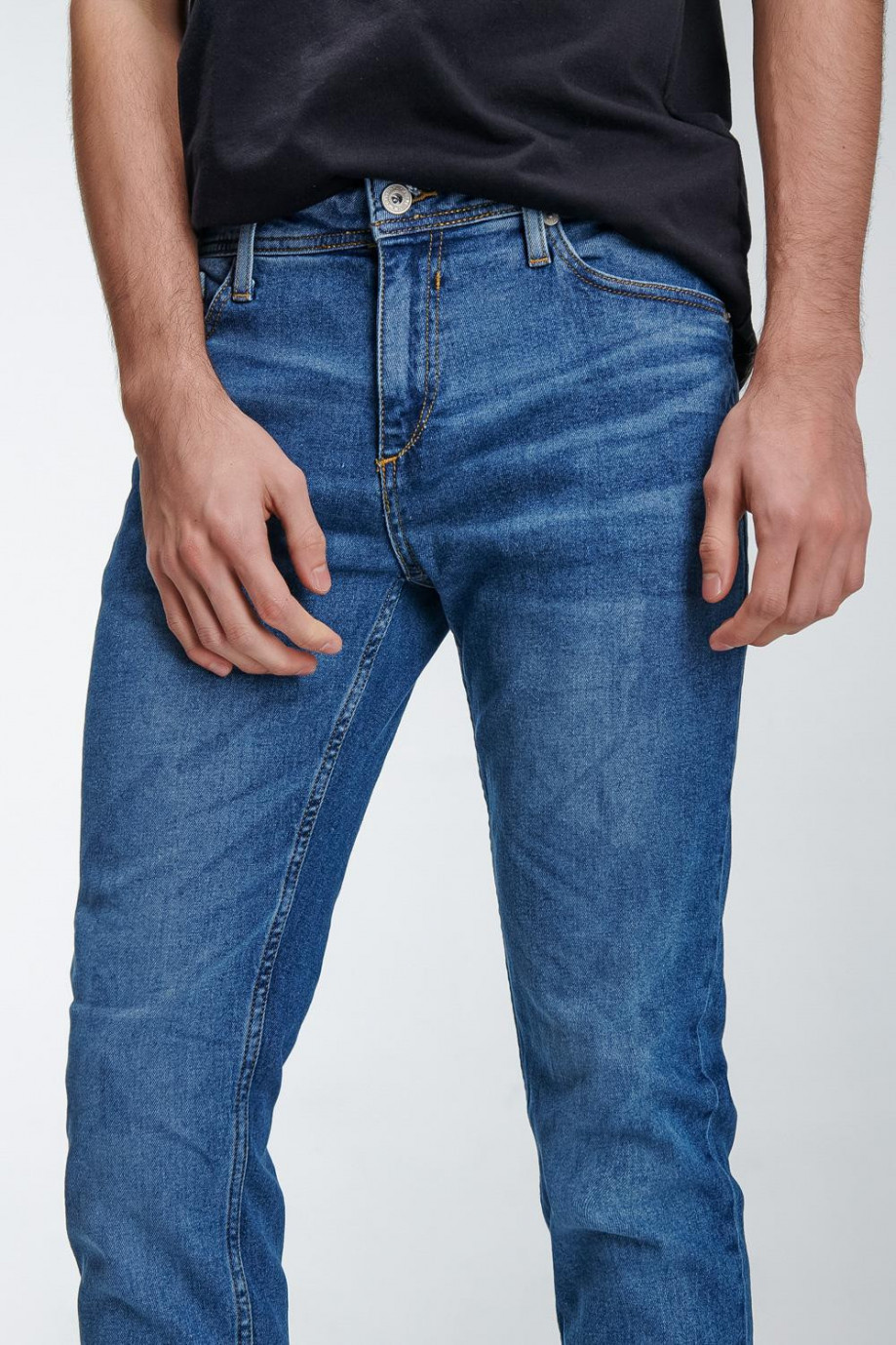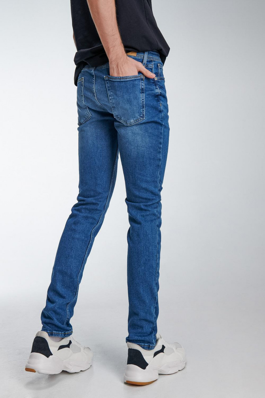 Jean para hombre, 5 bolsillos, tiro bajo, ajuste ceñido con lavado claro.