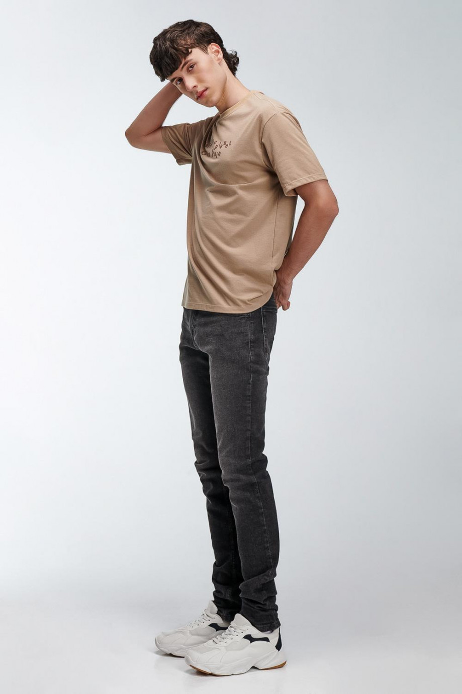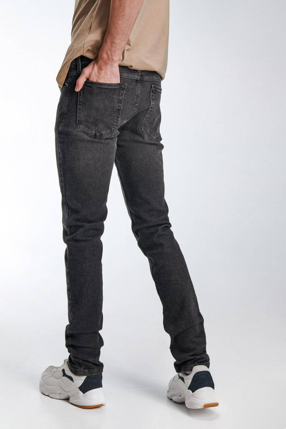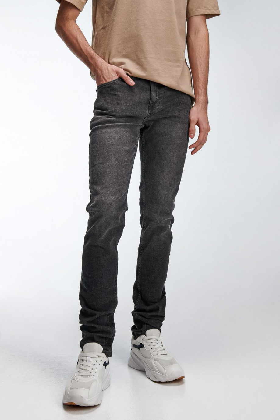 Jean para hombre, 5 bolsillos, tiro bajo, ajuste ceñido con lavado gris.