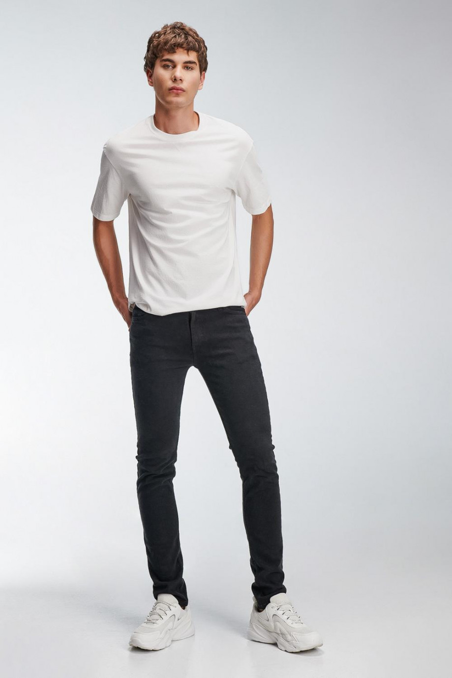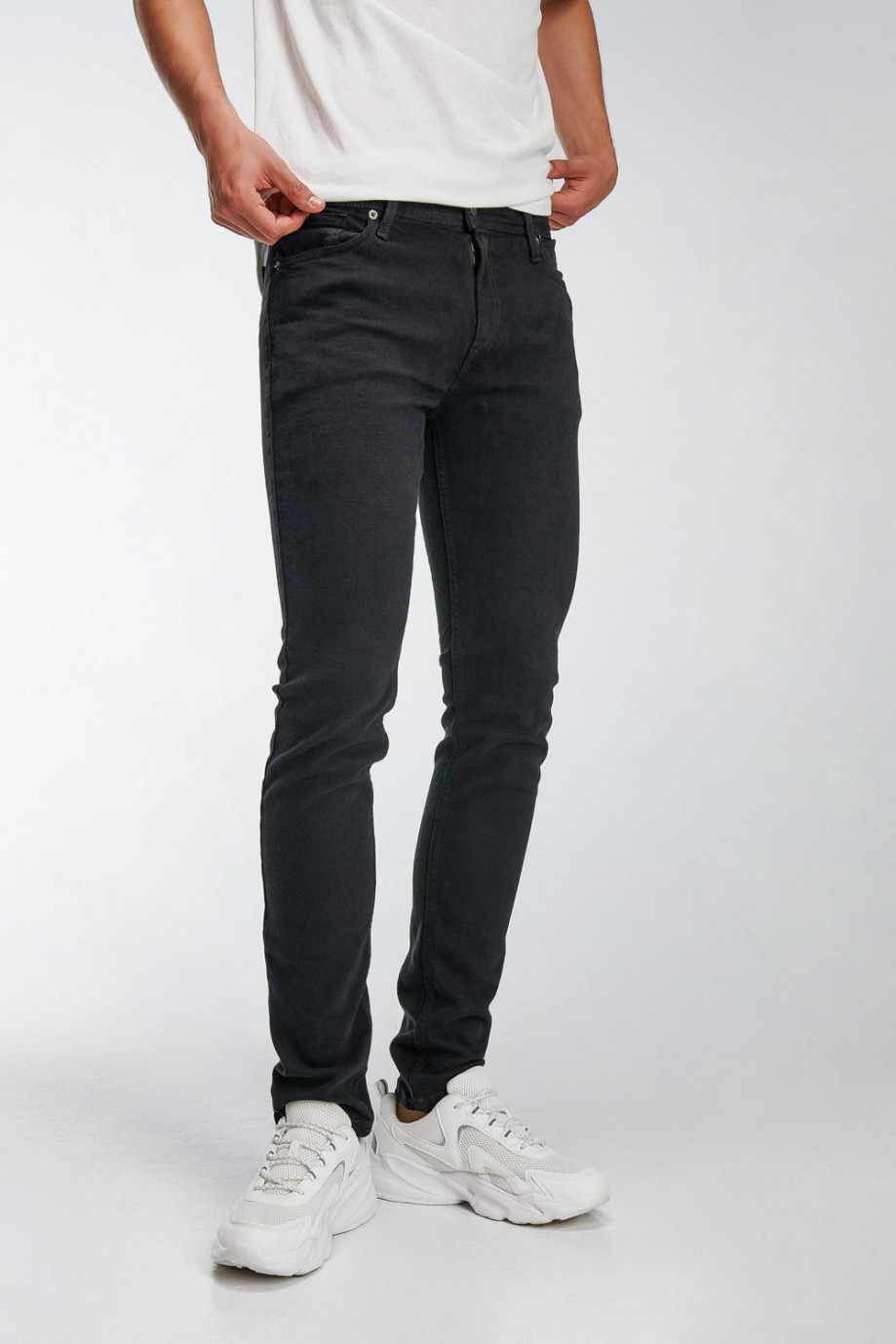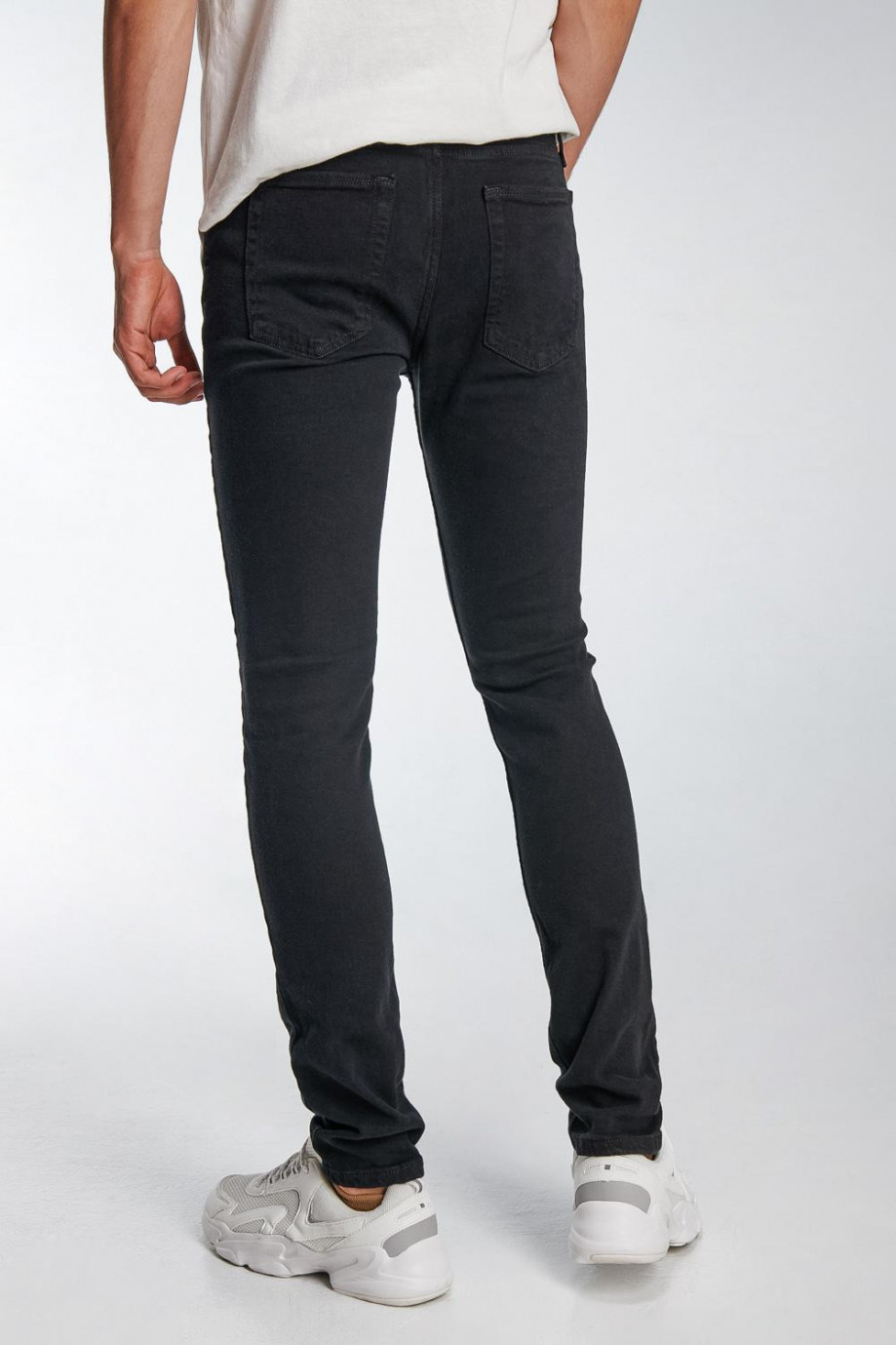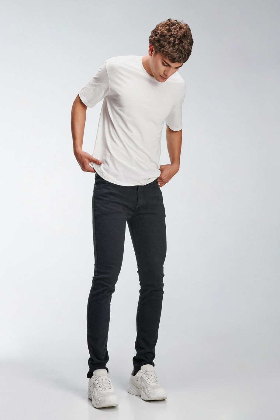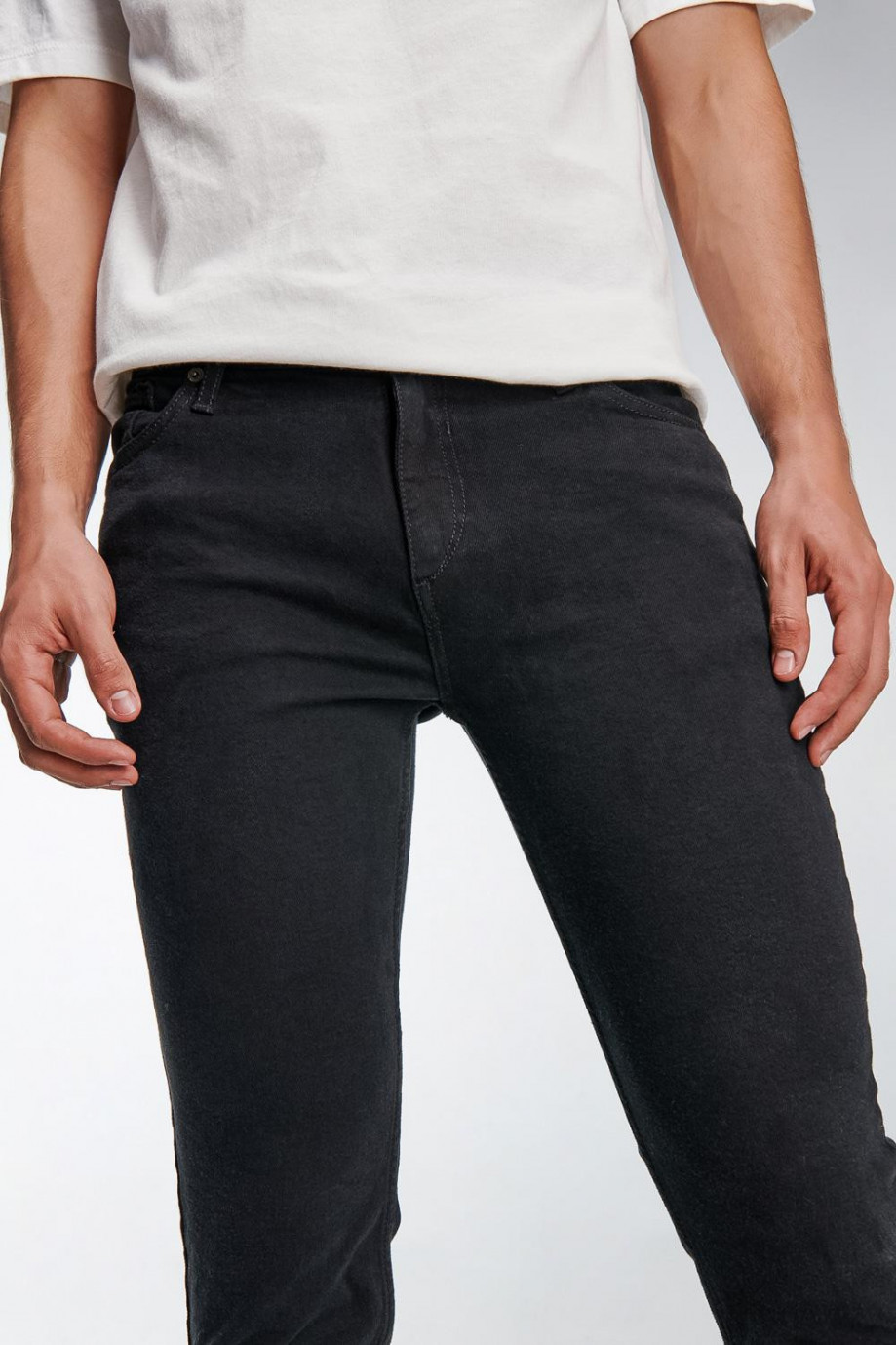 Jean para hombre, 5 bolsillos, tiro bajo, ajuste ceñido con lavado negro.