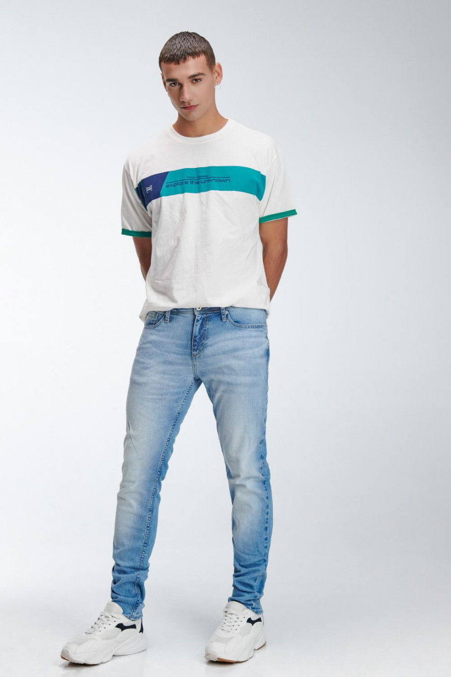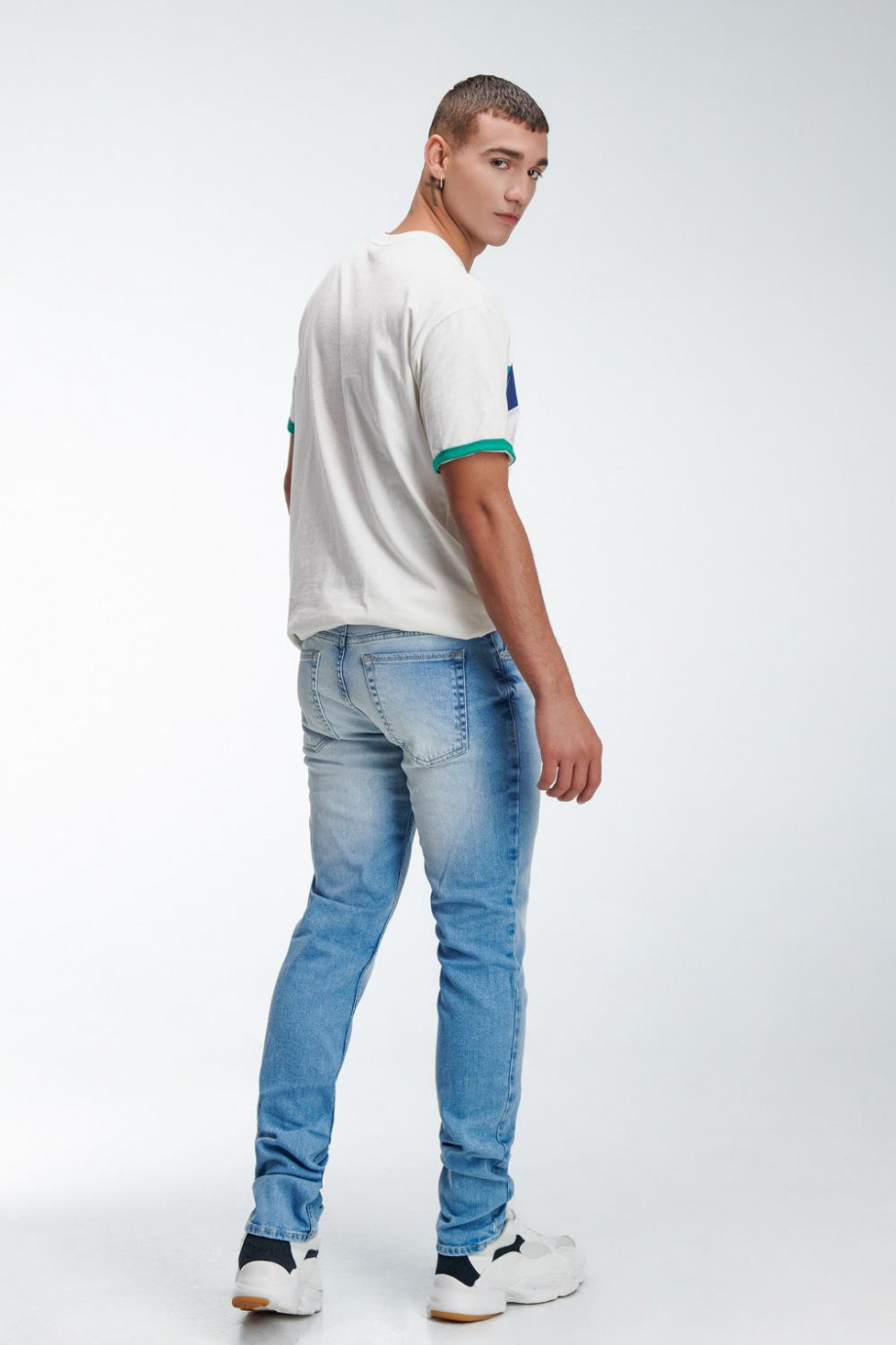 Jean para hombre, 5 bolsillos, tiro bajo, ajuste ceñido con lavado muy claro