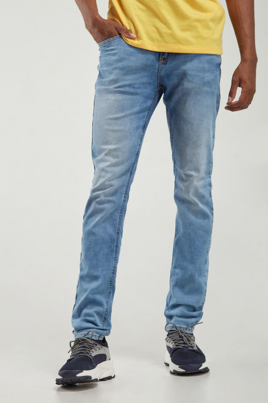 Jean para hombre, 5 bolsillos, tiro bajo ajuste muy ceñido con lavado claro.