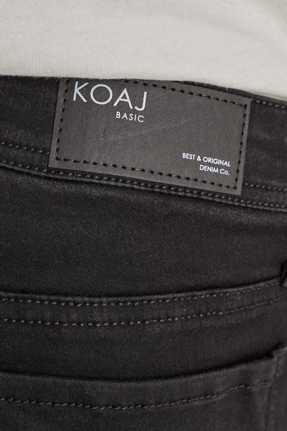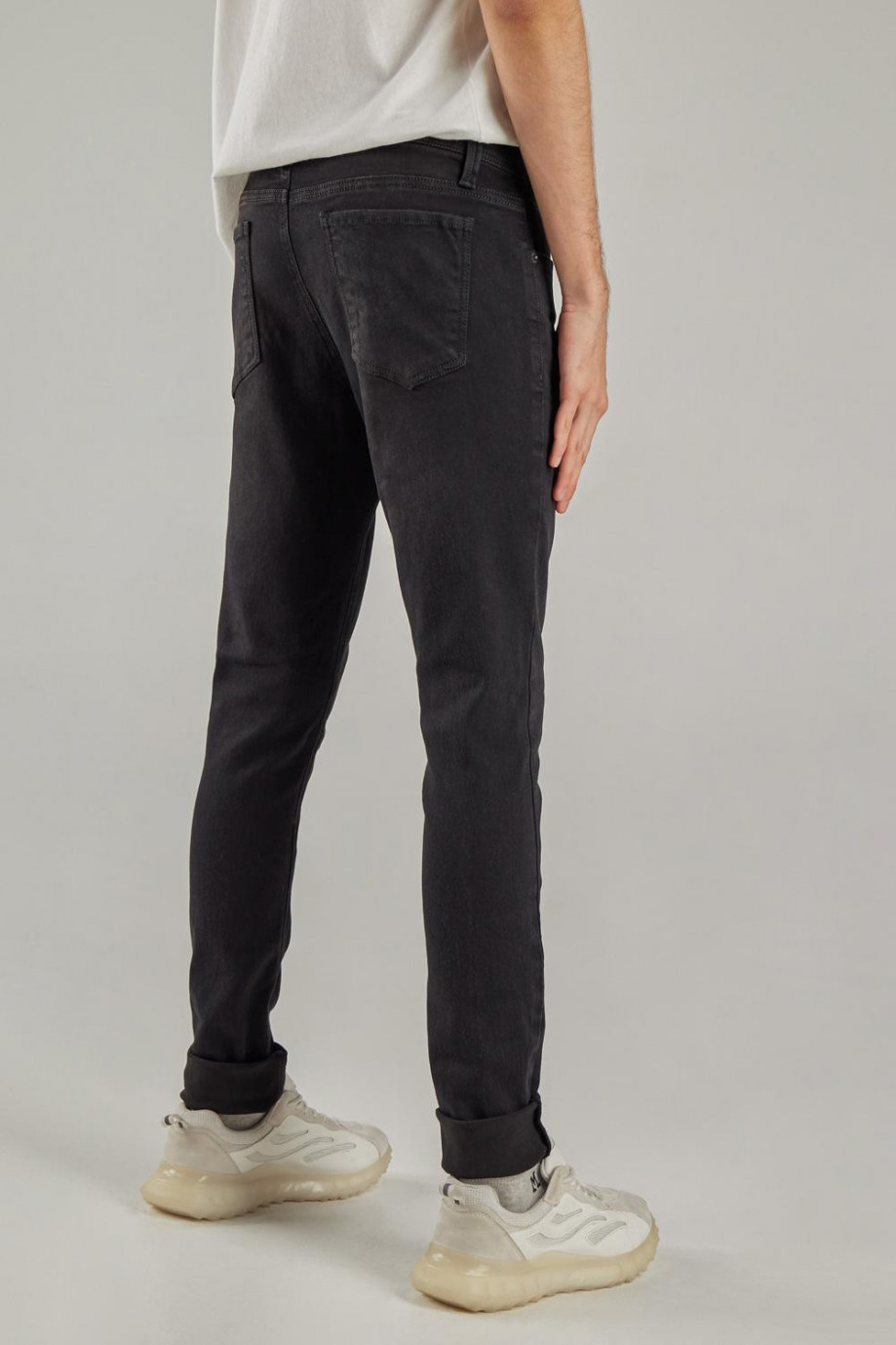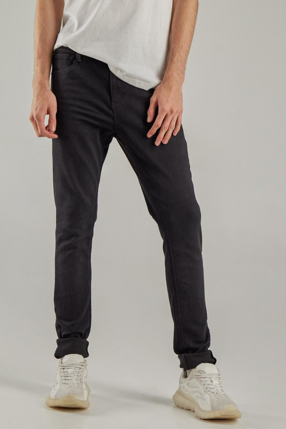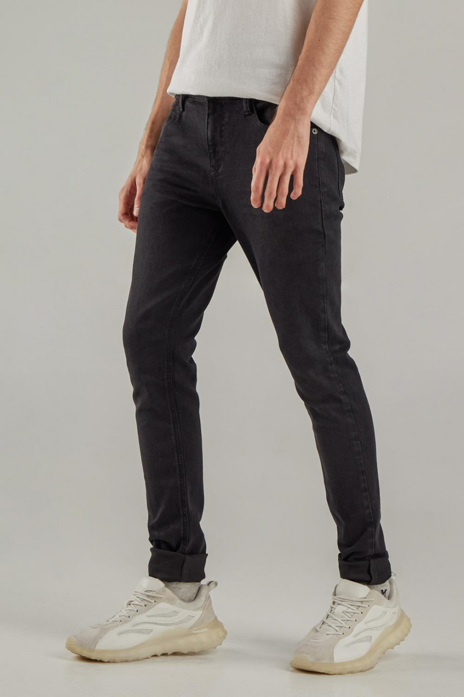 Jean para hombre, 5 bolsillos, tiro bajo ajuste muy ceñido con lavado negro.