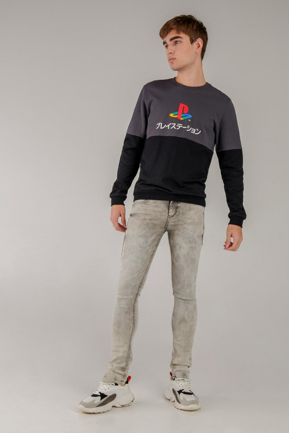 Jean para hombre, 5 bolsillos, tiro bajo ajuste muy ceñido con lavado gris.