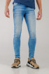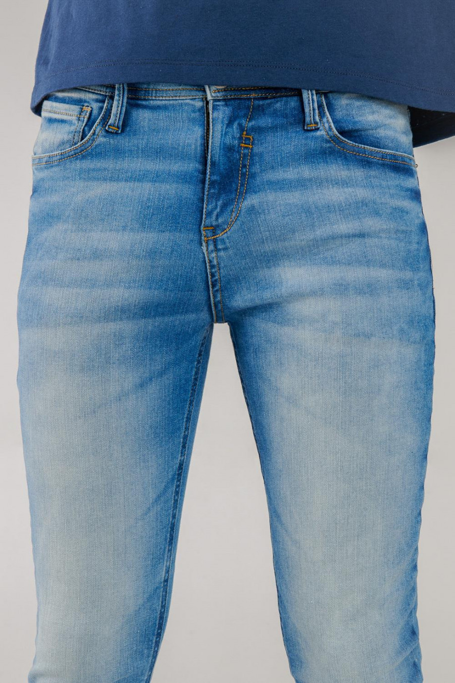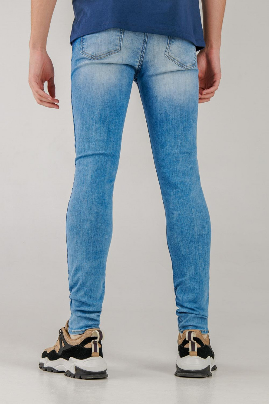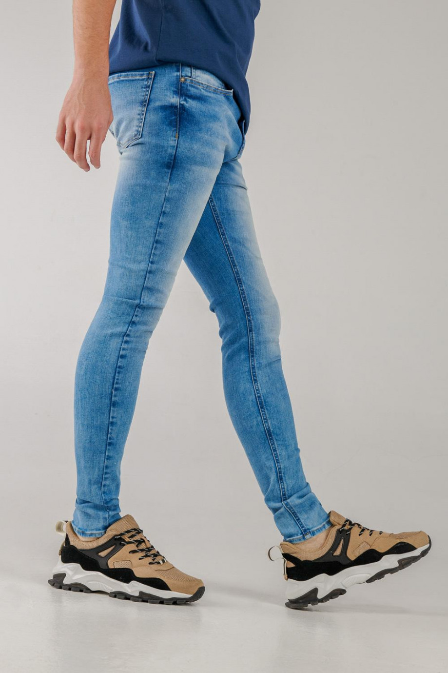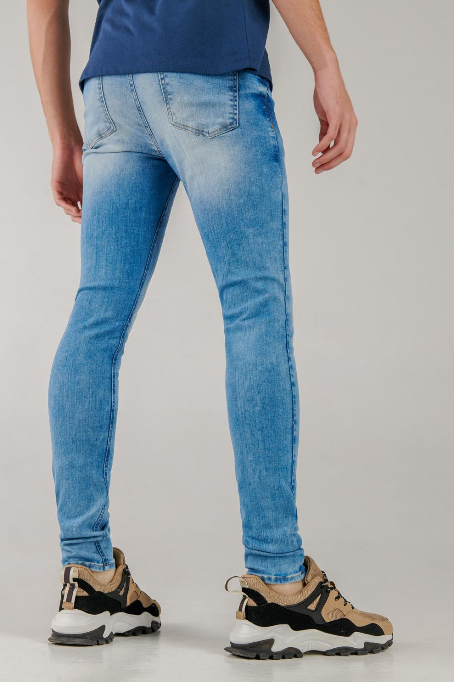 Jean para hombre, 5 bolsillos, tiro bajo ajuste muy ceñido con lavado muy claro.