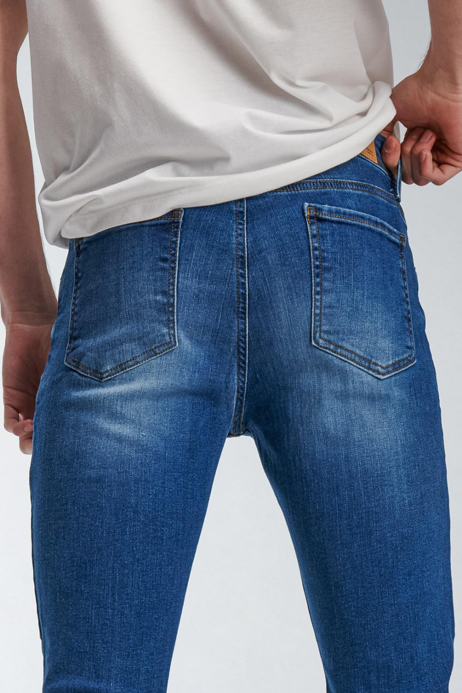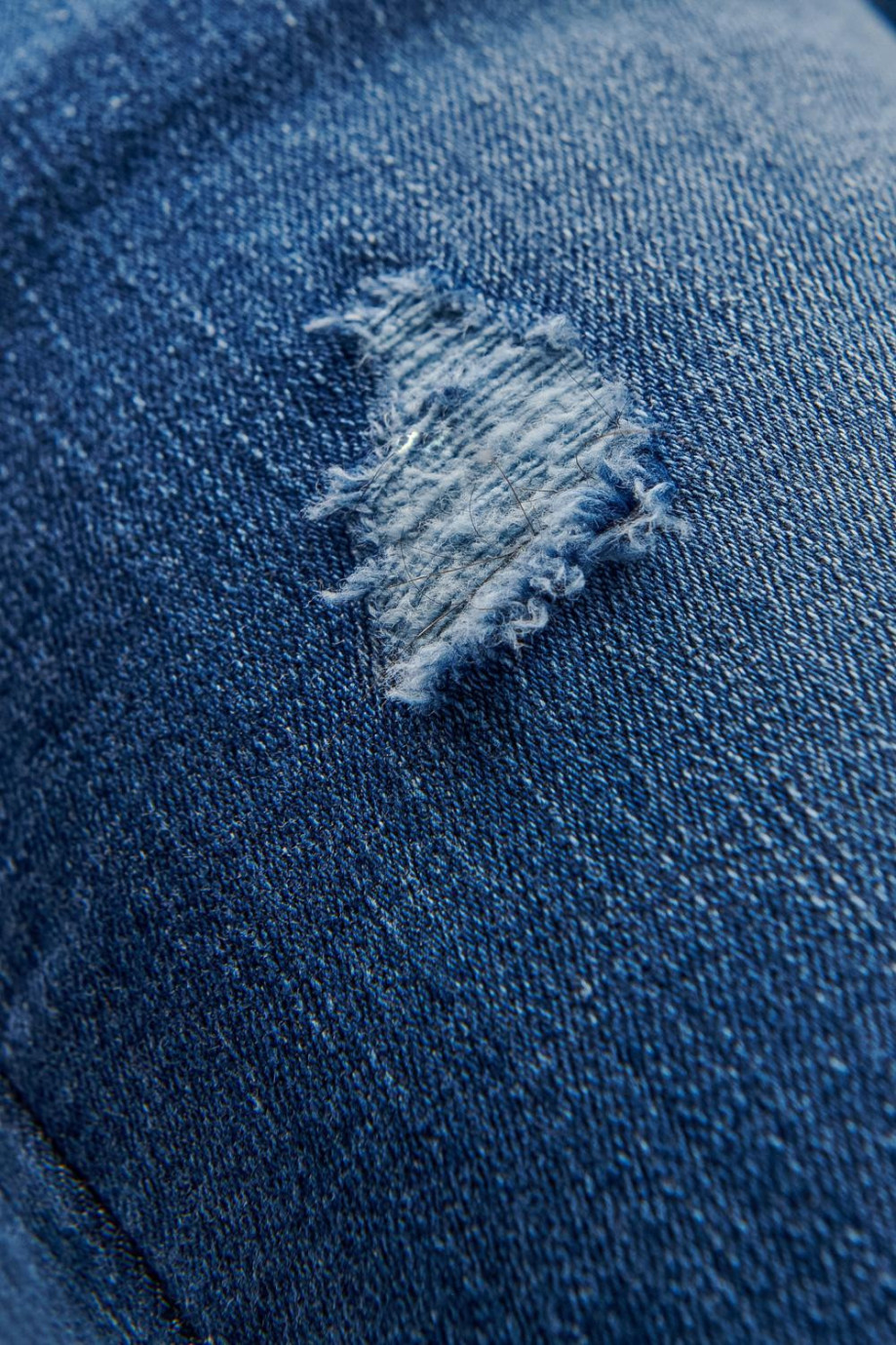 Jean para hombre, 5 bolsillos, tiro bajo ajuste muy ceñido con lavado medio y rotos
