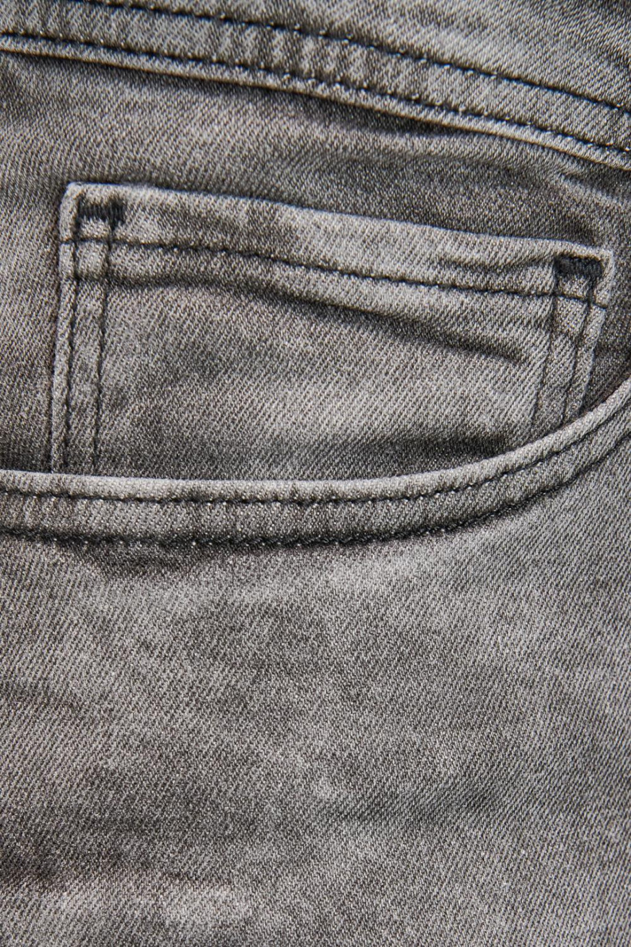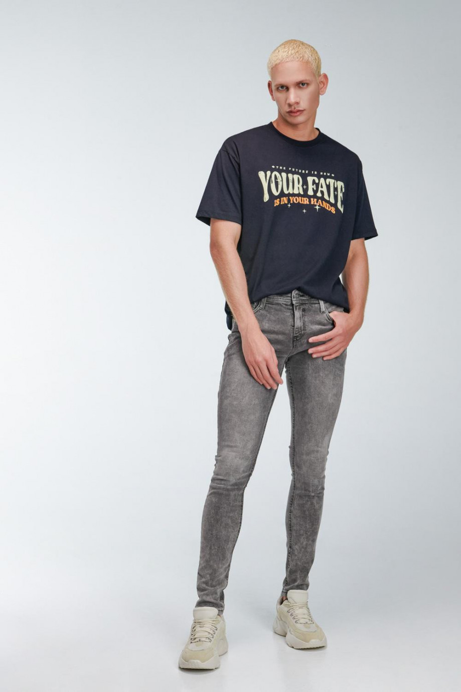 Jean para hombre, 5 bolsillos, tiro bajo ajuste muy ceñido con lavado gris.