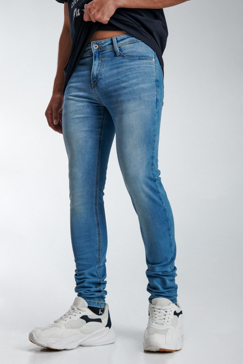 Jean para hombre, 5 bolsillos, tiro bajo ajuste muy ceñido con lavado claro.