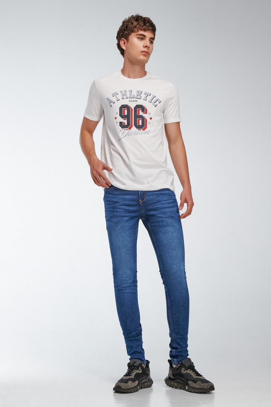 Jean para hombre, 5 bolsillos, tiro bajo ajuste muy ceñido con lavado medio