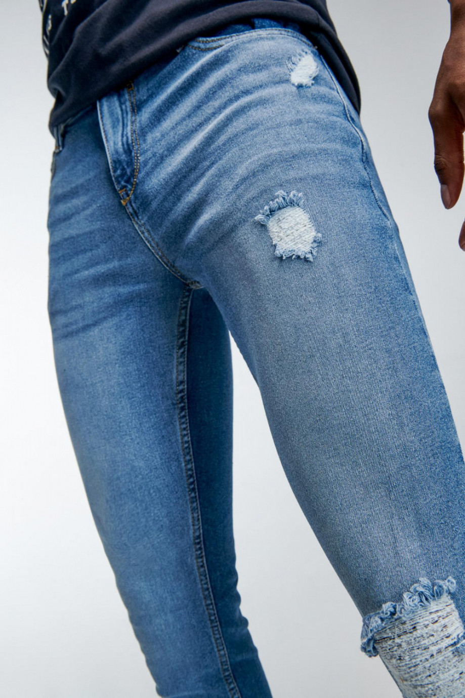 Jean para hombre, 5 bolsillos, tiro bajo ajuste muy ceñido con lavado claro y rotos.