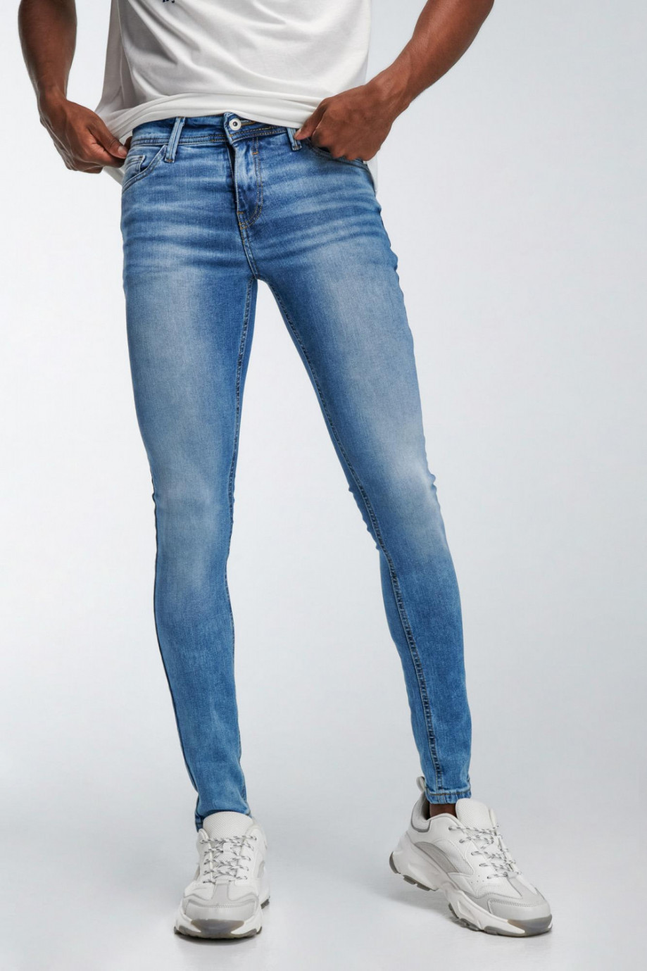 Jean para hombre, 5 bolsillos, tiro bajo ajuste muy ceñido con lavado claro.