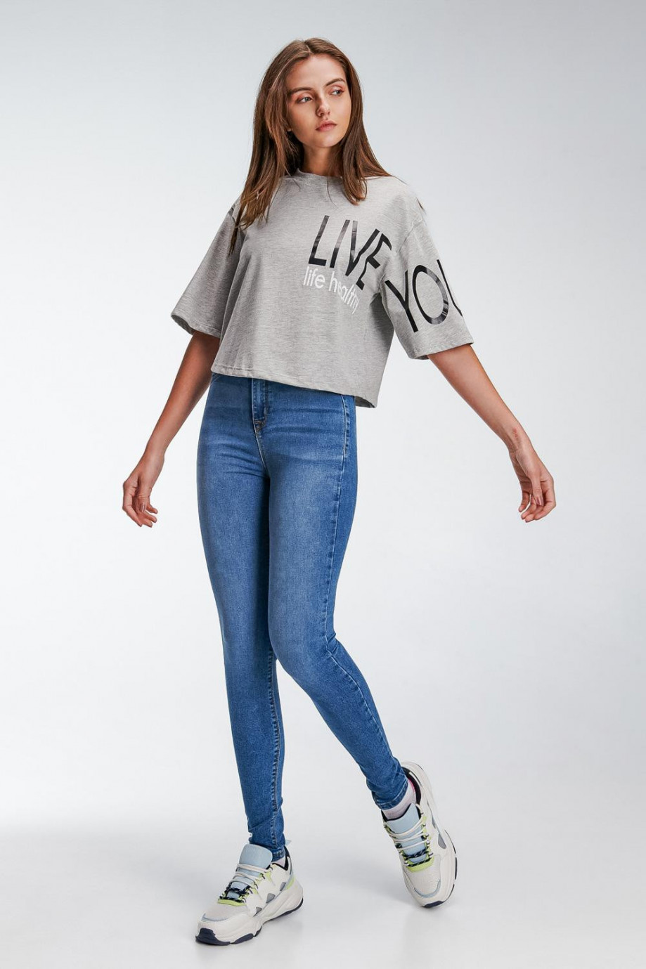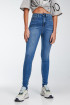 Jean para mujer, 5 bolsillos, tiro super alto, ajuste ceñido con lavado medio.