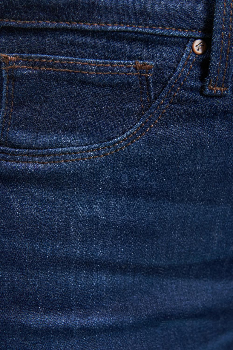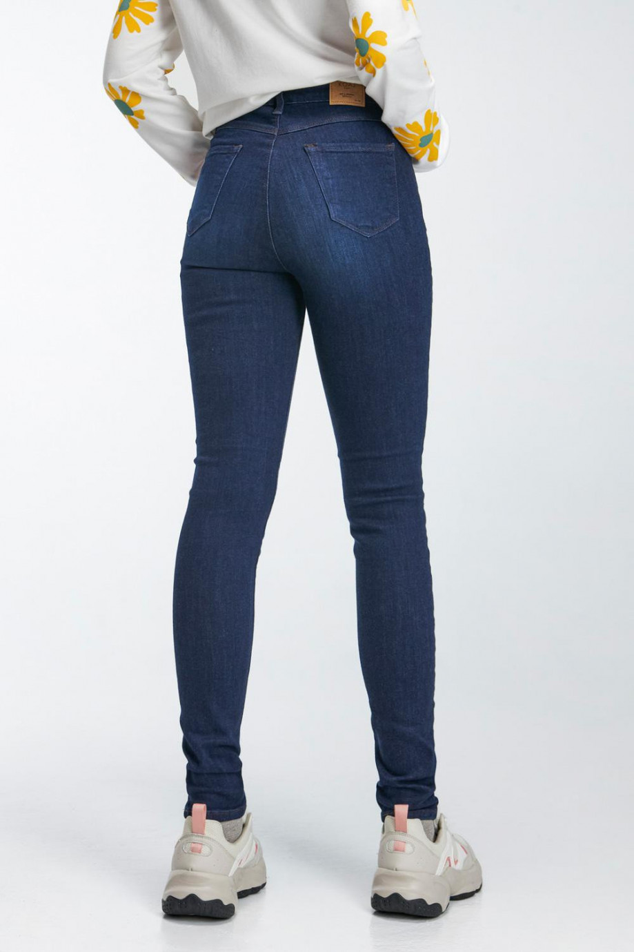 Jean para mujer, 5 bolsillos, tiro super alto, ajuste ceñido con lavado azul oscuro.
