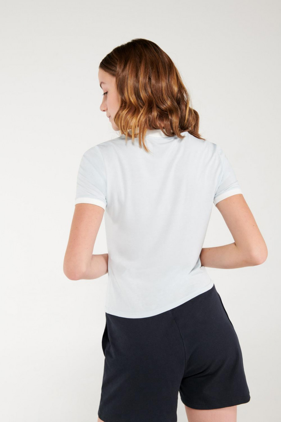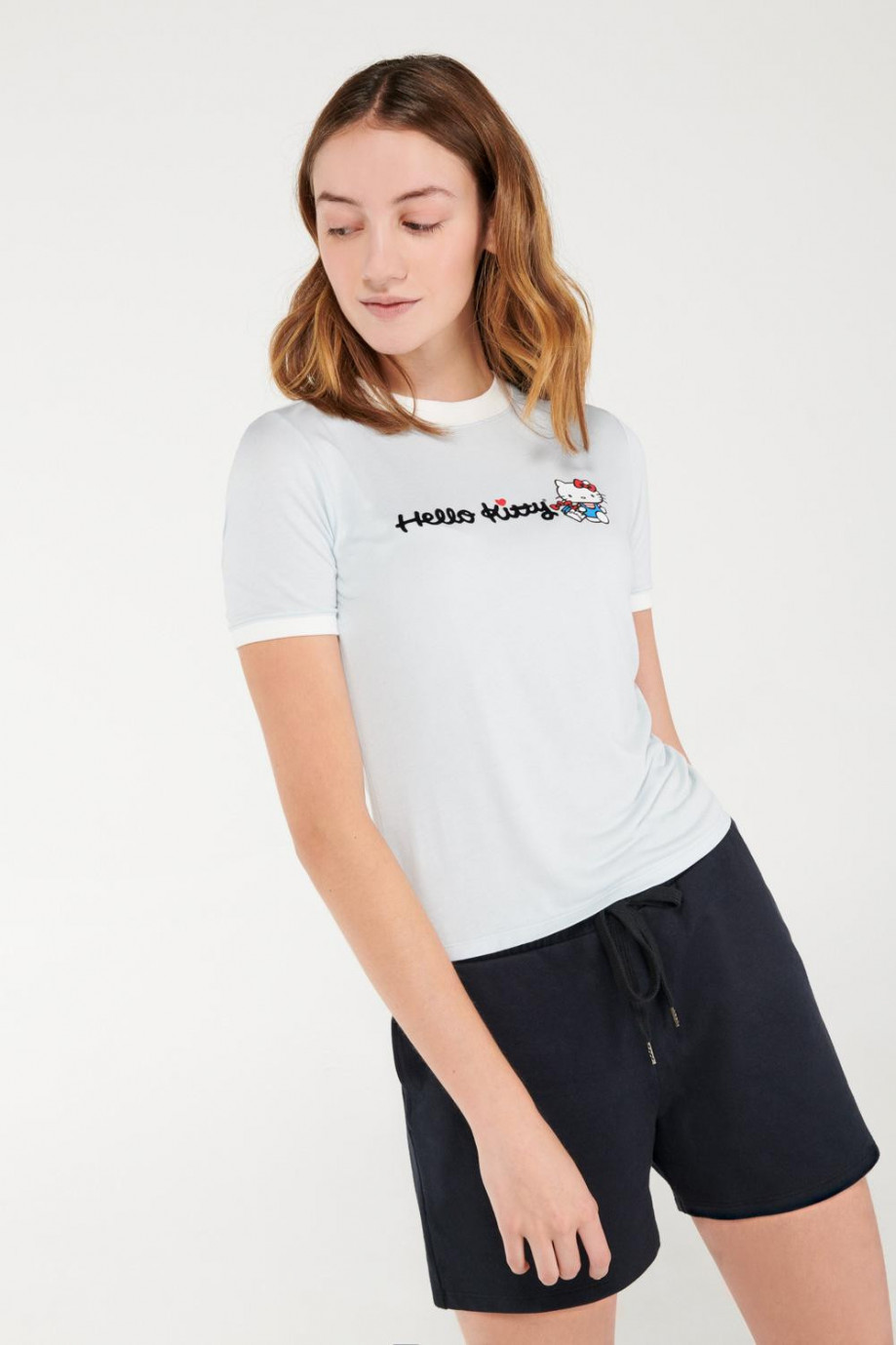 Camiseta para mujer, manga corta, con cuello y puños en contraste, con estampado en frente de Hello Kitty.