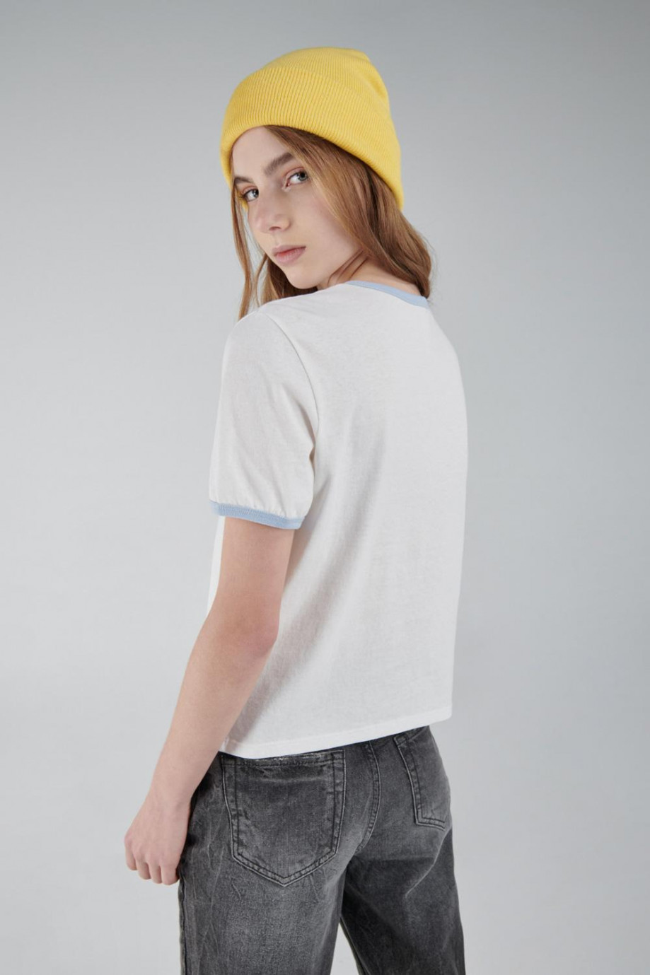 Camiseta, para mujer, manga corta, con cuello y borde mangas en contraste, estampado en frente, de Mickey, Disney.