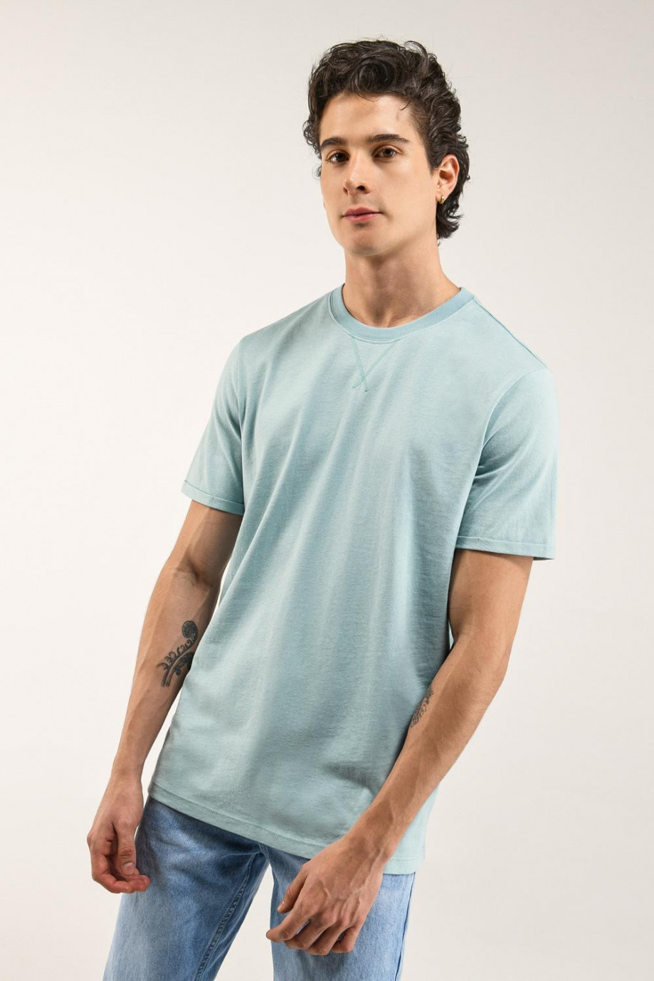 Camiseta manga corta, unicolor para hombre con costura decorativa en cuello frente.