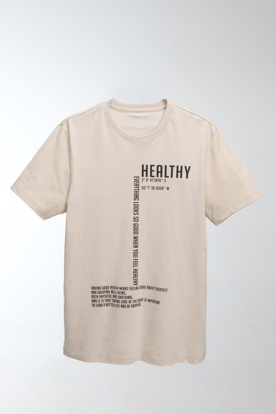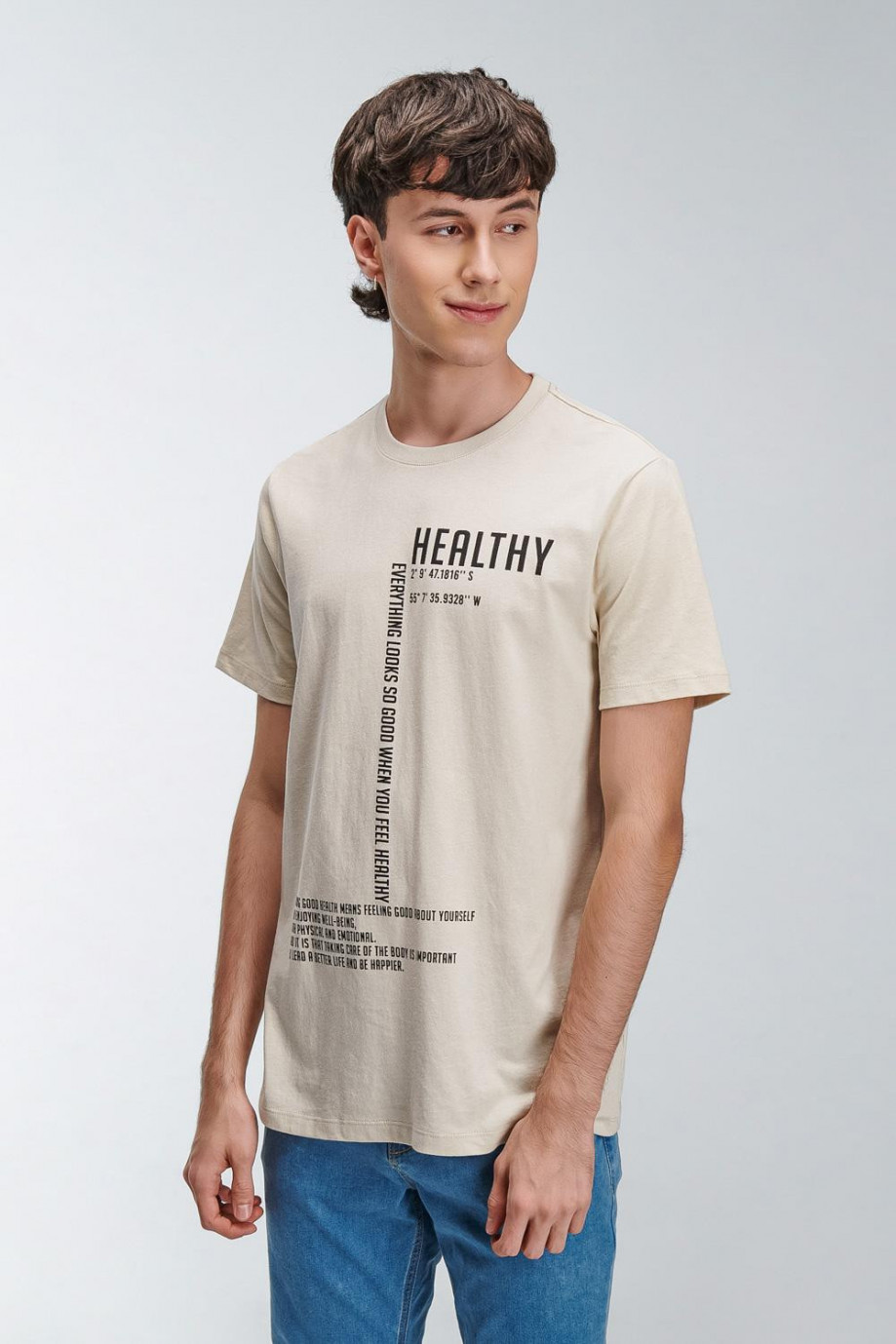 Camiseta fit masculina, cuello redondo, silueta semi ajustada, con estampado minimalista sobre el frente con manga corta.