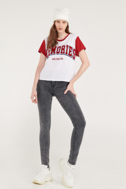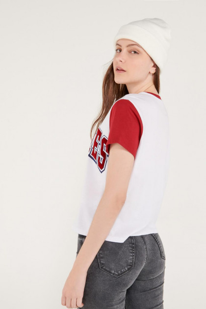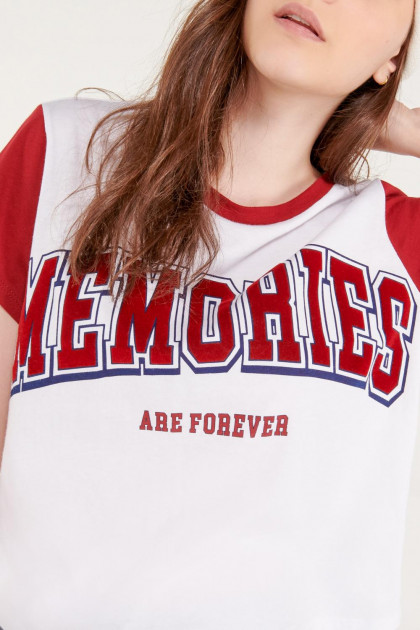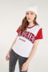 Camiseta para mujer manga corta, con mangas y cuello en contraste, frente estampado.