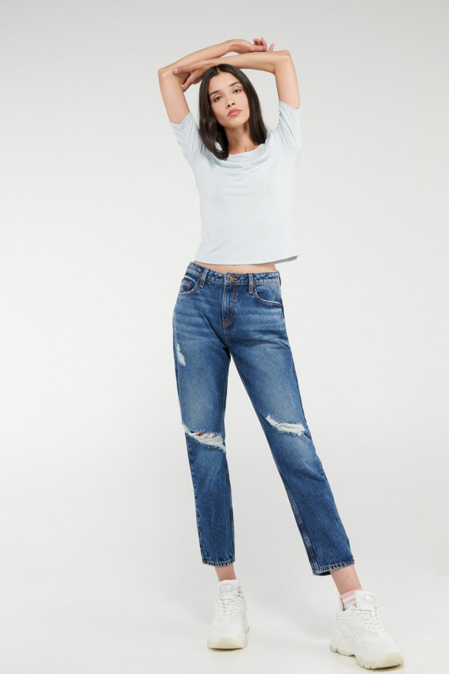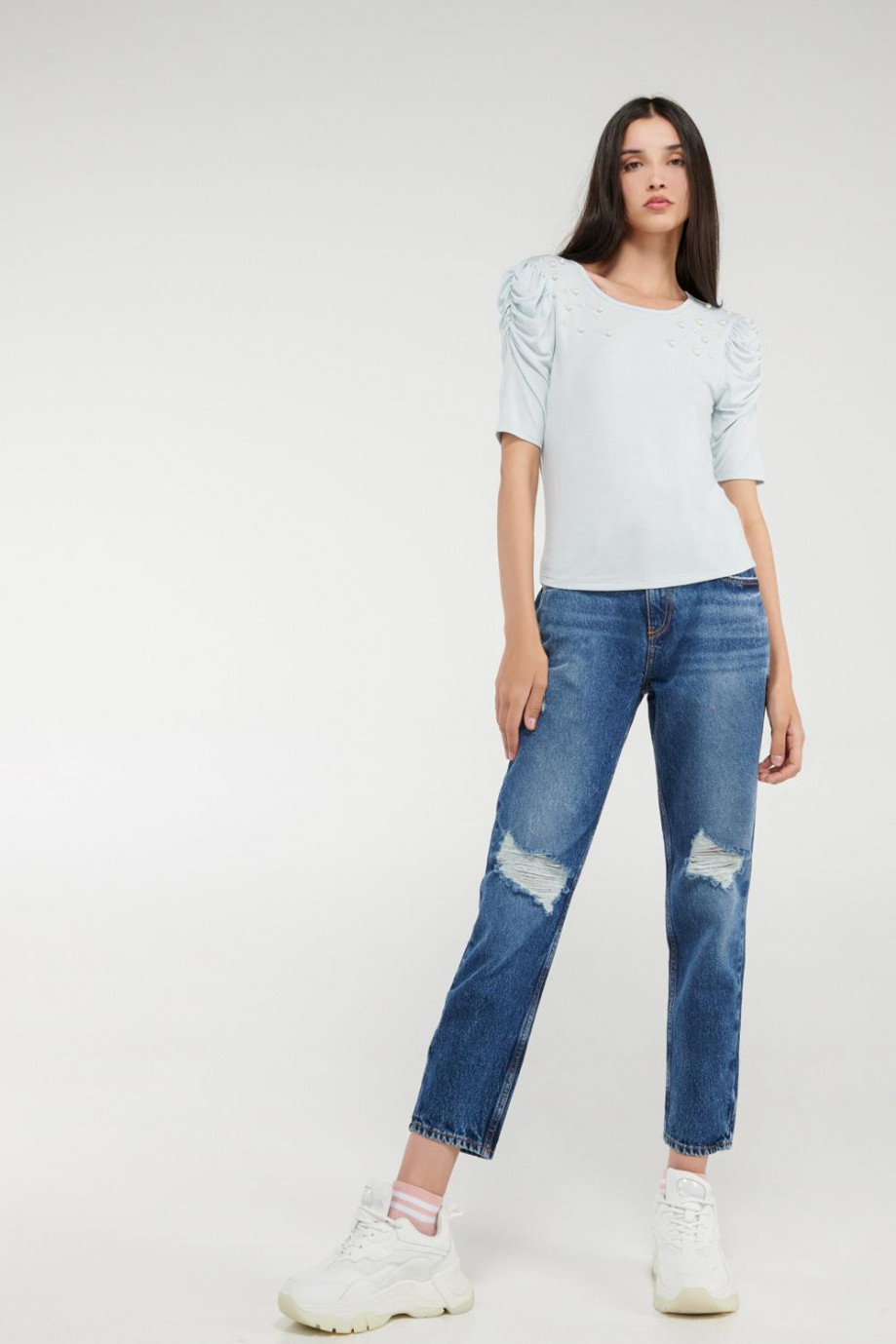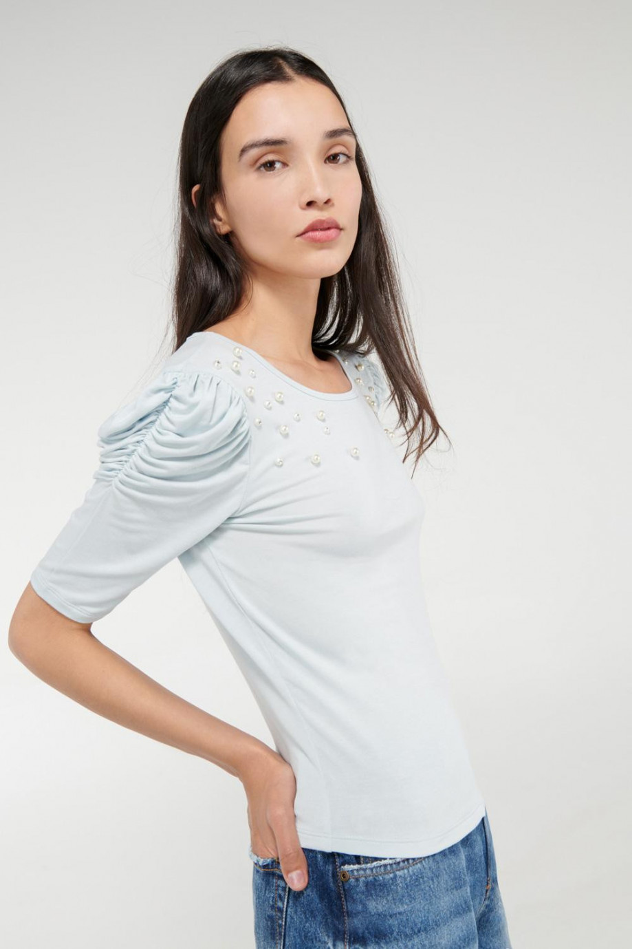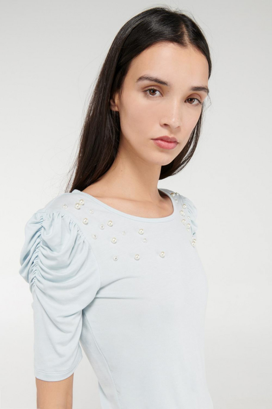 Camiseta manga corta para mujer, con perlas en frente y recogido en manga.
