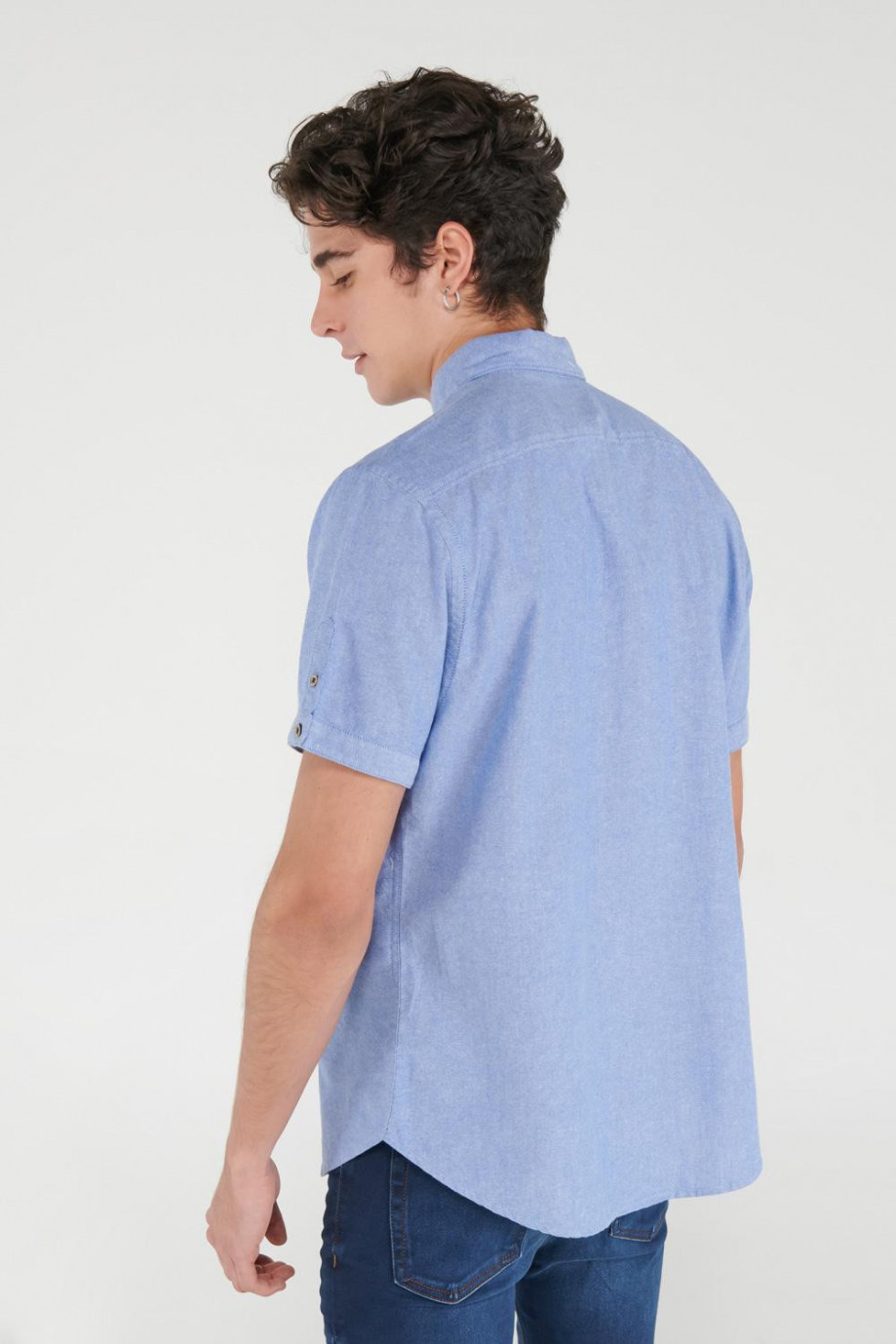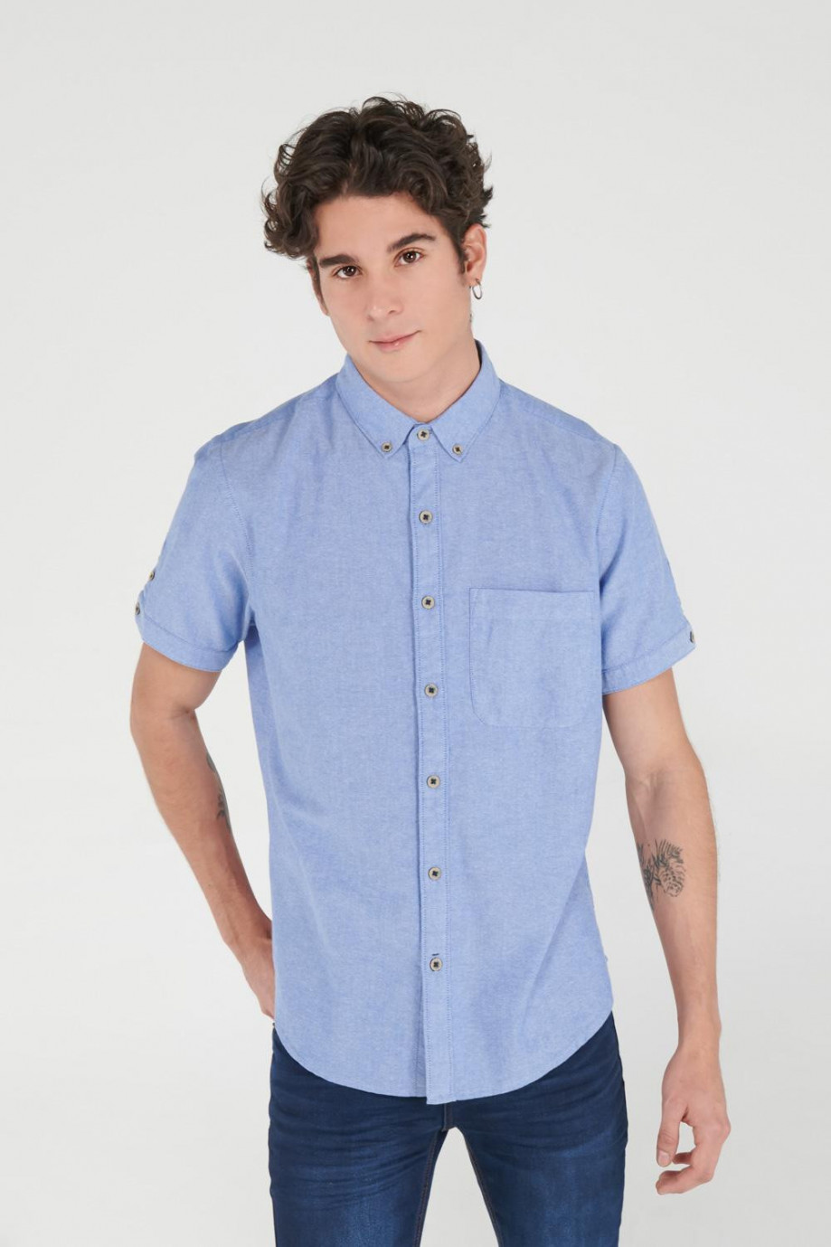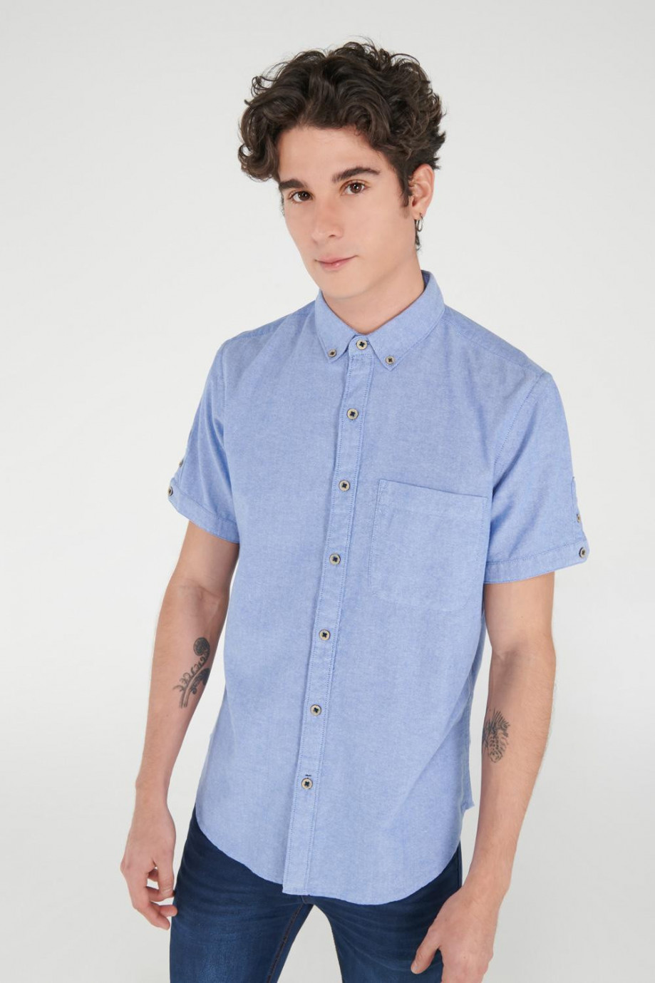 Camisa para hombre, en tela oxford unicolor con bolsillo delantero cuello button down