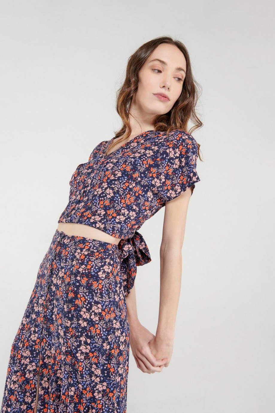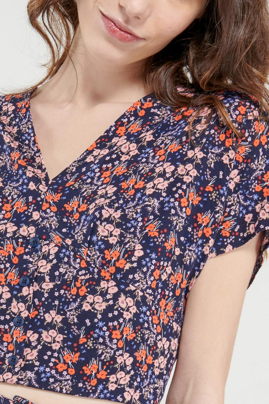 Blusa manga corta cuello en V, escote profundo y anudado en espalda.