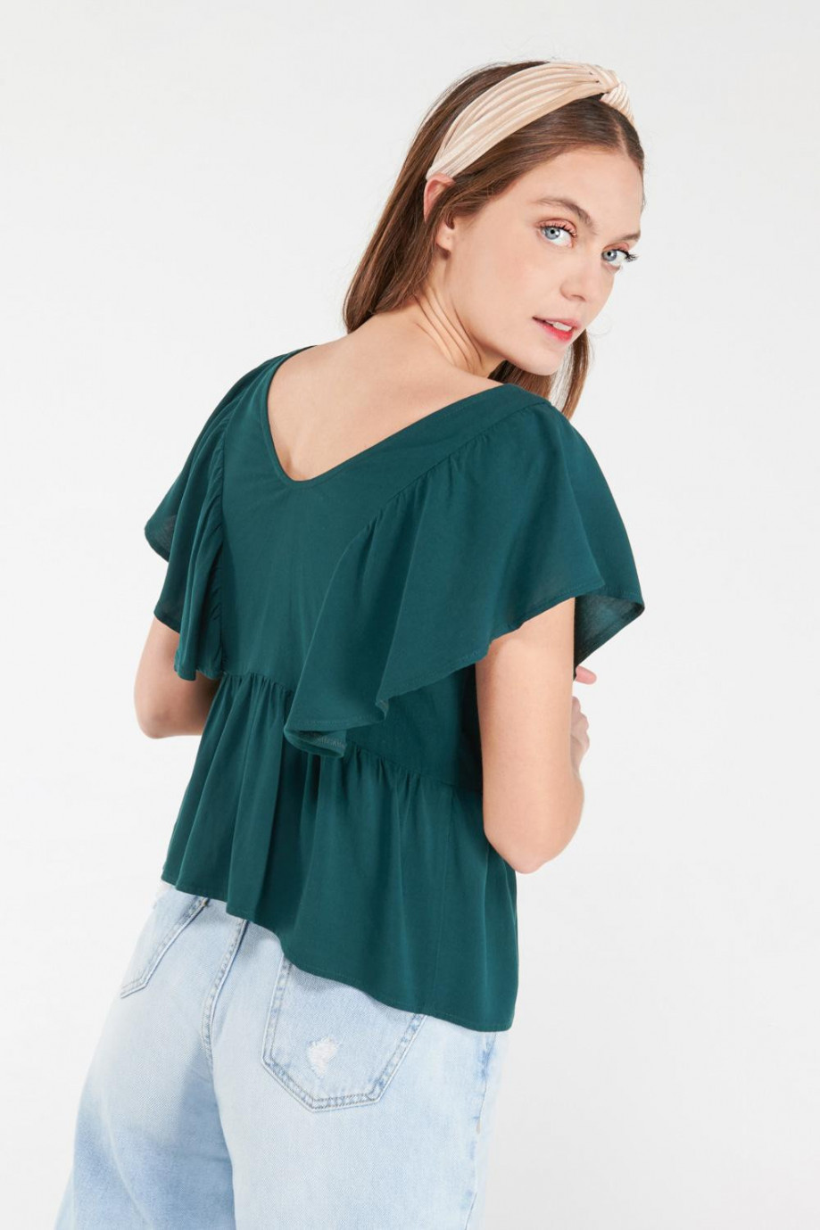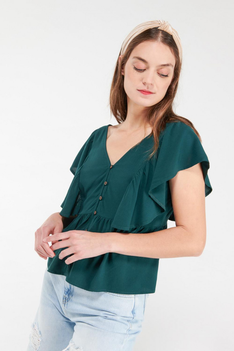 Blusa unicolor en tela fluida, frente con arandelas, escote en V y abotonadura en frente.
