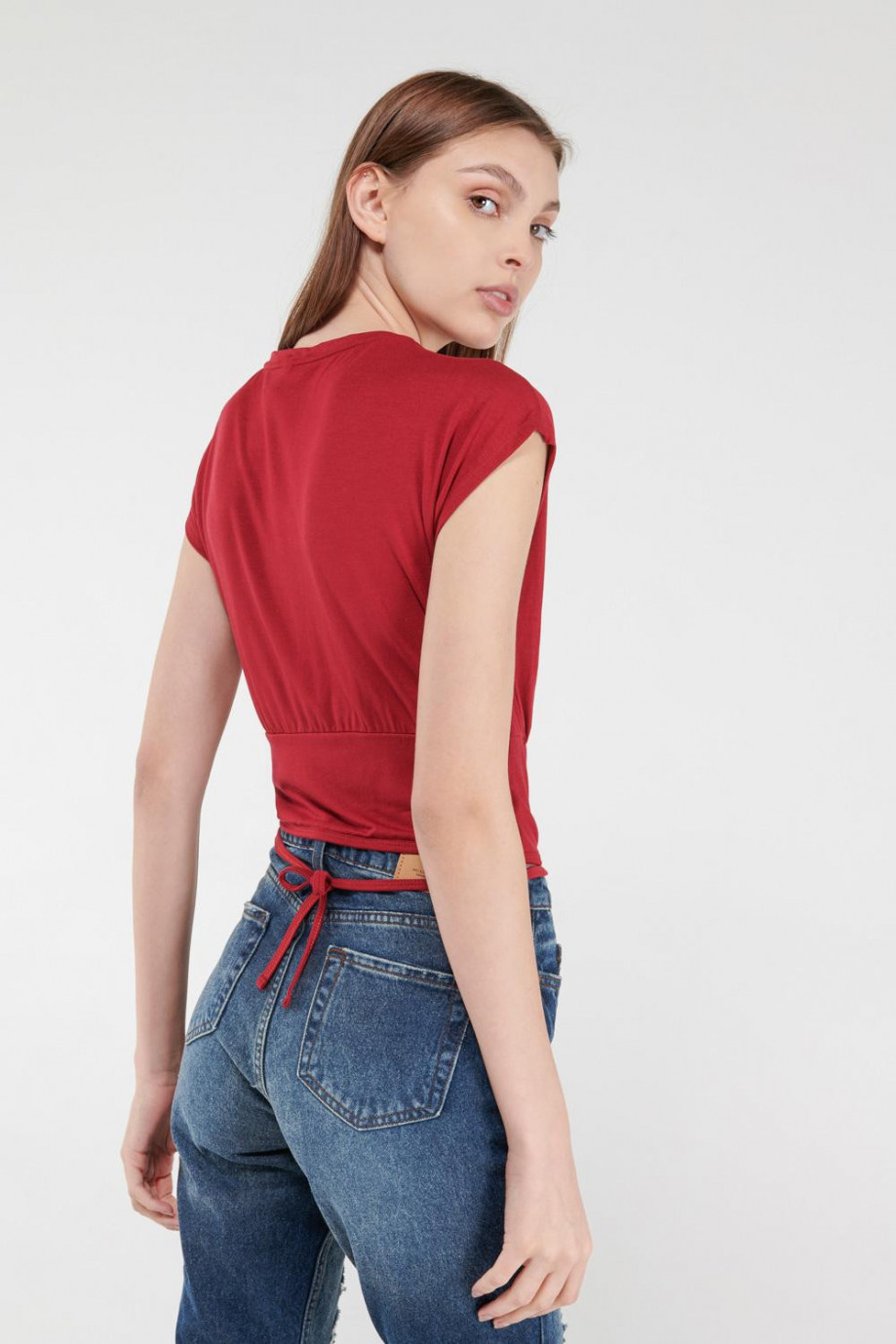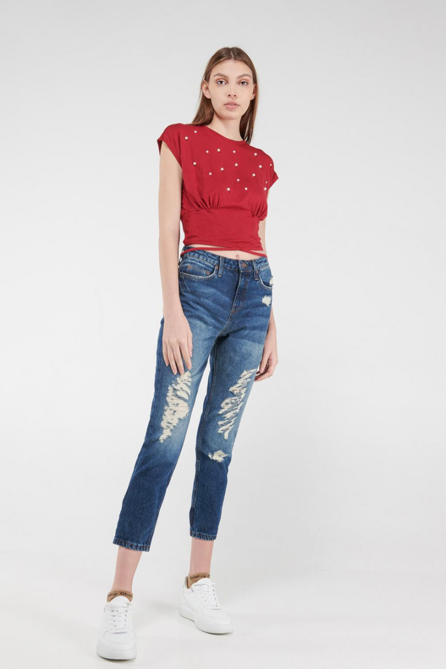 Camiseta para mujer manga corta con tirantas en cintura para anudar, perlas en frente, unicolor.