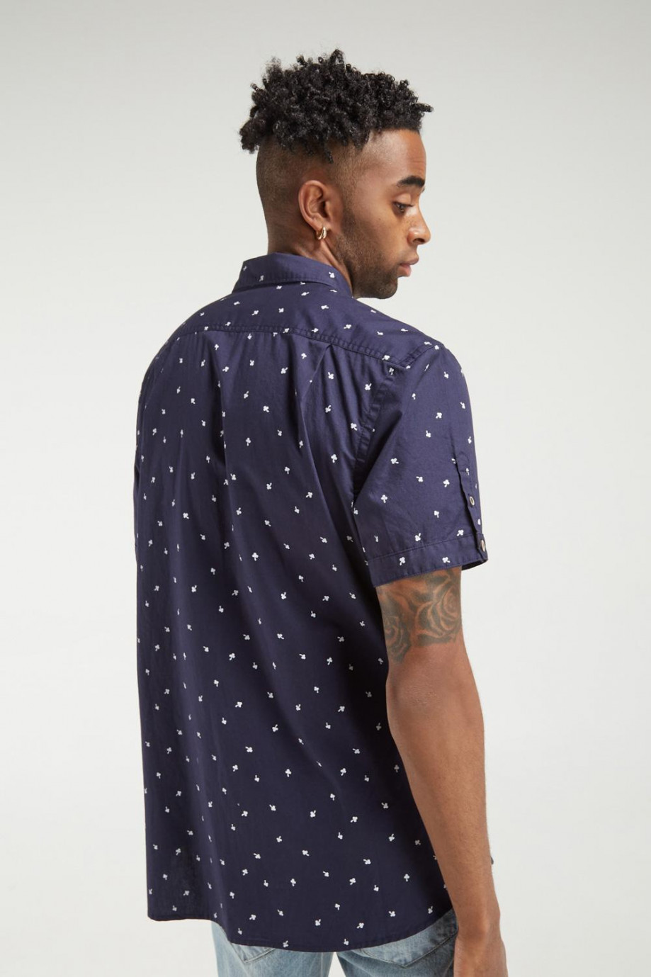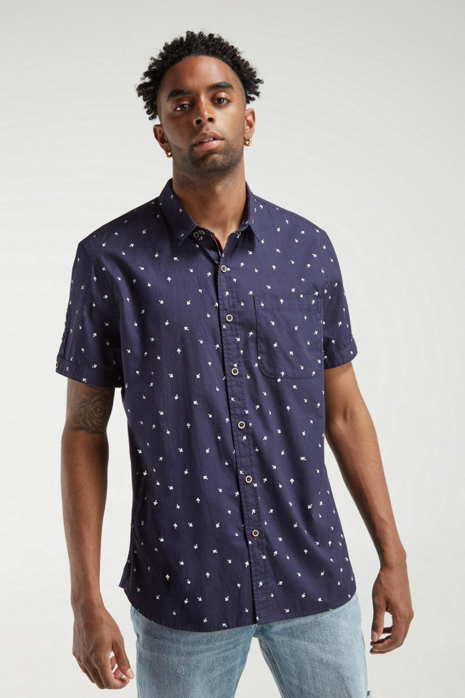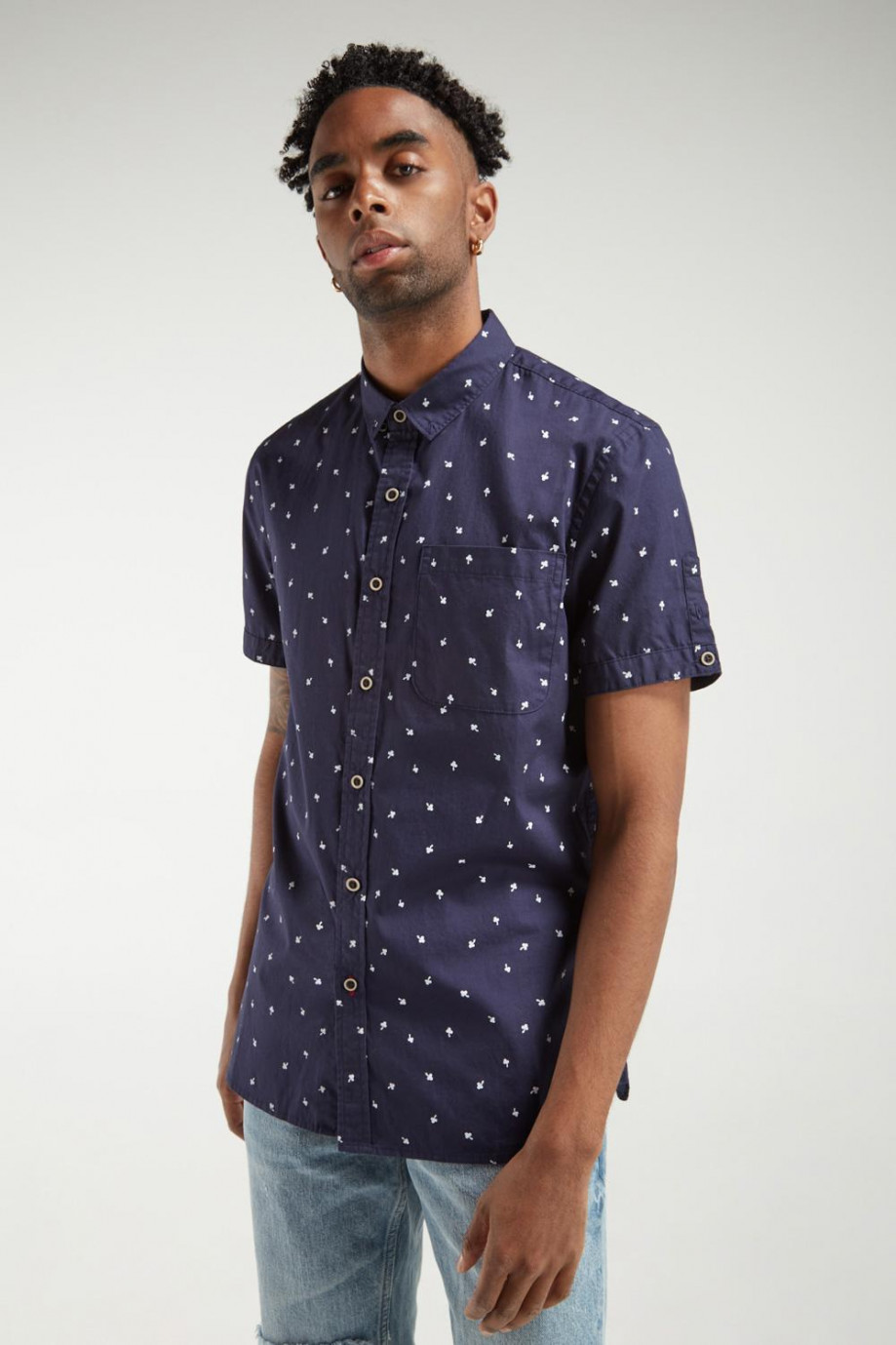 Camisa cuello button down, en tela con estampación mini print, manga corta con detalle de abertura en mangas y botonadura en frente