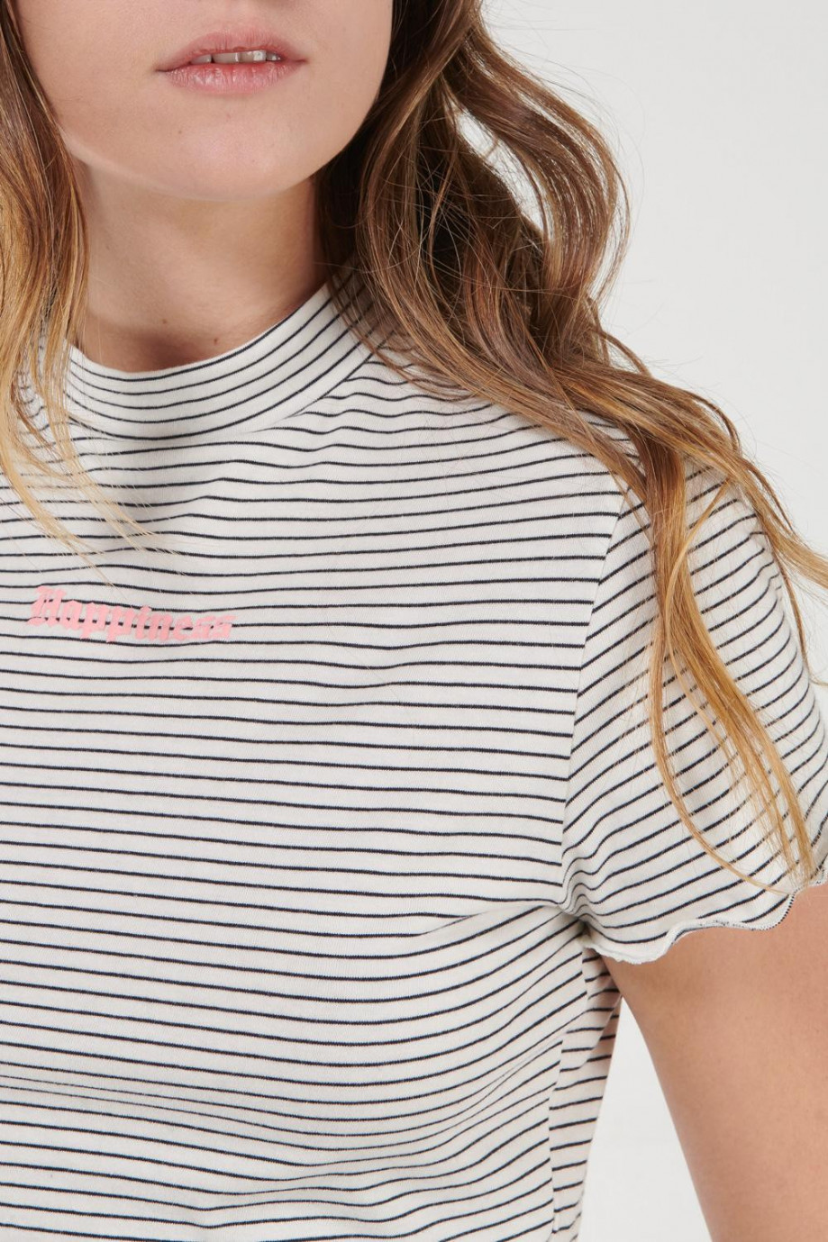 Camiseta, en rayas y estampado en frente.