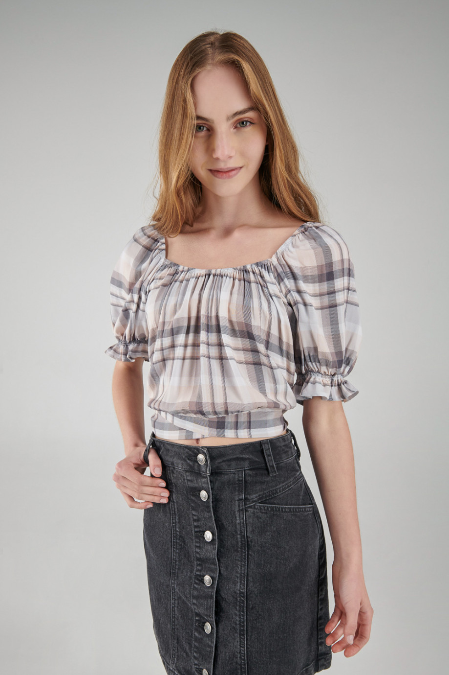 Blusa en tela fluida a cuadros con elástico en frente y hombros, anudado en espalda.