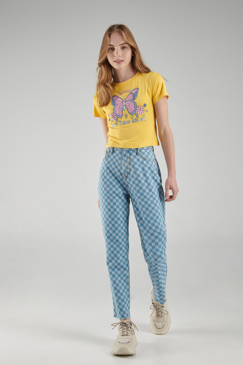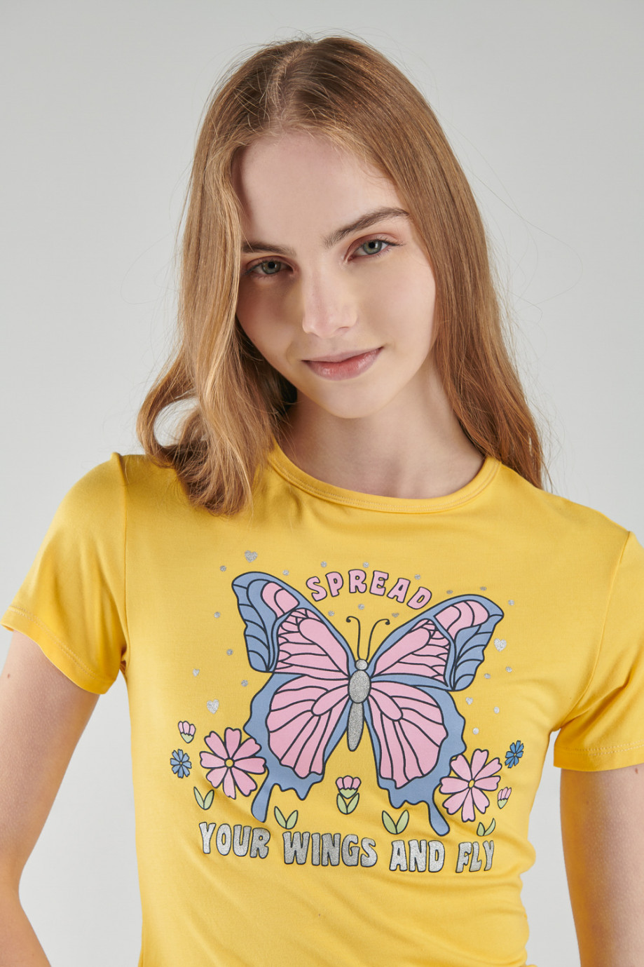 Camiseta, para mujer manga corta, con puños en tono contraste y estampado en frente