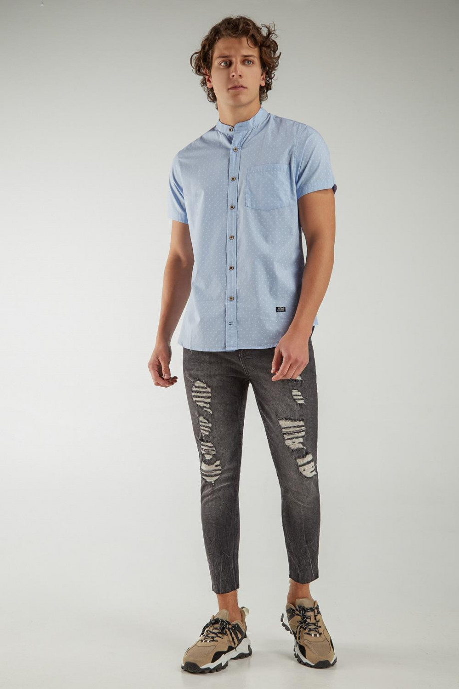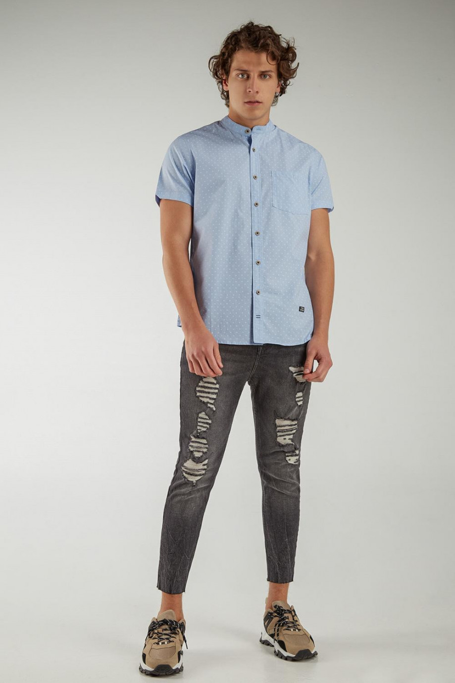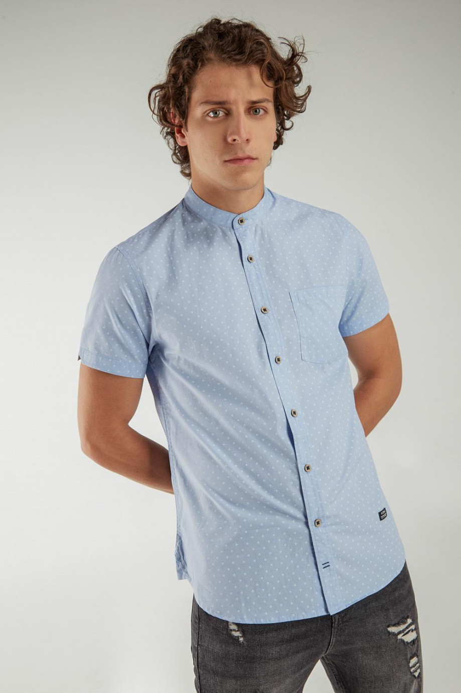 Camisa cuello mao, en tela con estampación mini print, manga corta con un bolsillo y botonadura en el frente.