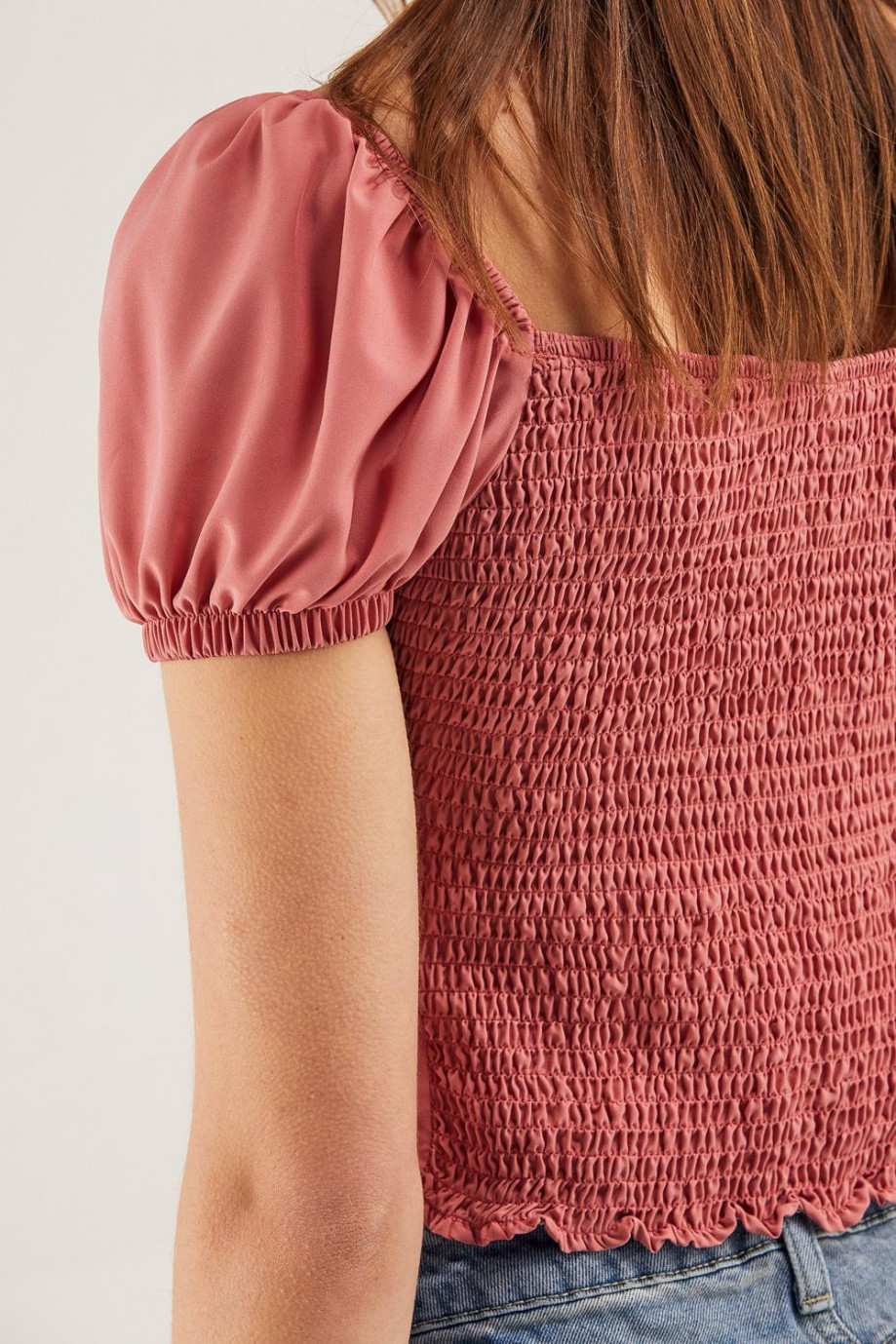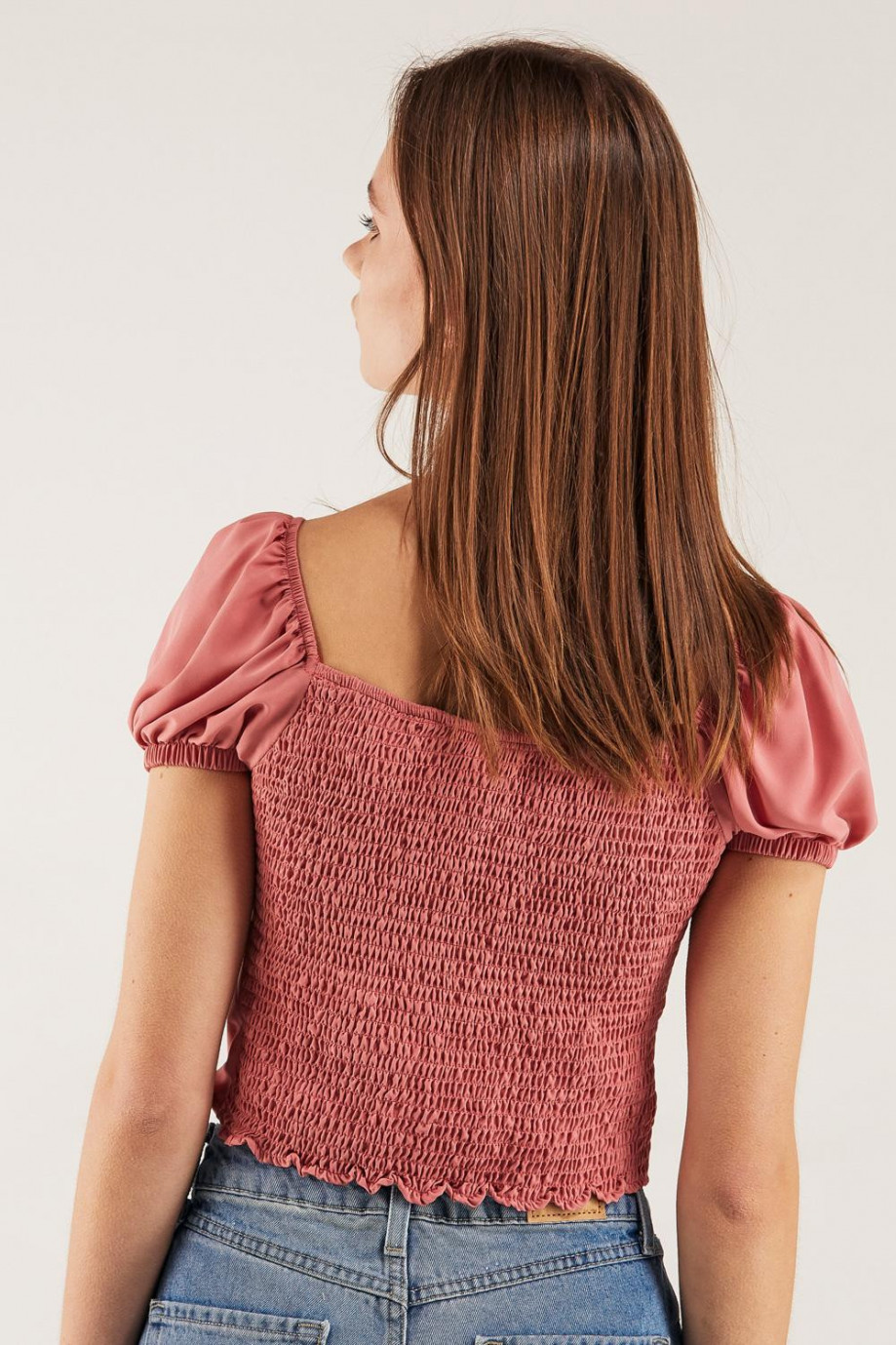 Blusa unicolor manga crota en tela fluida con elástico en contorno de cuello y espalda.