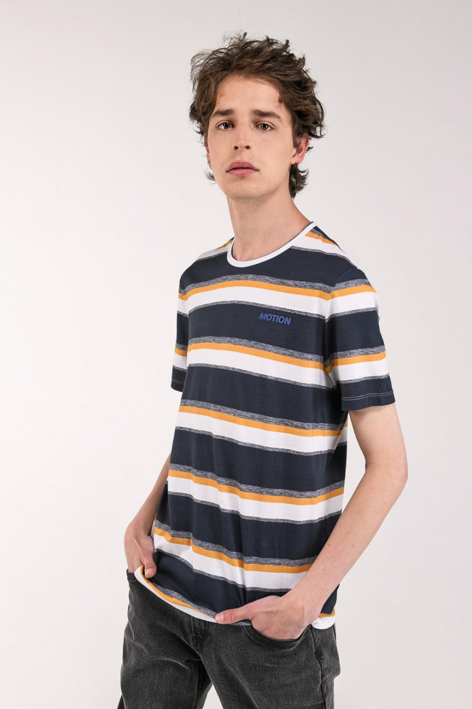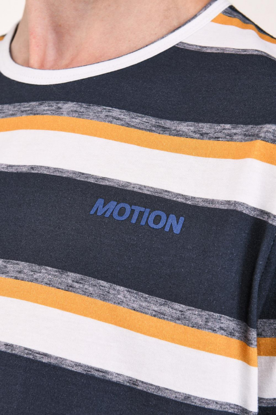 Camiseta manga corta para hombre con estampado continuo y texto localizado.