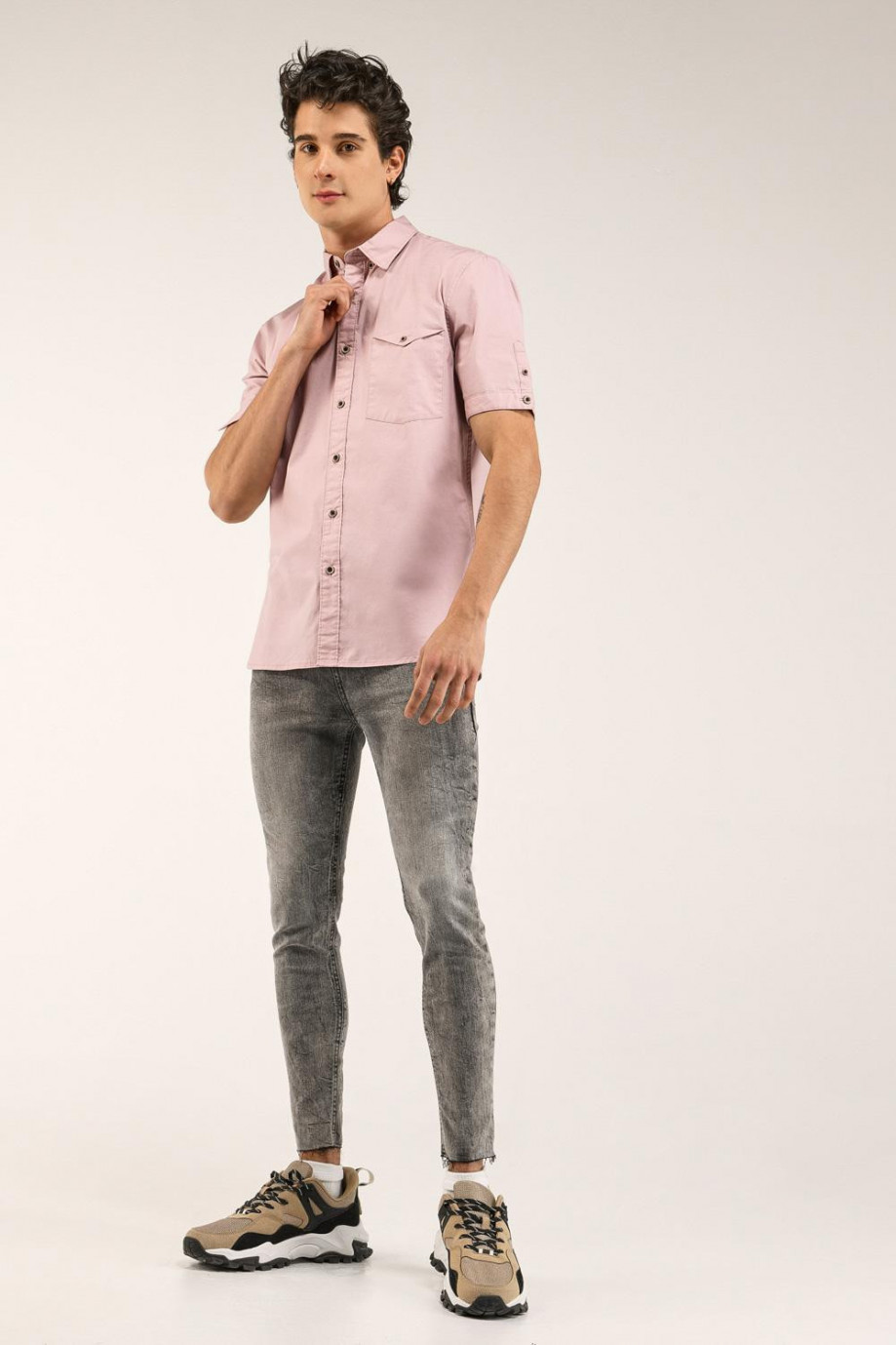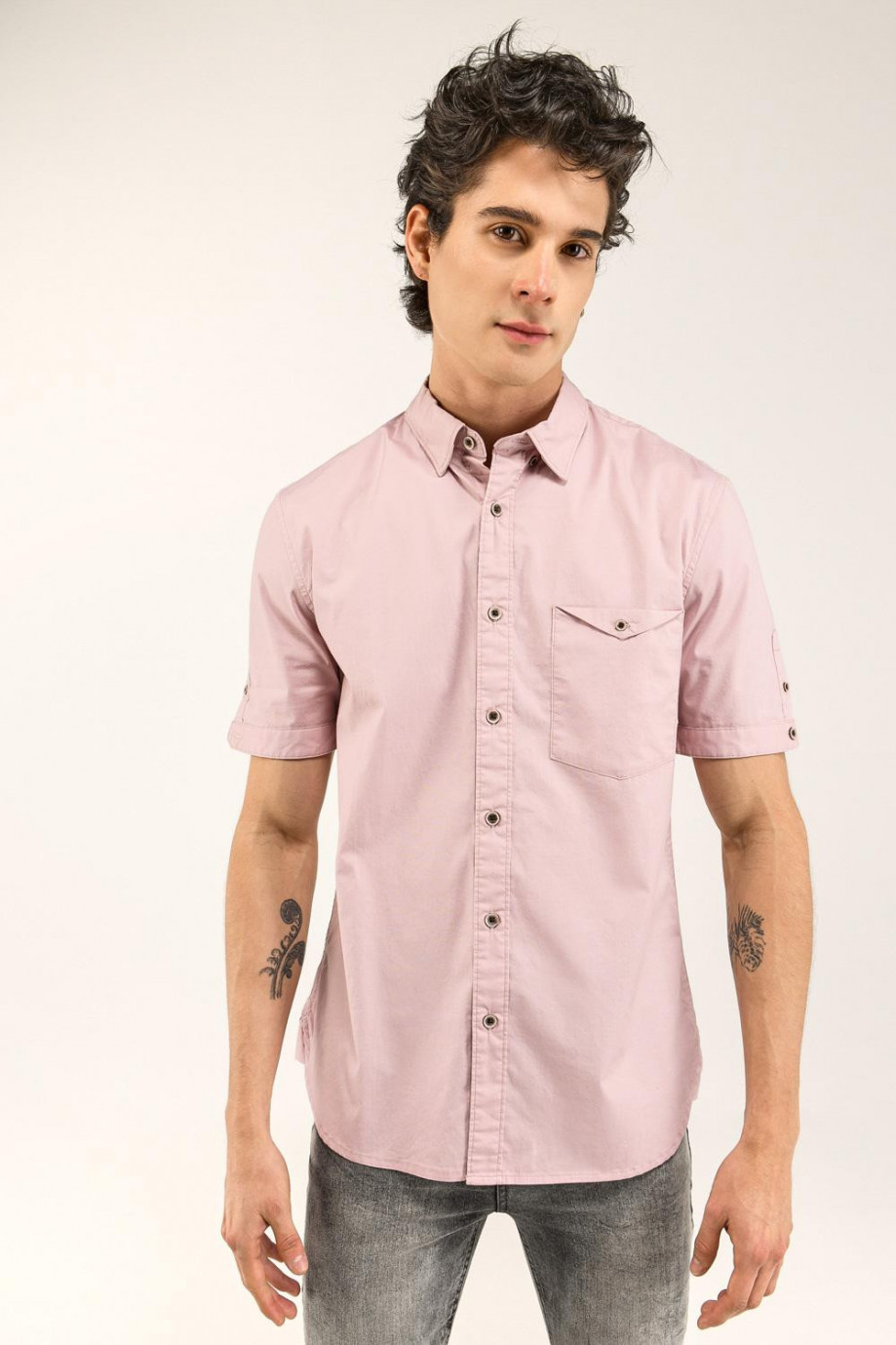 Camisa para hombre unicolor, con botones en cuello no visibles, silueta ajustada con pinzas de entalle.