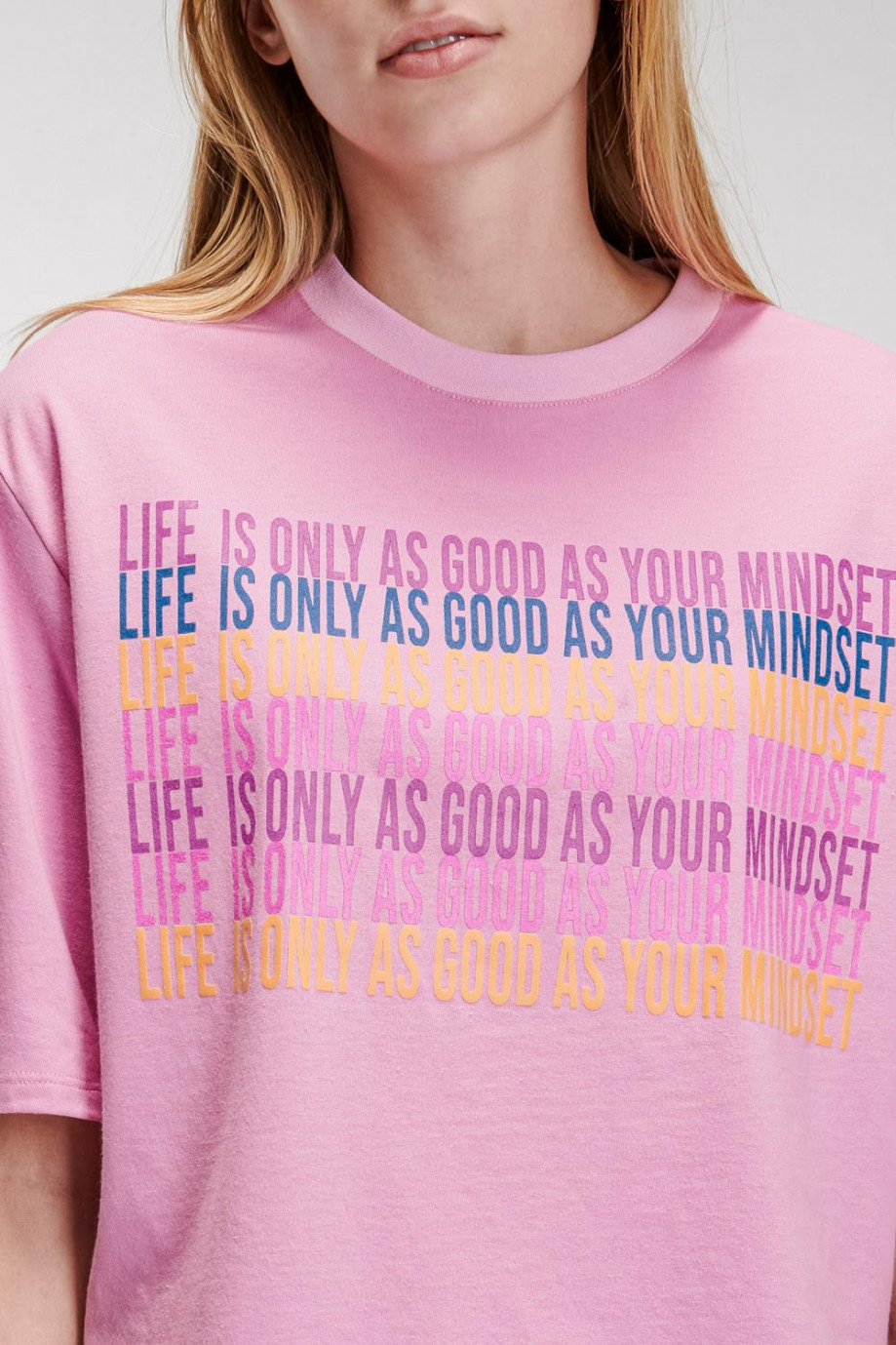 Camiseta cuello redondo para mujer, manga corta con estampado en frente.