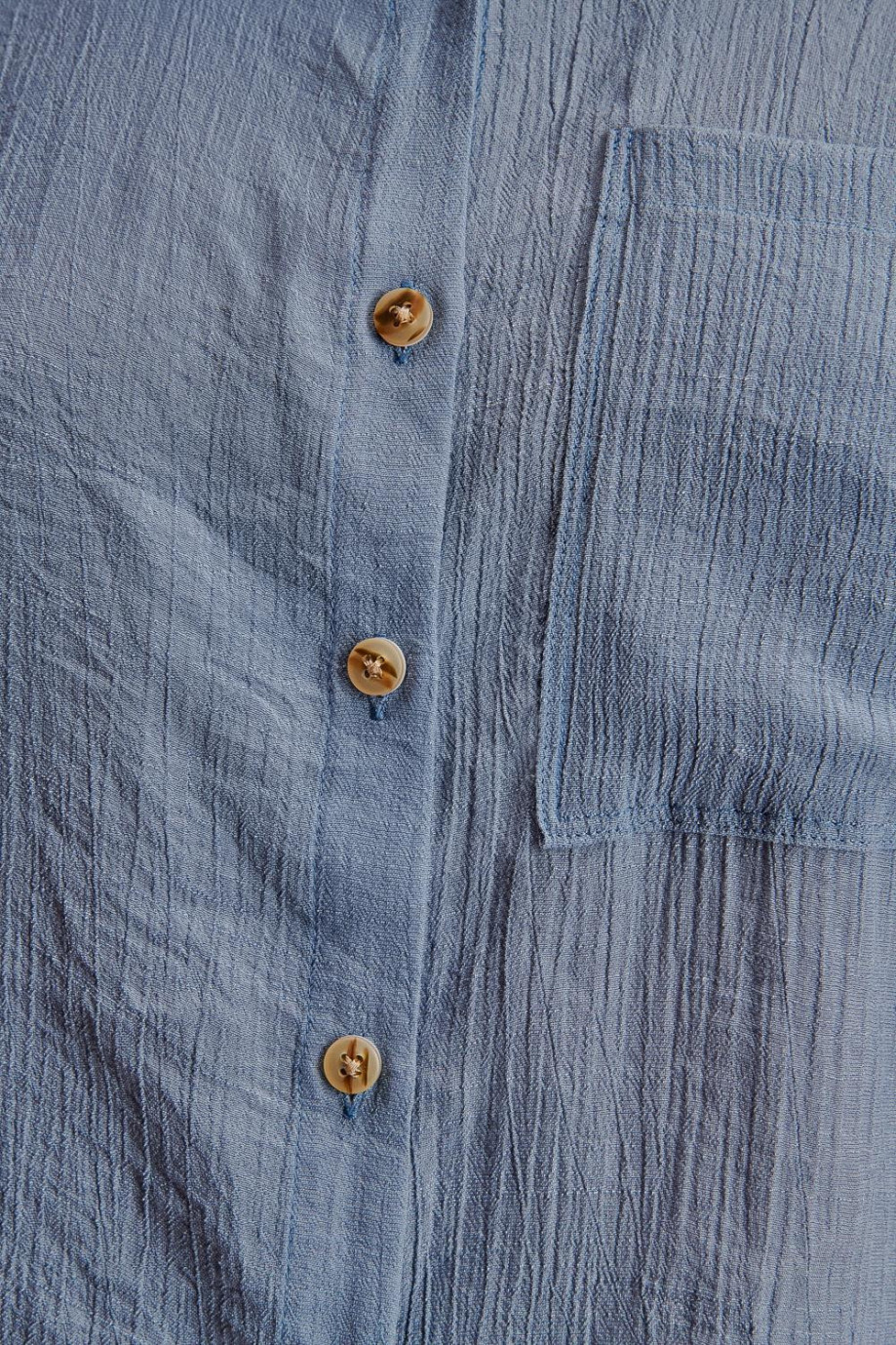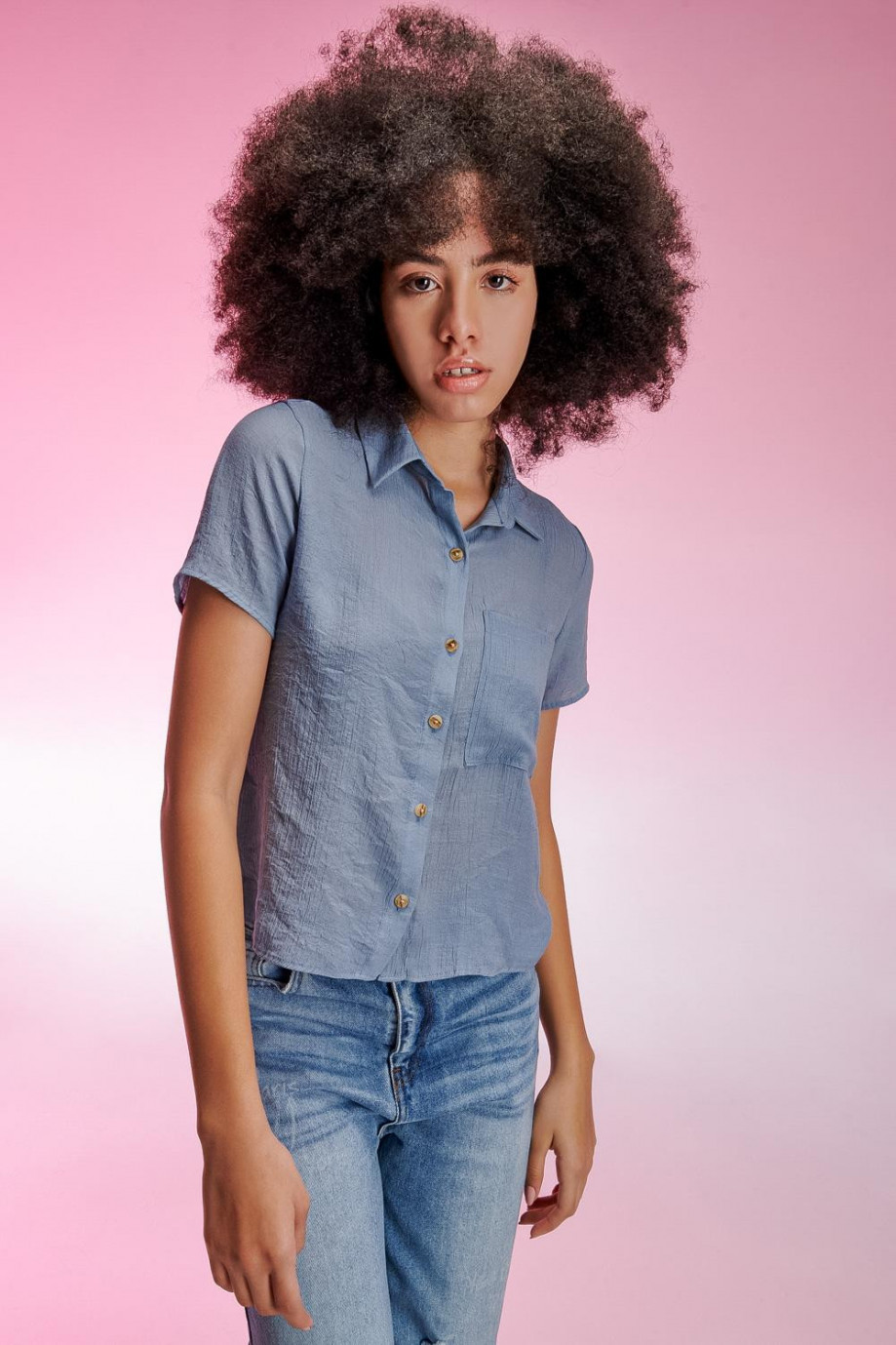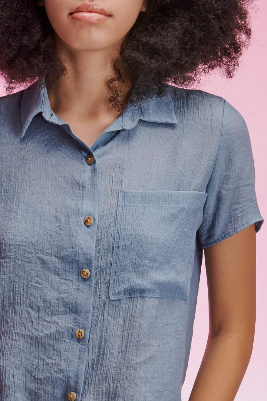 Blusa camisera unicolor, en tela fluida con doble bolsillo abertura en costados, abotonadura en frente.