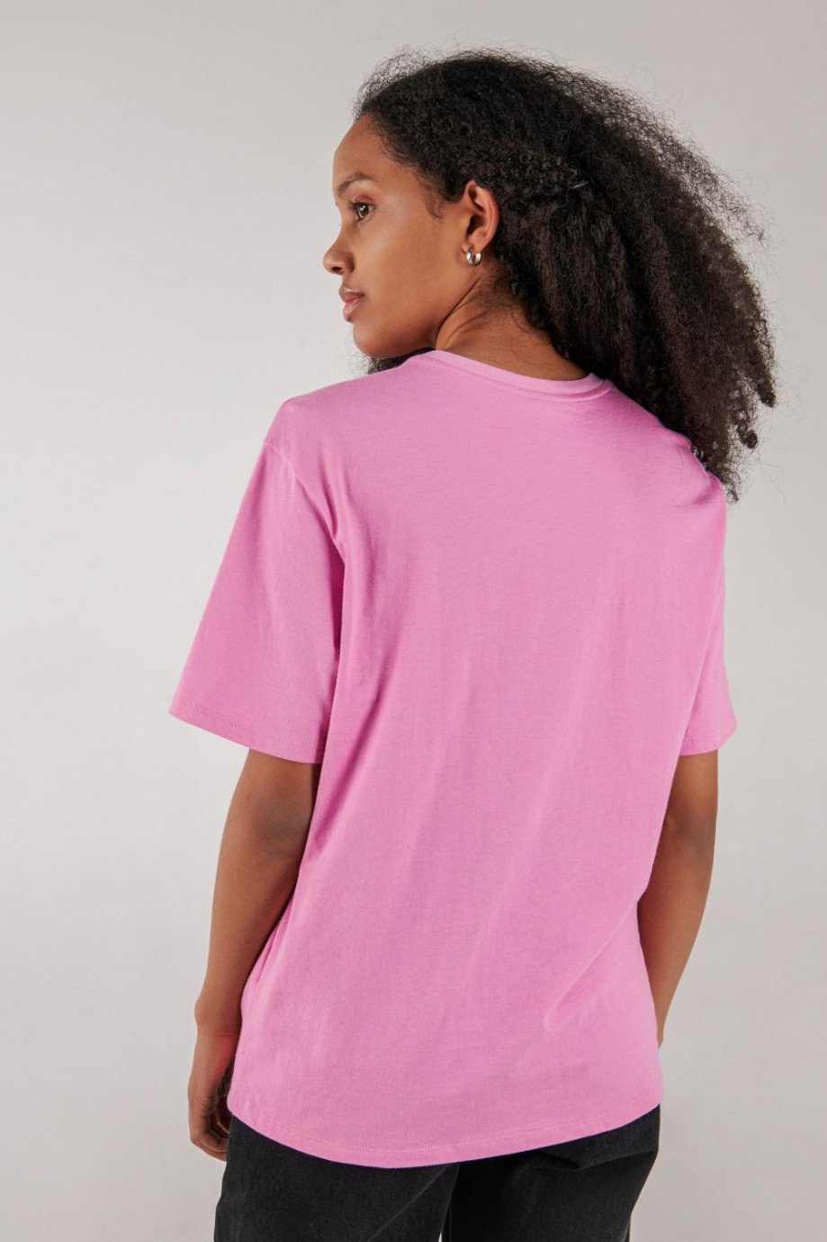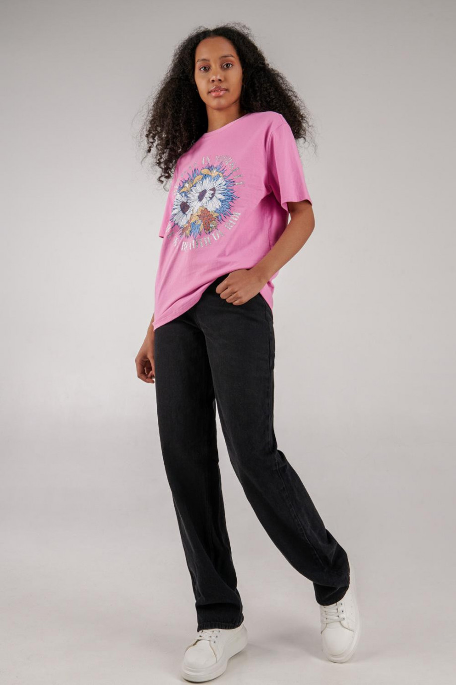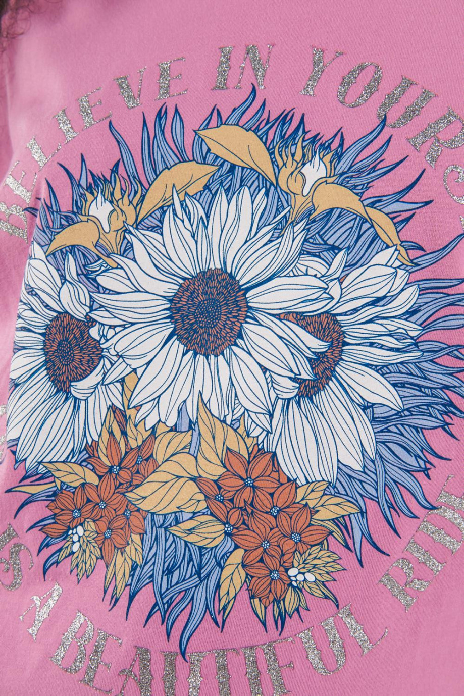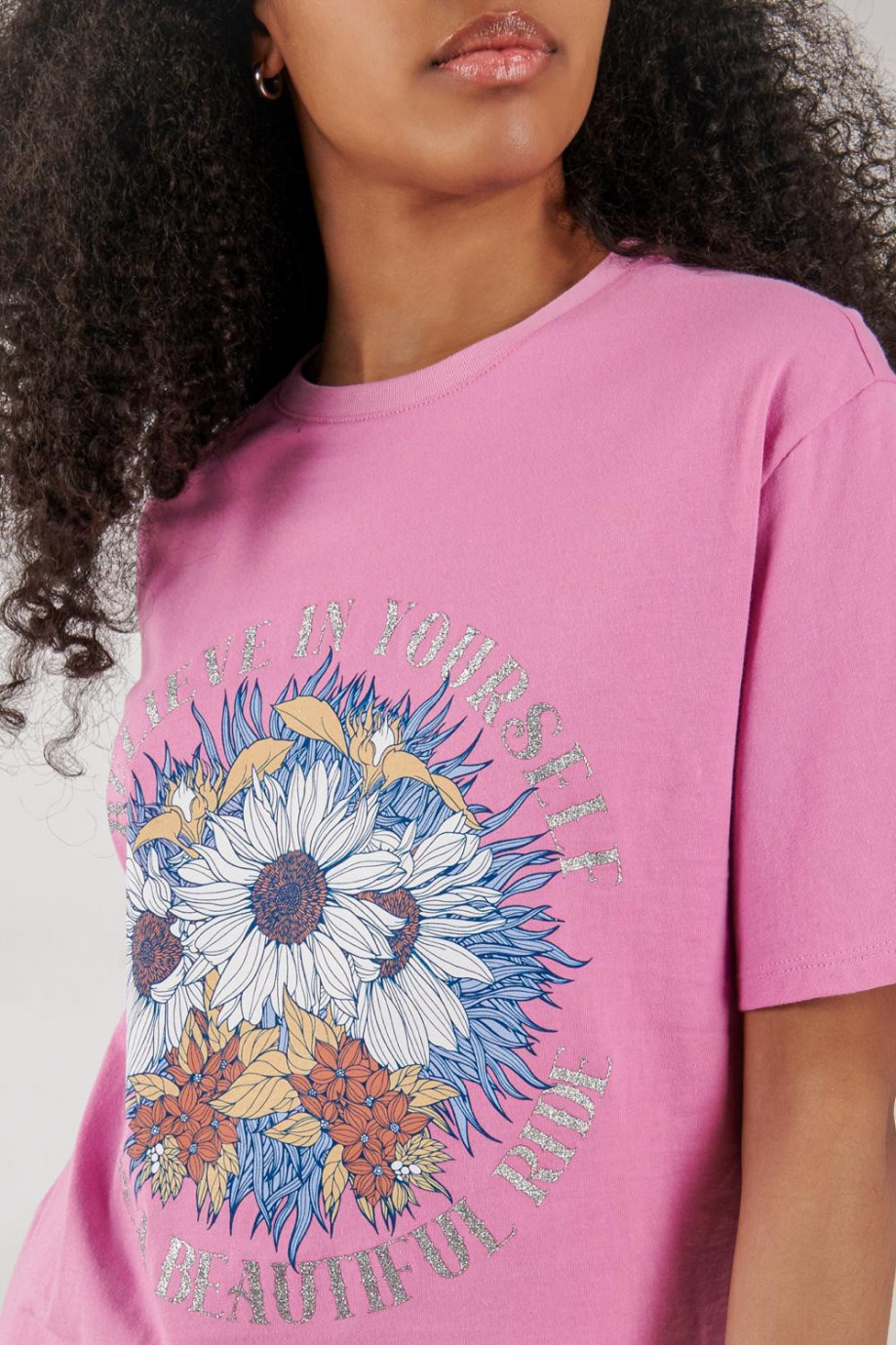 Camiseta básica para mujer en colores vivos, manga corta, estampada con flores y detalles de brillo.