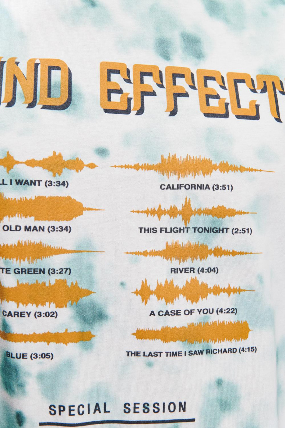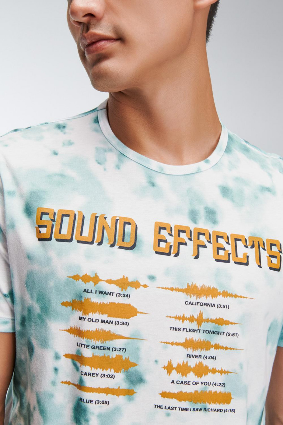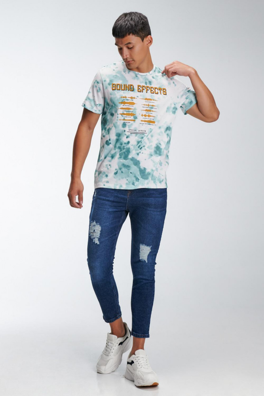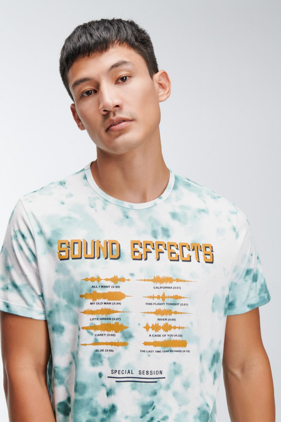 Camiseta manga corta para hombre con estampado continuo y texto localizado.
